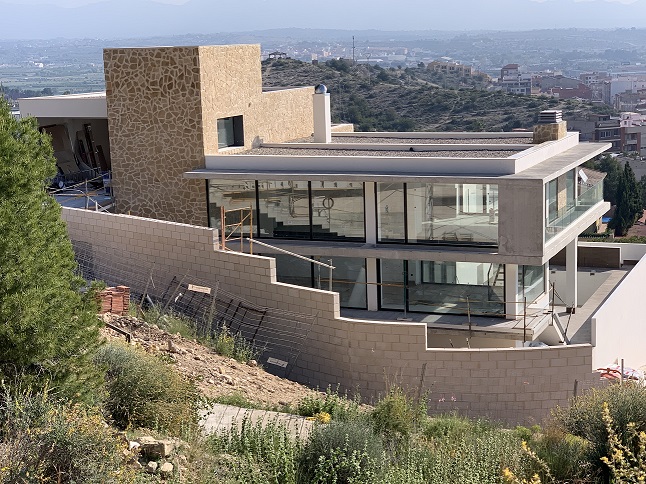 Ejecución de Vivienda Unifamiliar Aislada en Benaguacil. Vivienda singular cuya volumetría se adapta al terreno situado a los pies de la montaña en cuya cima se encuentra el santuario de Nuestra Señora de Montiel. Vivienda formada por cuatro cuerpos a diferente altura en los que la zona de día está localizada en la planta primera y las zonas de noche en las plantas bajas. Todo ello con iluminación natural procedente de los grandes ventanales ubicados al este y de dos patios acristalados en toda su longitud.