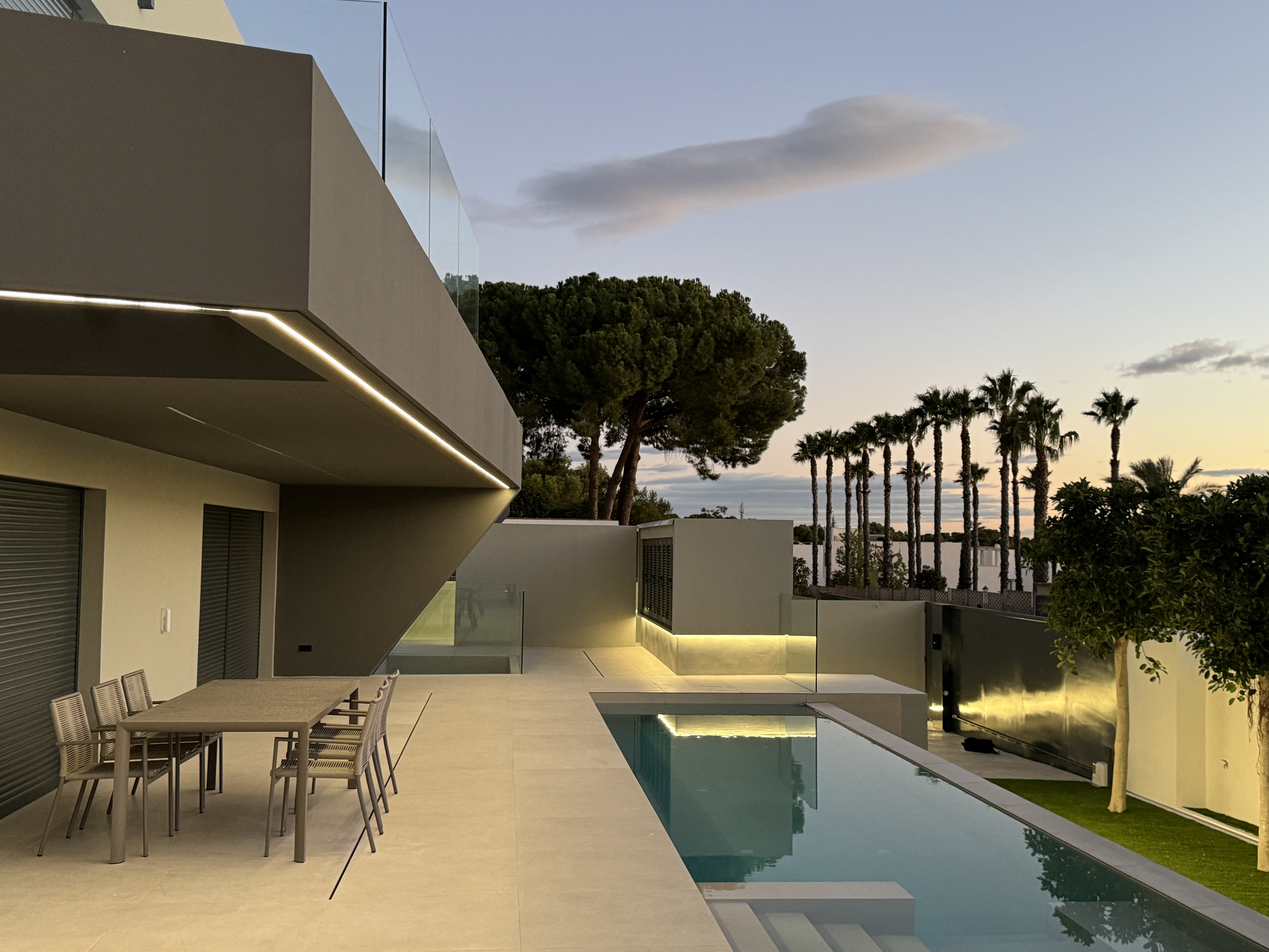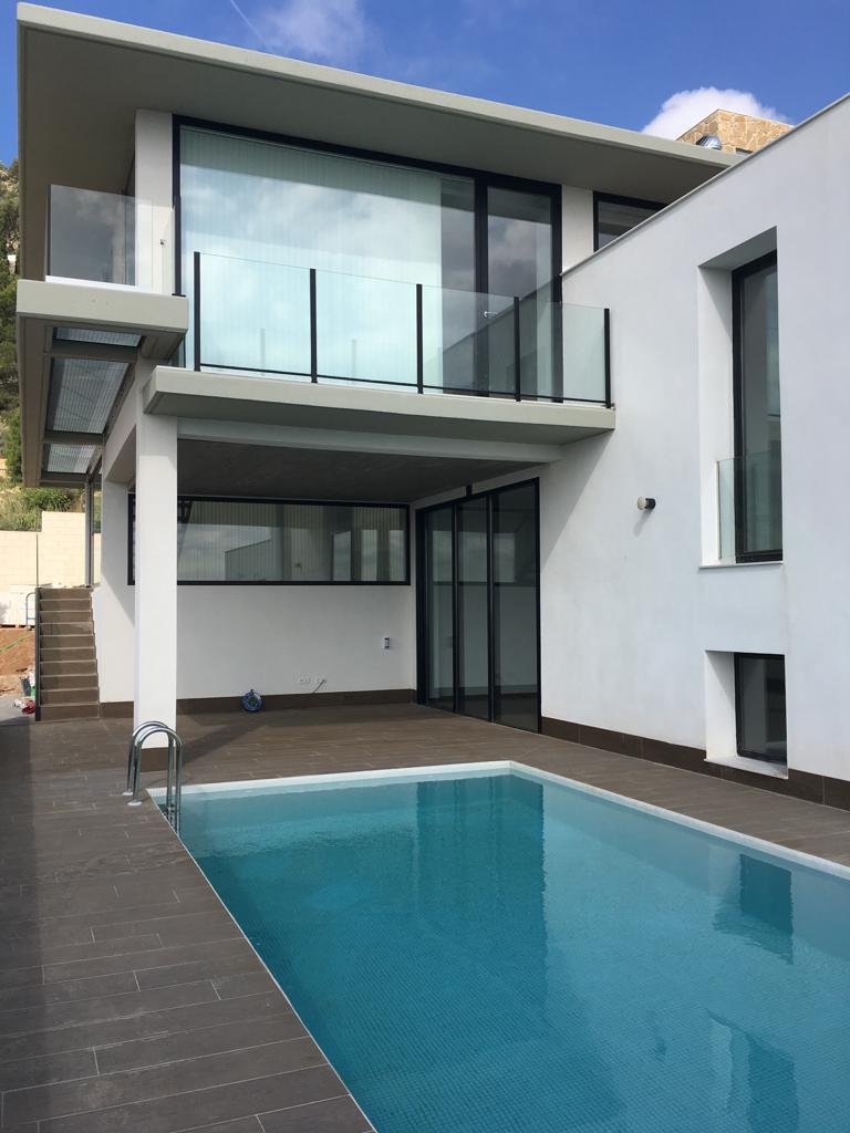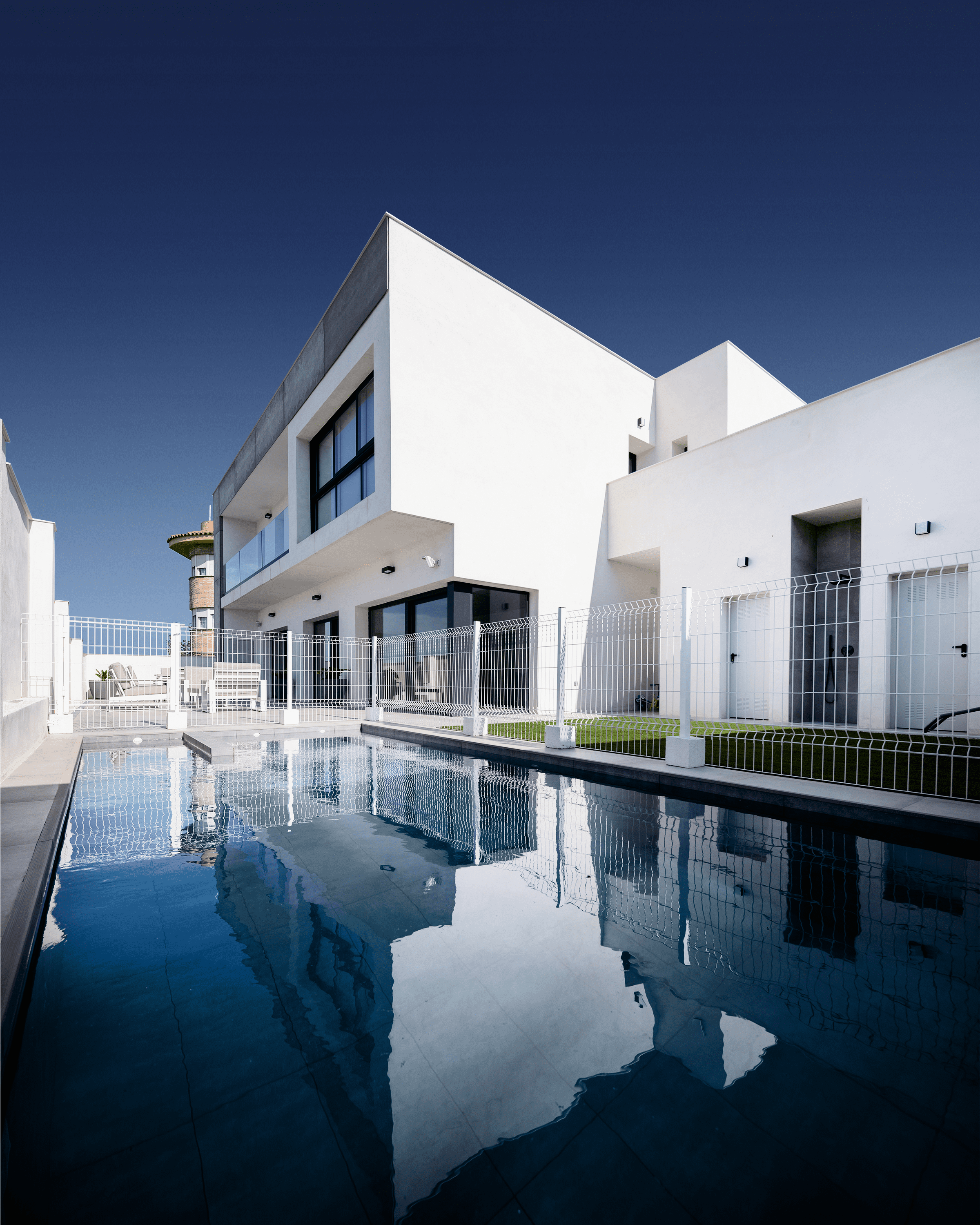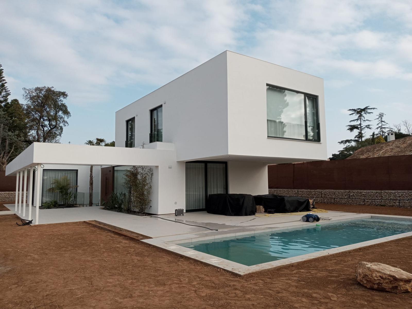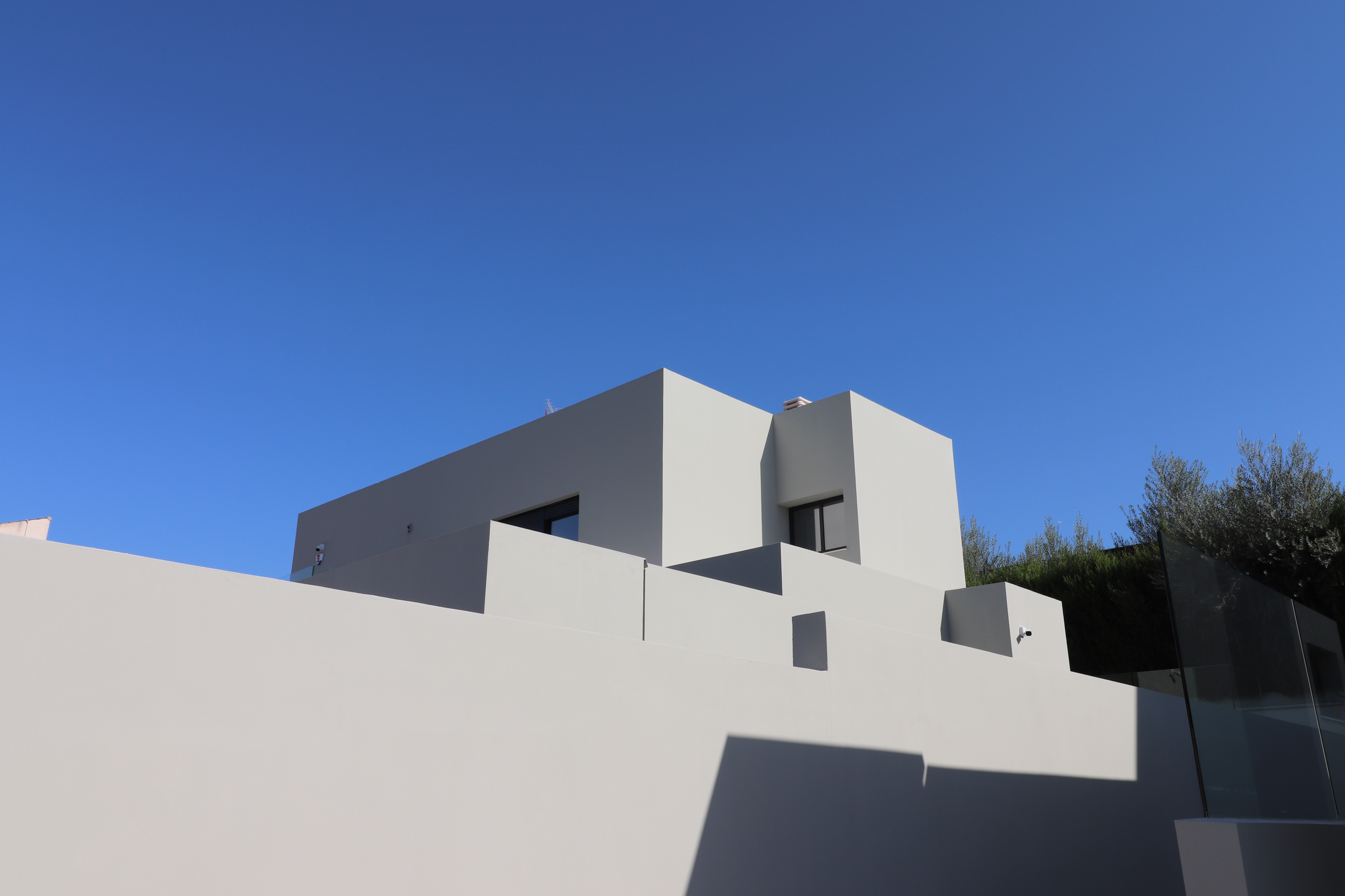 Cabe destacar el vuelo de alrededor de cinco metros correspondiente al dormitorio principal sobre la piscina. Toda la fachada es realizada con aislamiento térmico exterior revestida con mortero blanco, interrumpida con ventanales de aluminio en color gris antracita. La instalación de climatización y agua caliente sanitaria es suministrada a través de equipos de aerotermia para conseguir el mínimo consumo.