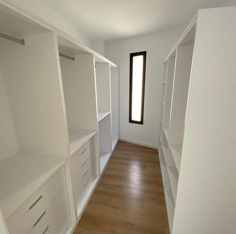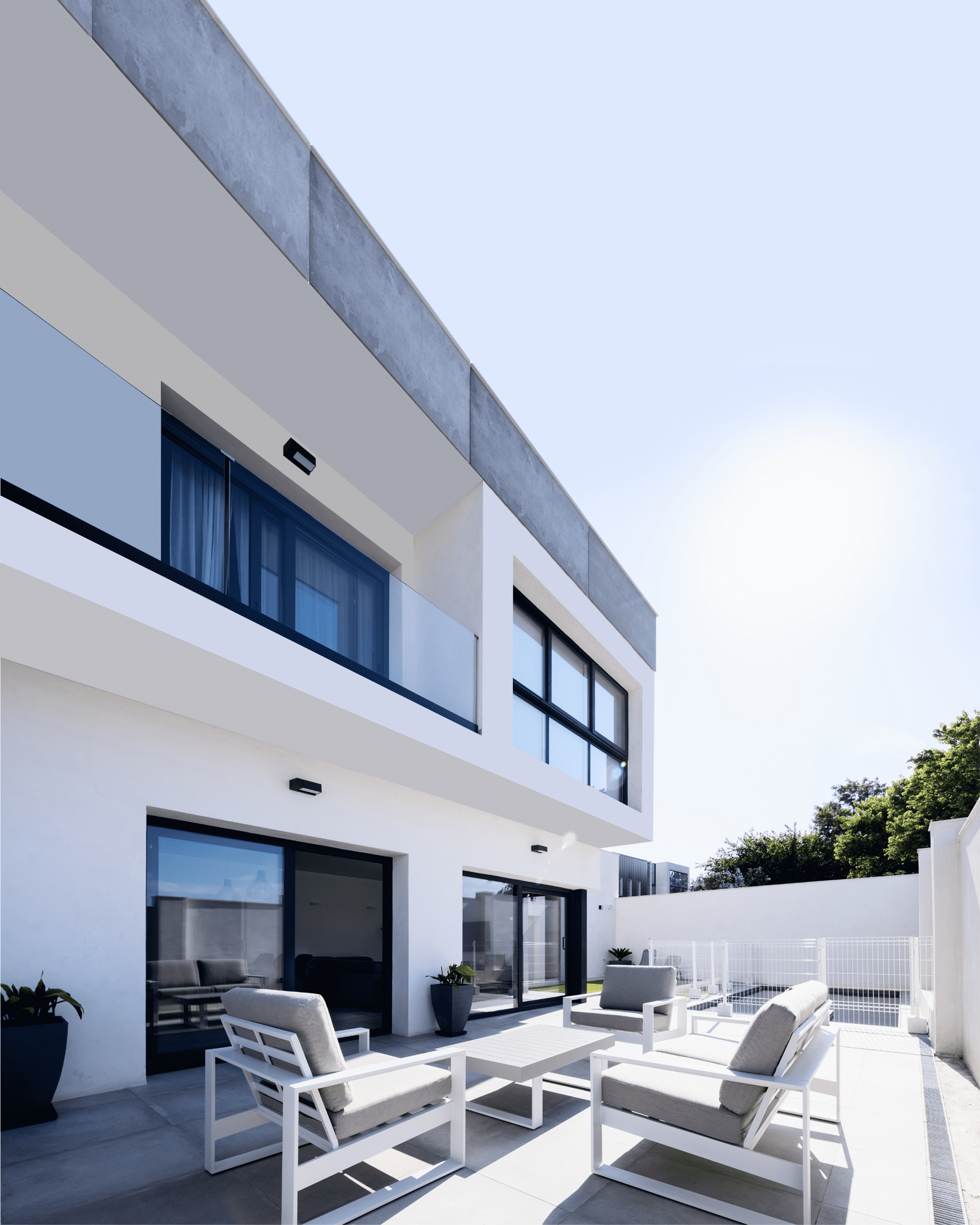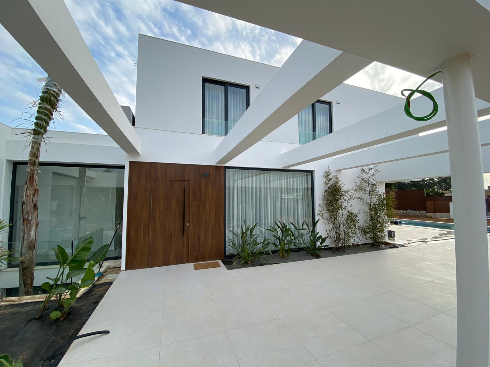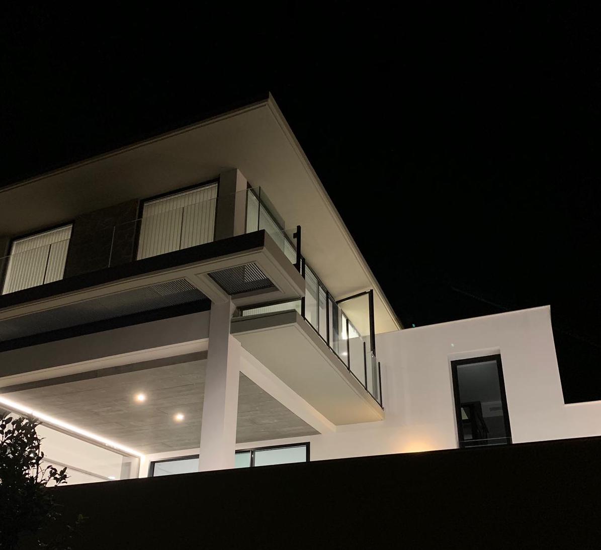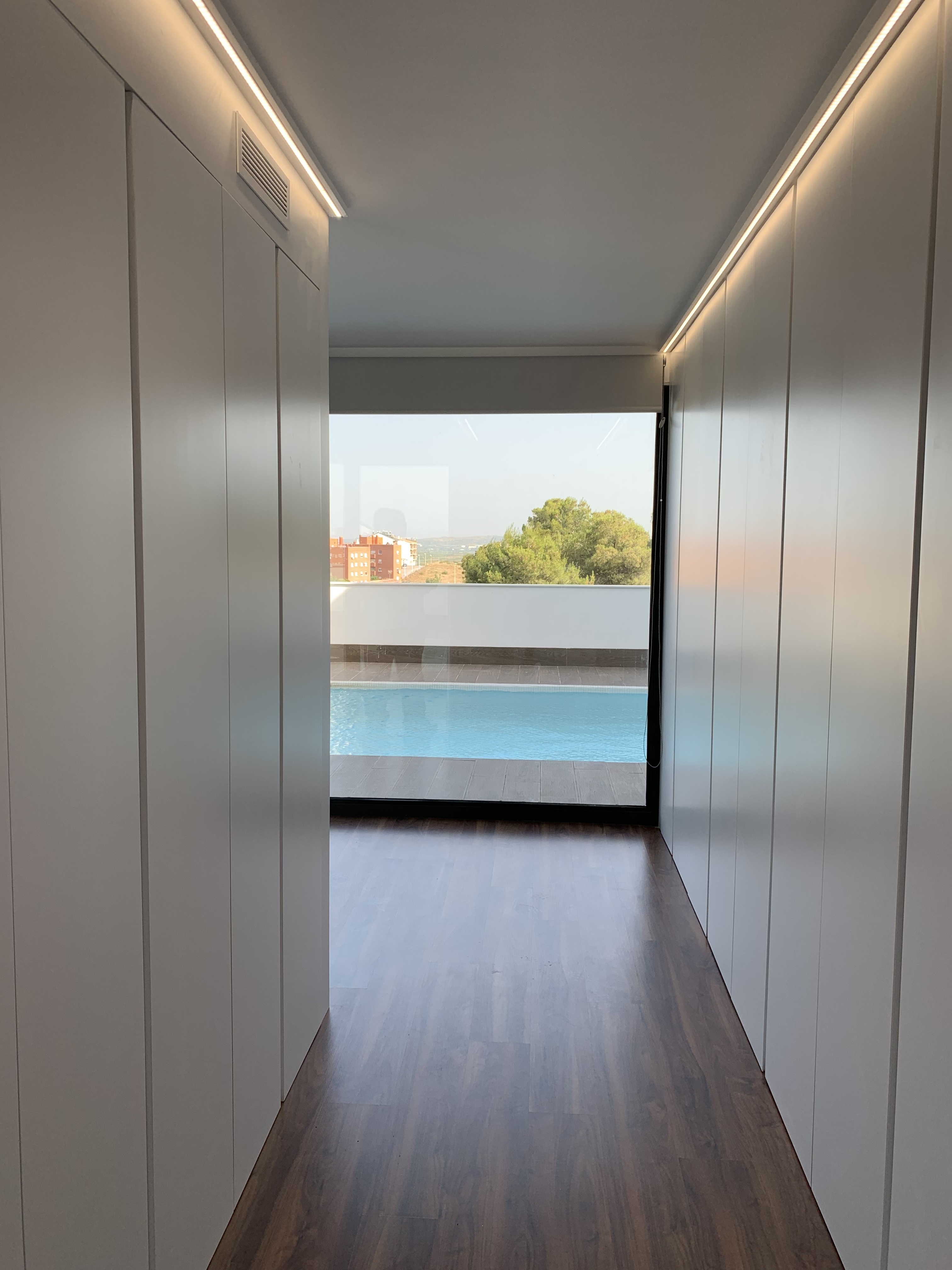 Cabe destacar el vuelo de alrededor de cinco metros correspondiente al dormitorio principal sobre la piscina. Toda la fachada es realizada con aislamiento térmico exterior revestida con mortero blanco, interrumpida con ventanales de aluminio en color gris antracita. La instalación de climatización y agua caliente sanitaria es suministrada a través de equipos de aerotermia para conseguir el mínimo consumo.