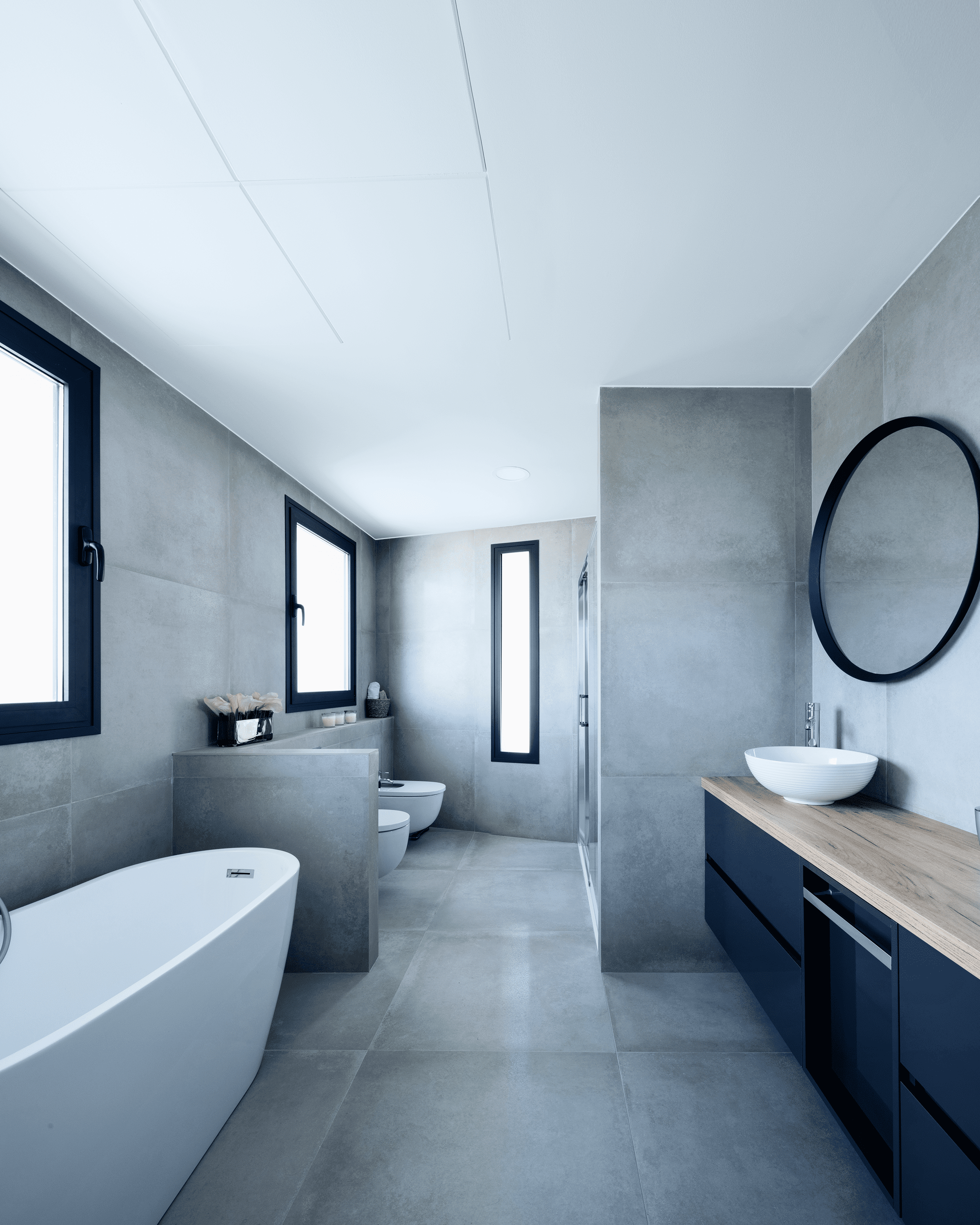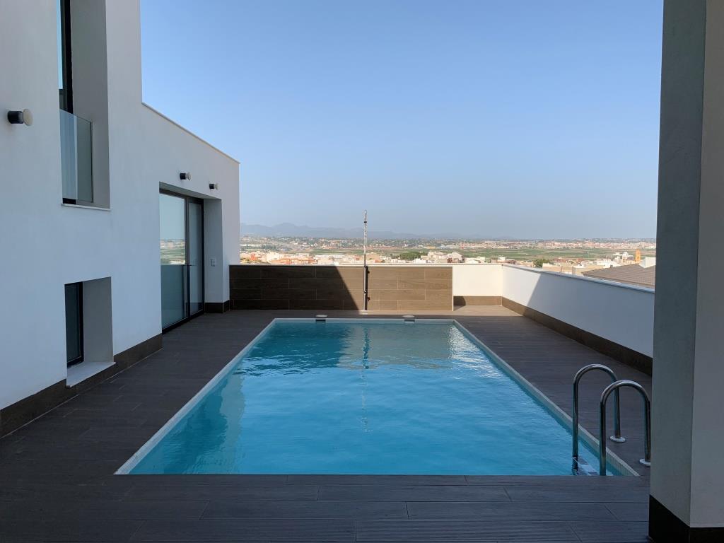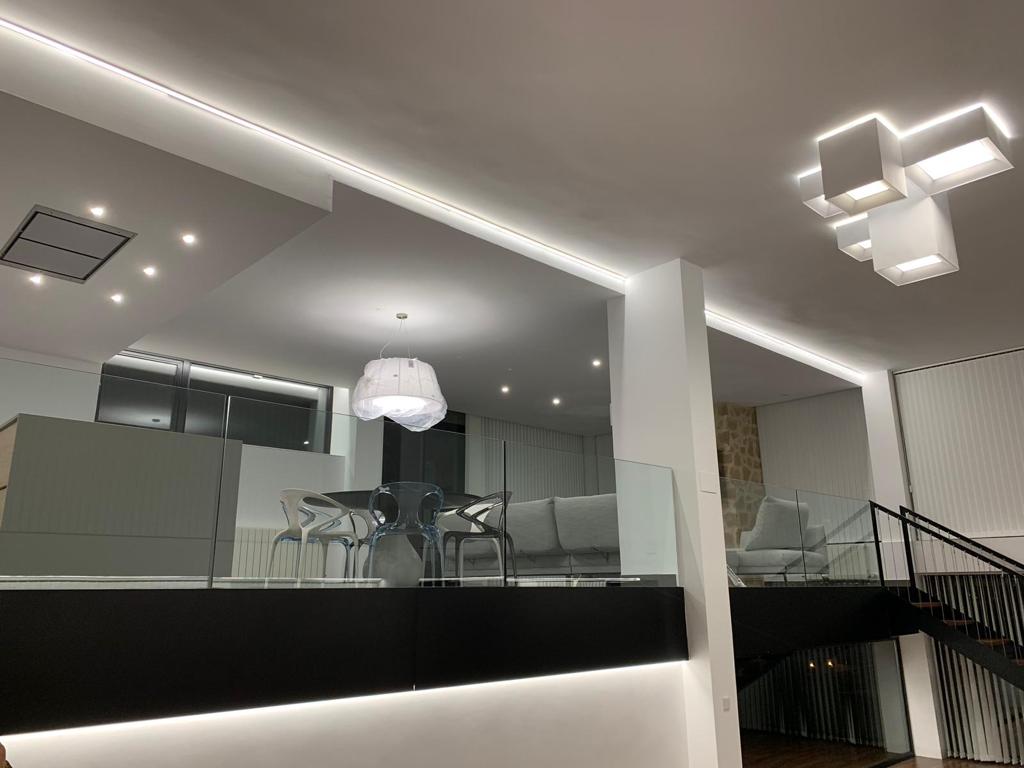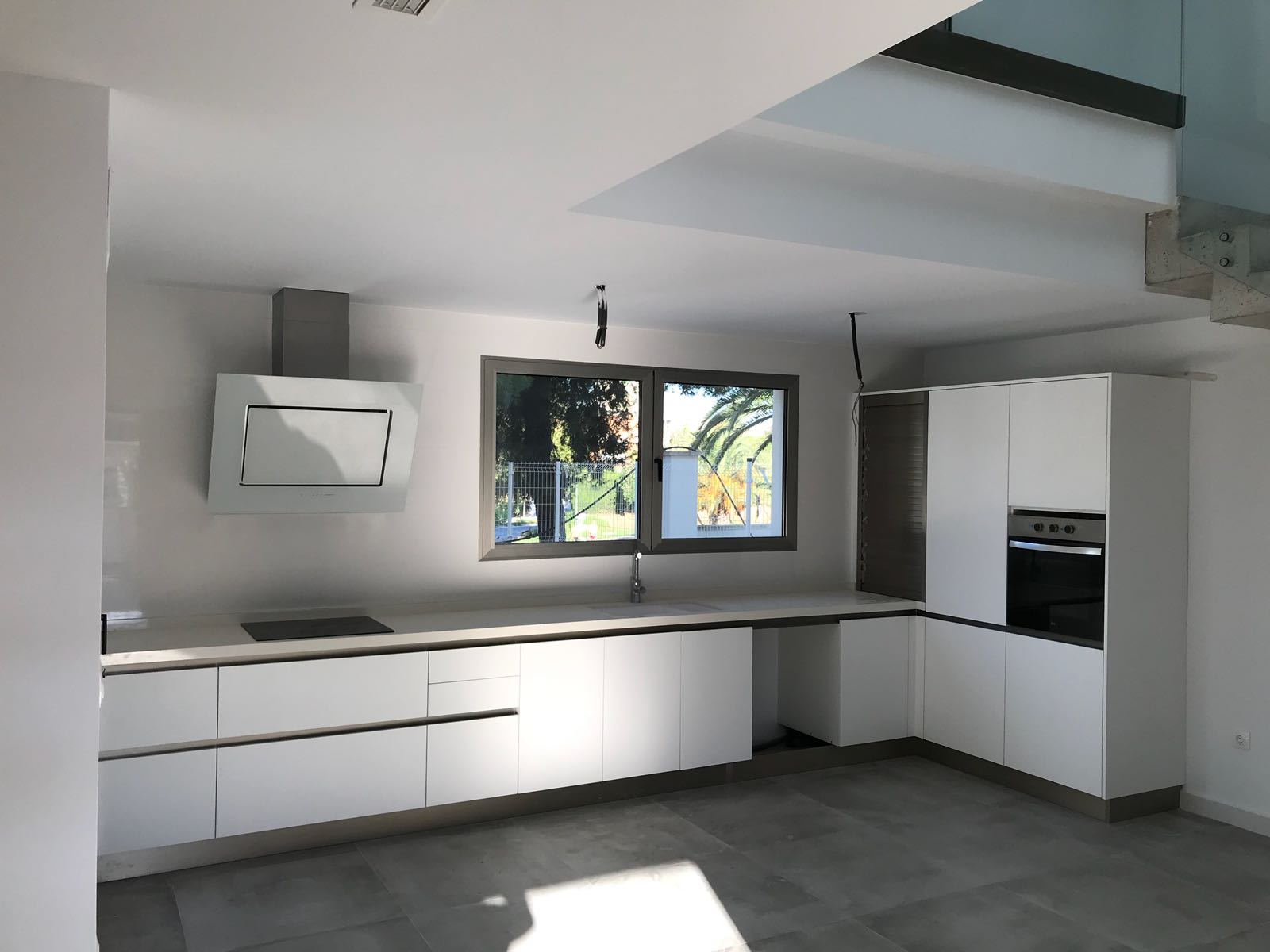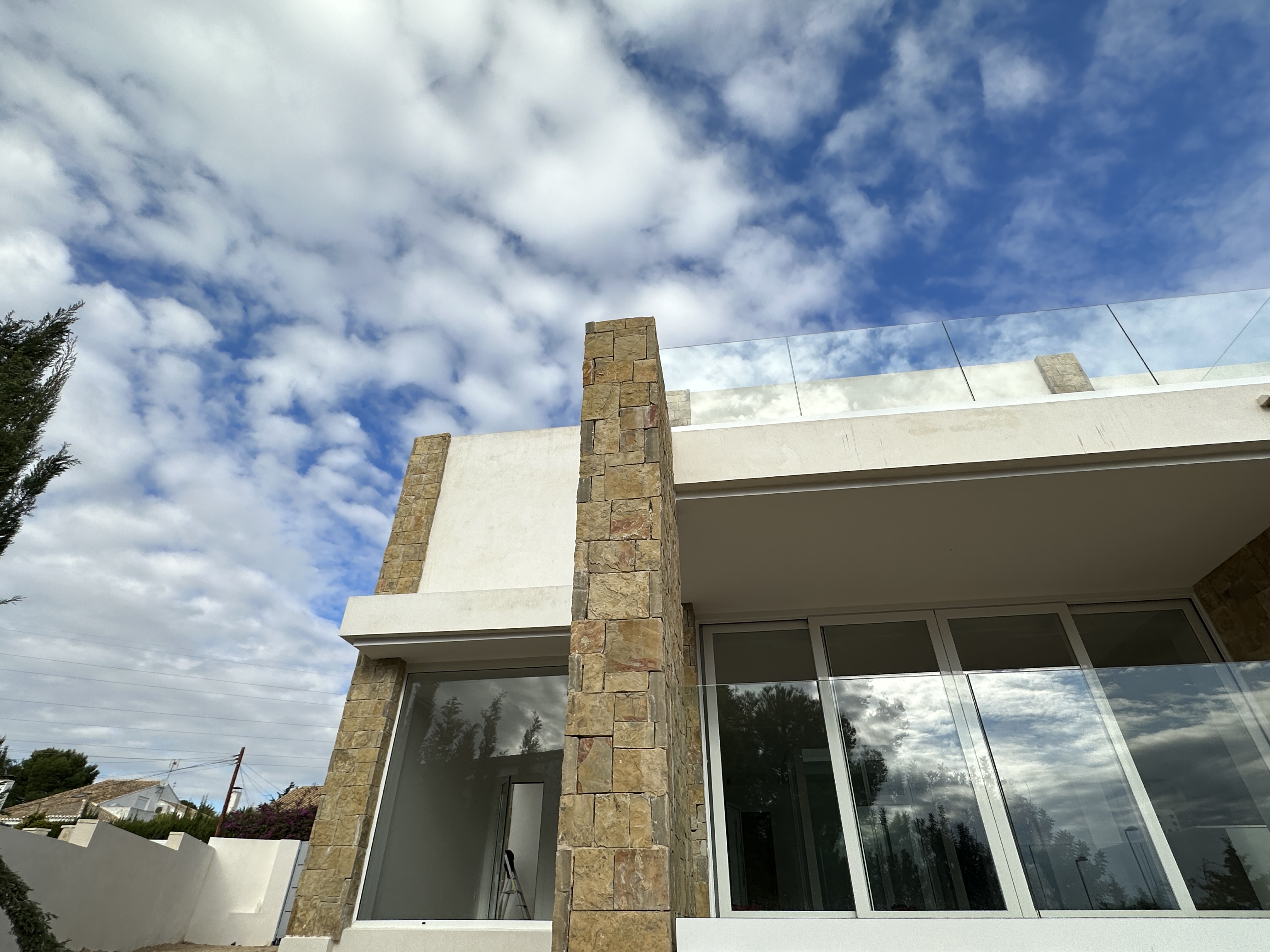 Cabe destacar el vuelo de alrededor de cinco metros correspondiente al dormitorio principal sobre la piscina. Toda la fachada es realizada con aislamiento térmico exterior revestida con mortero blanco, interrumpida con ventanales de aluminio en color gris antracita. La instalación de climatización y agua caliente sanitaria es suministrada a través de equipos de aerotermia para conseguir el mínimo consumo.