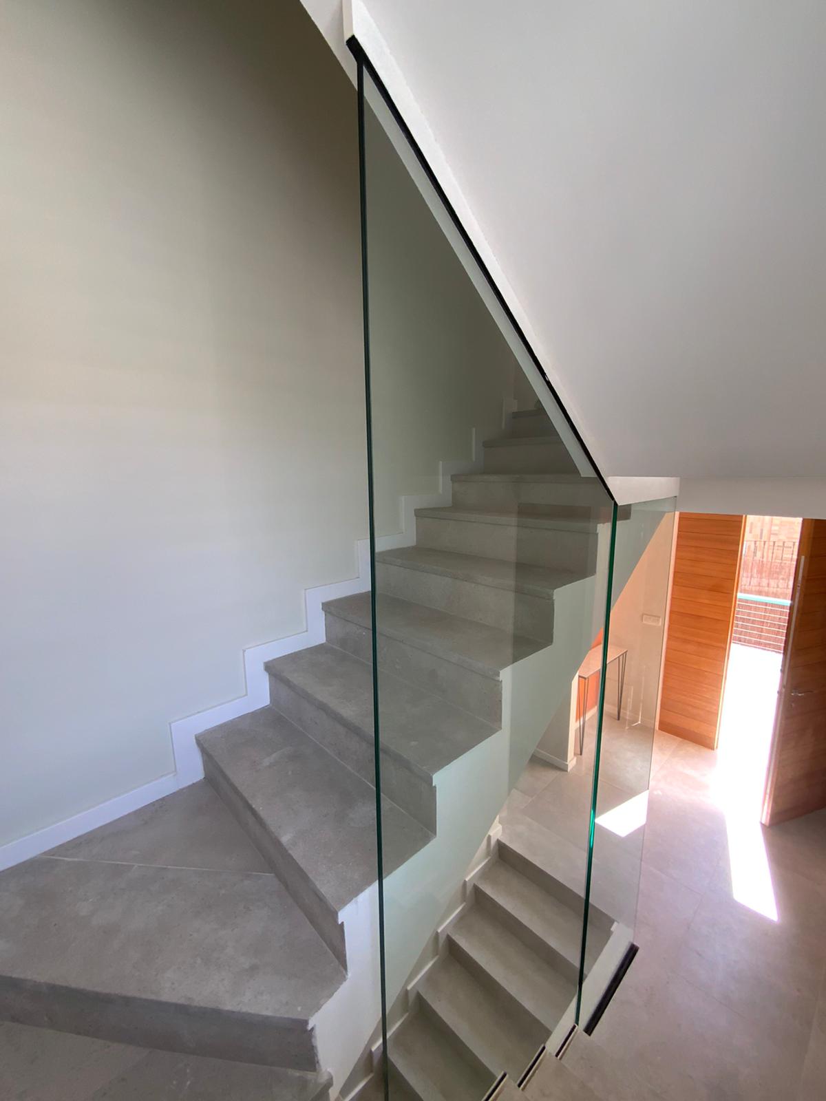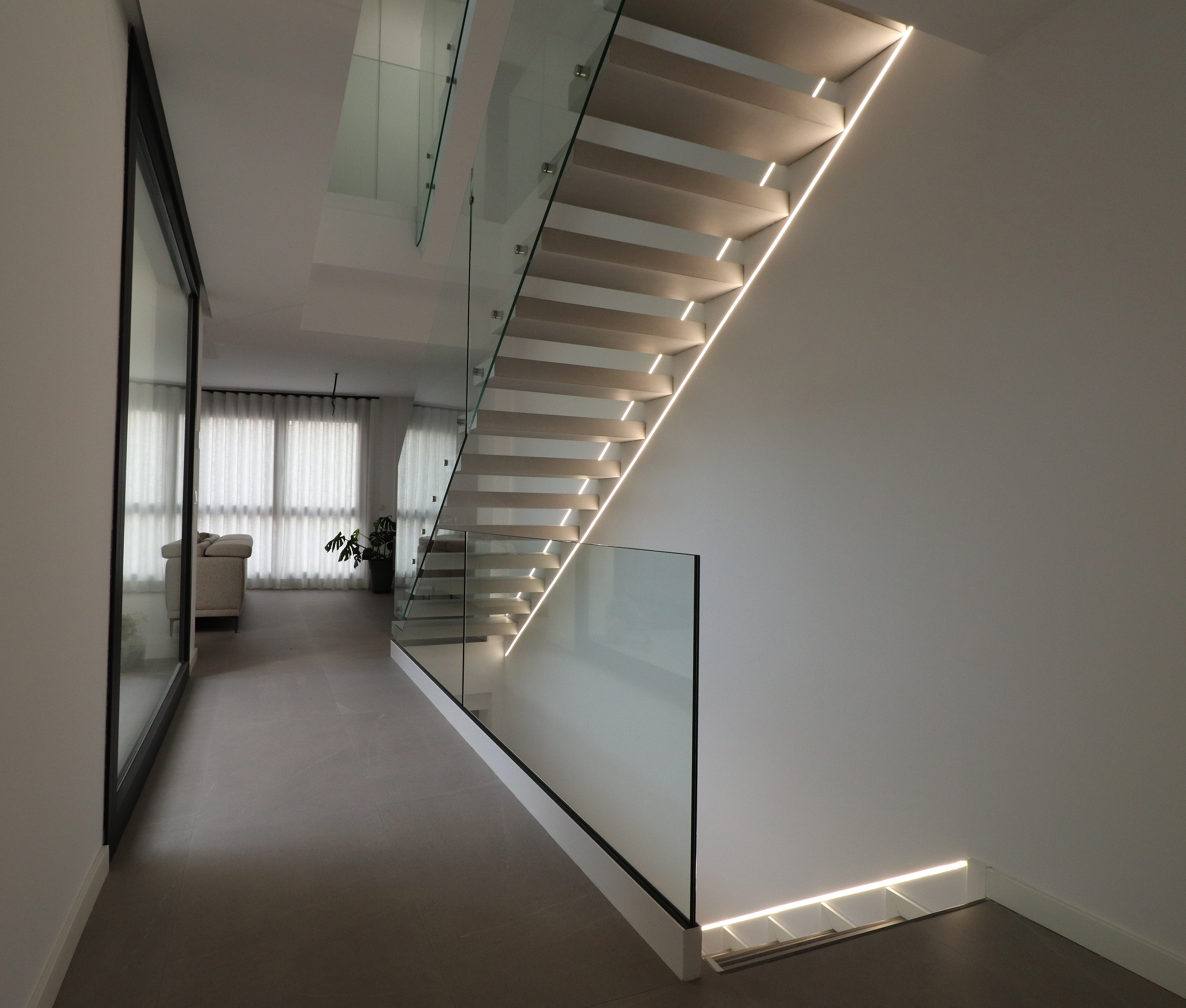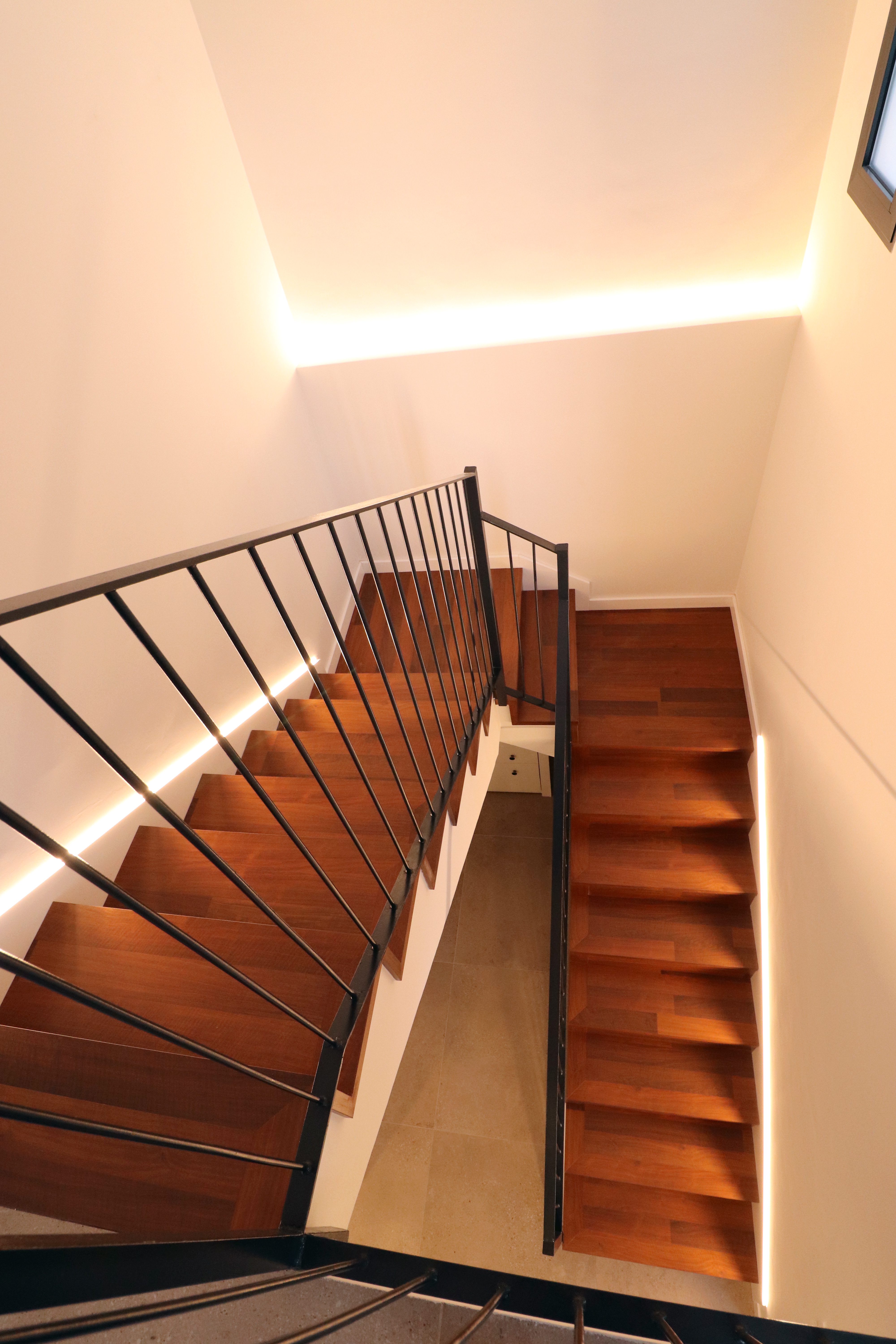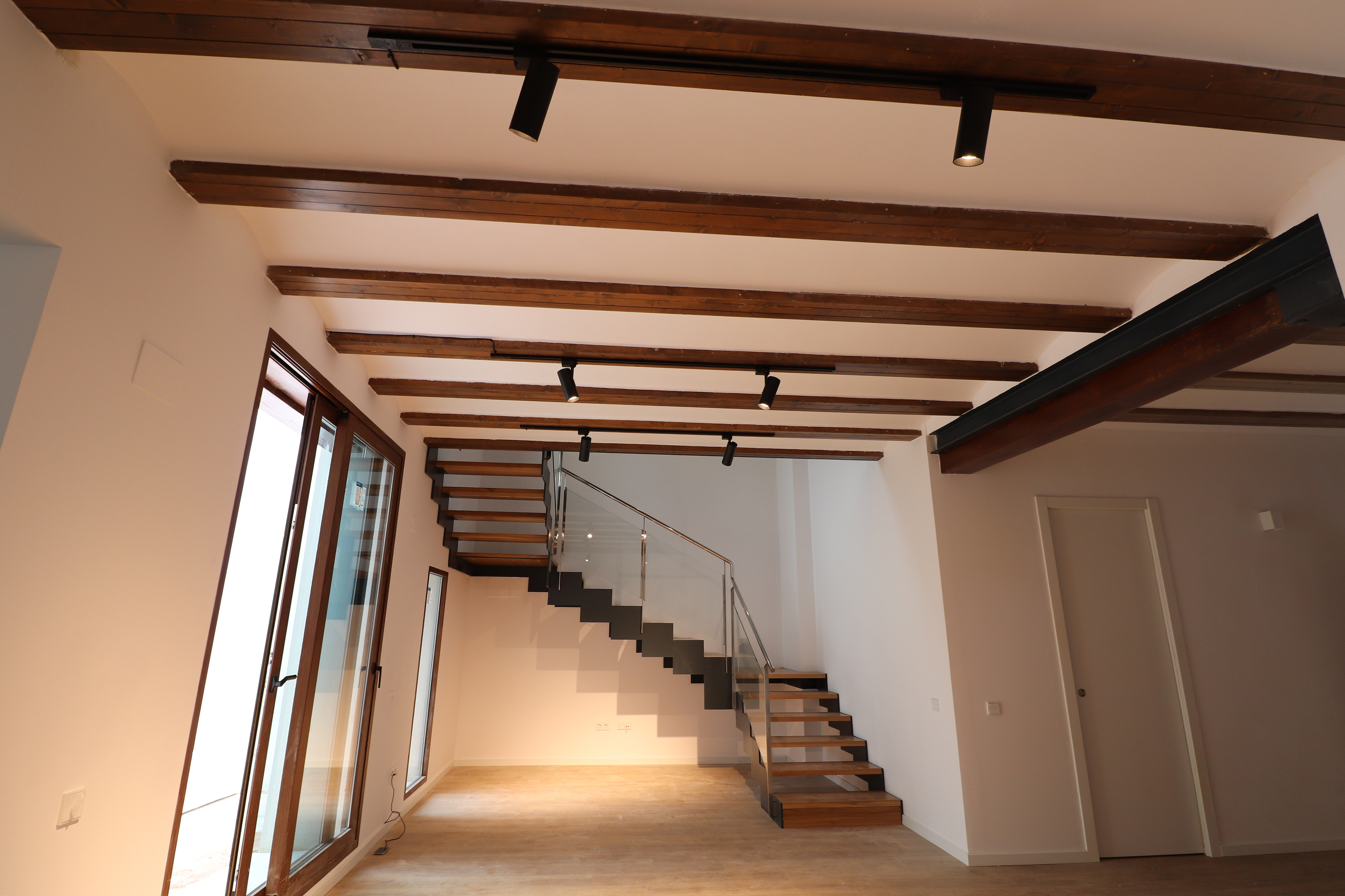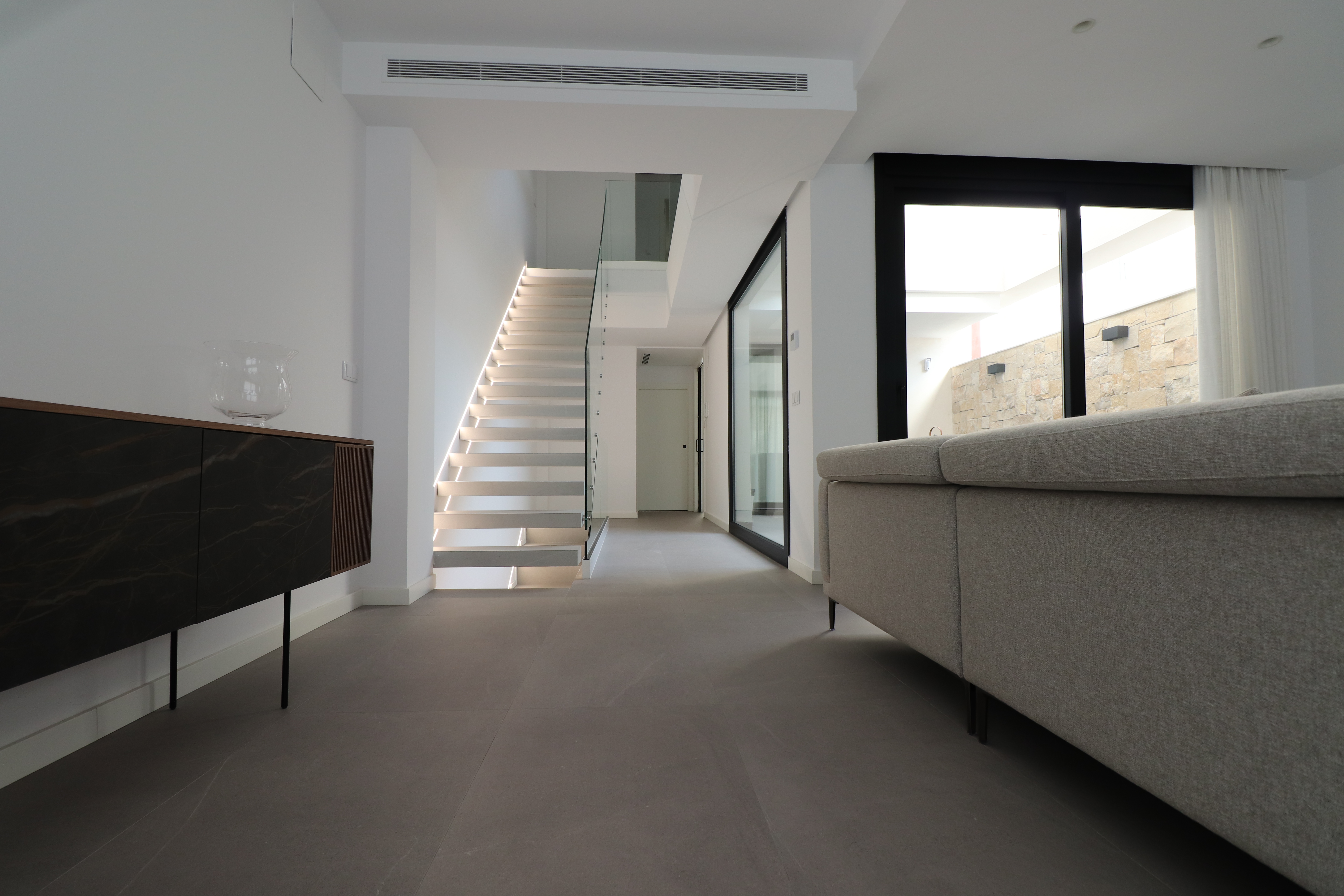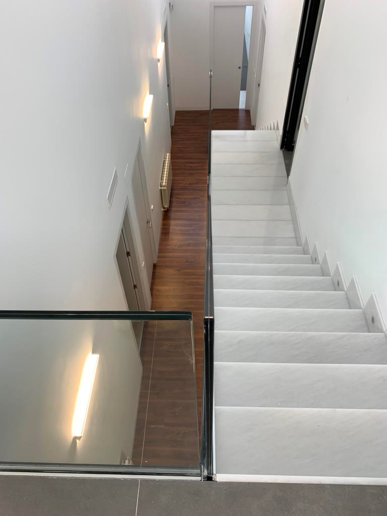 A destacar su escalera de peldaño volado, forrada en gres porcelanico y barandilla de vidrio abotonada. Acogedor patio interior en planta primera, gracias al aplacado de piedra natural.