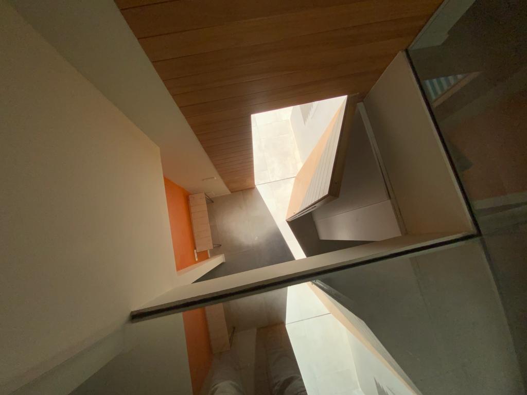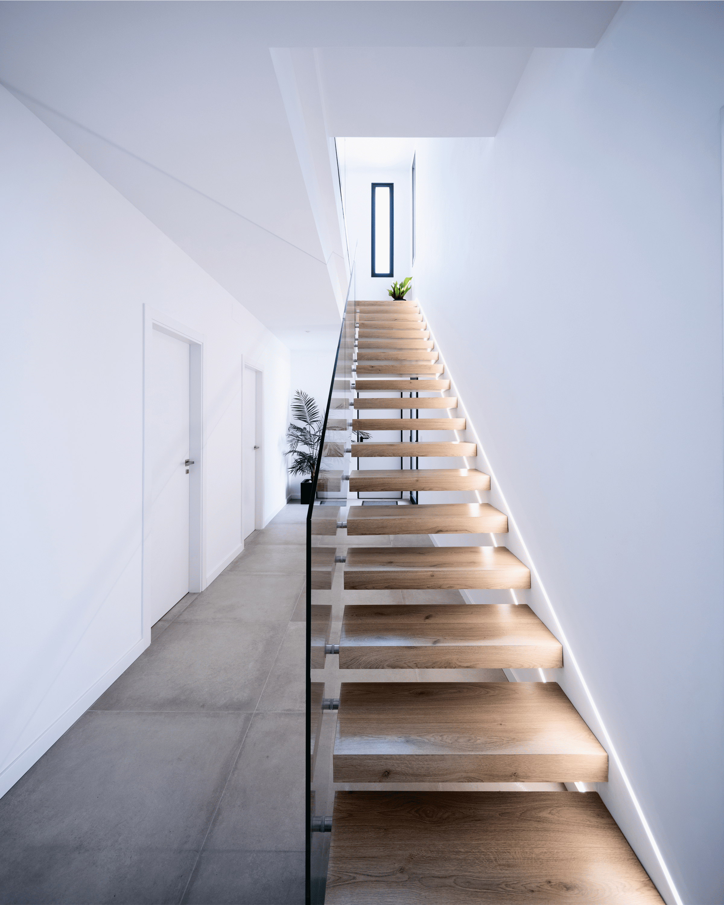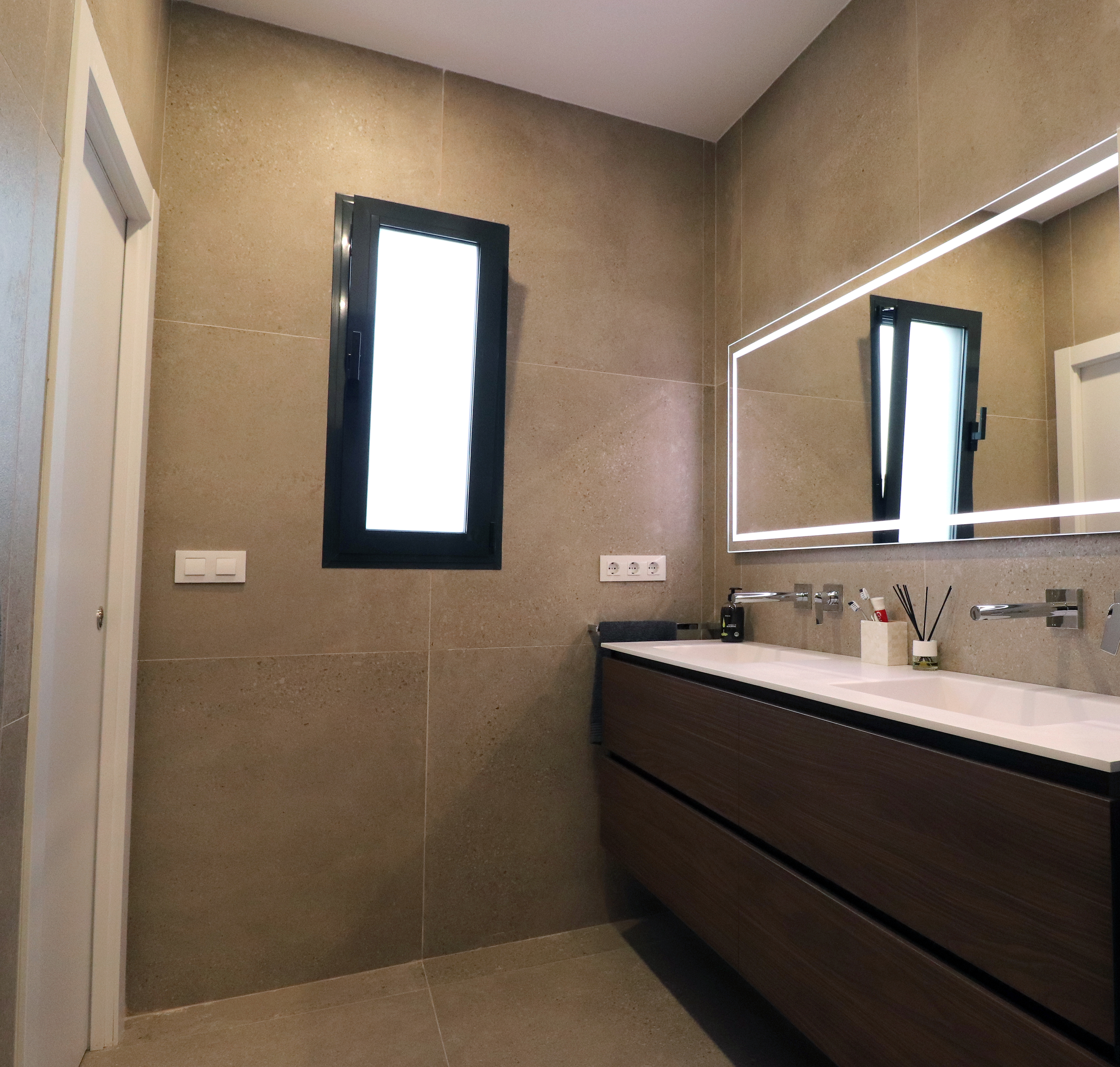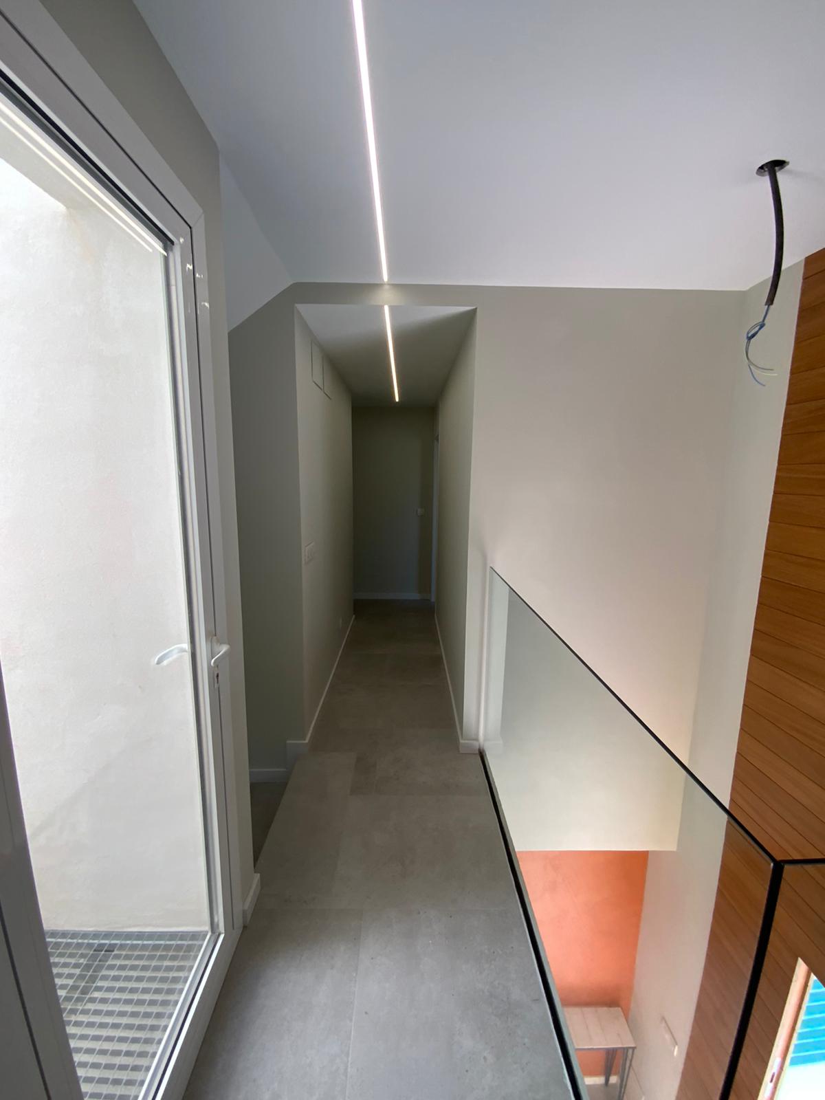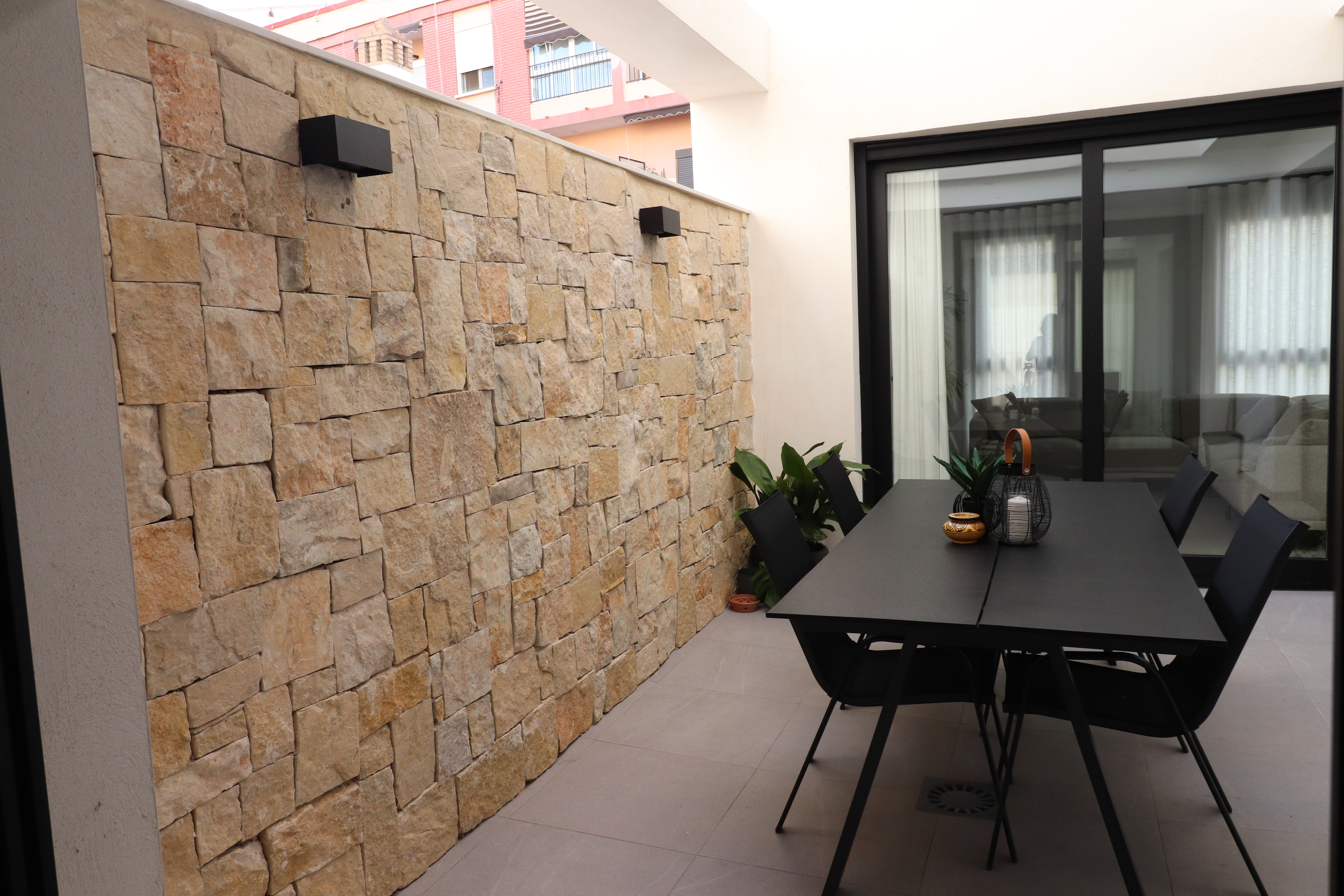 A destacar su escalera de peldaño volado, forrada en gres porcelanico y barandilla de vidrio abotonada. Acogedor patio interior en planta primera, gracias al aplacado de piedra natural.