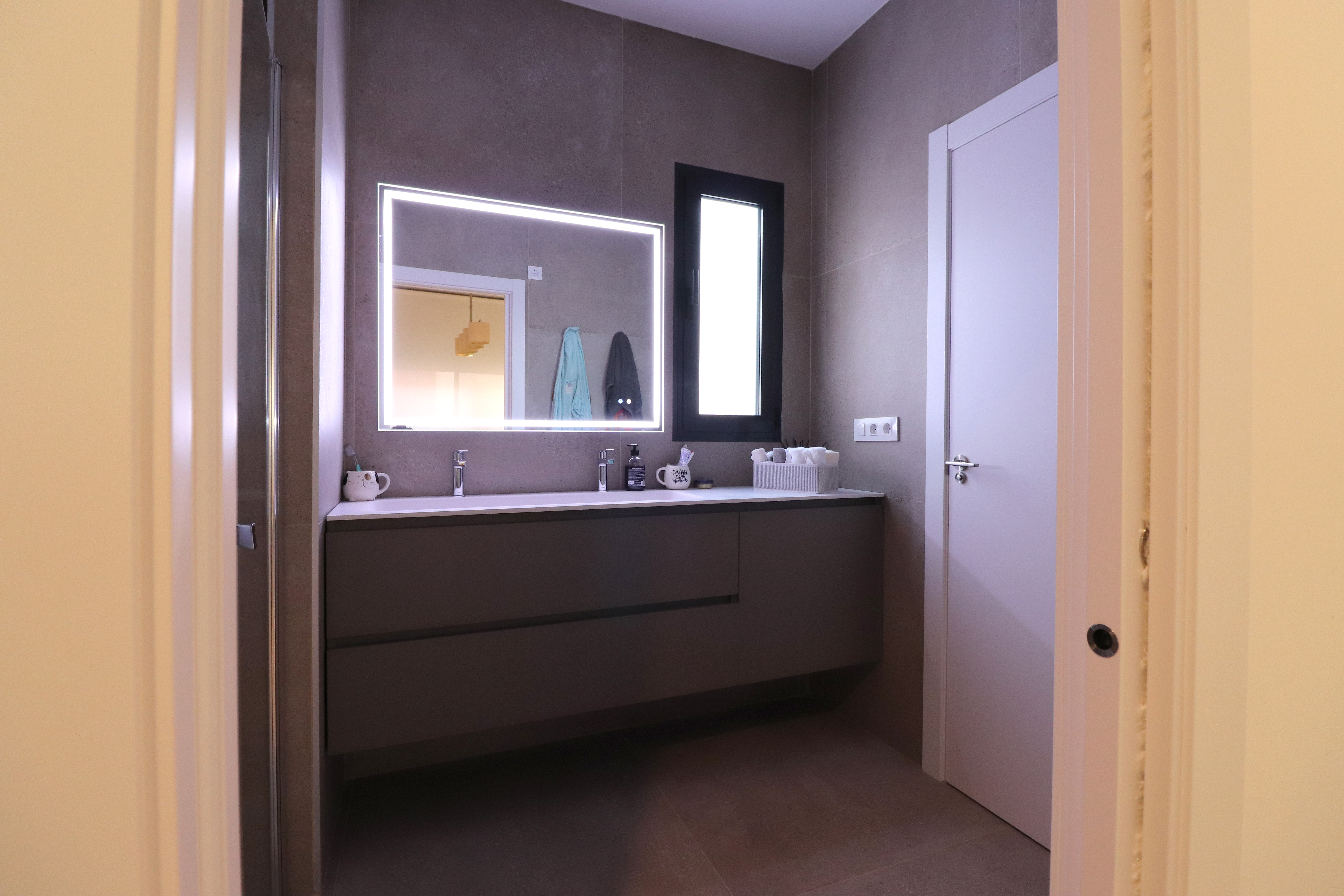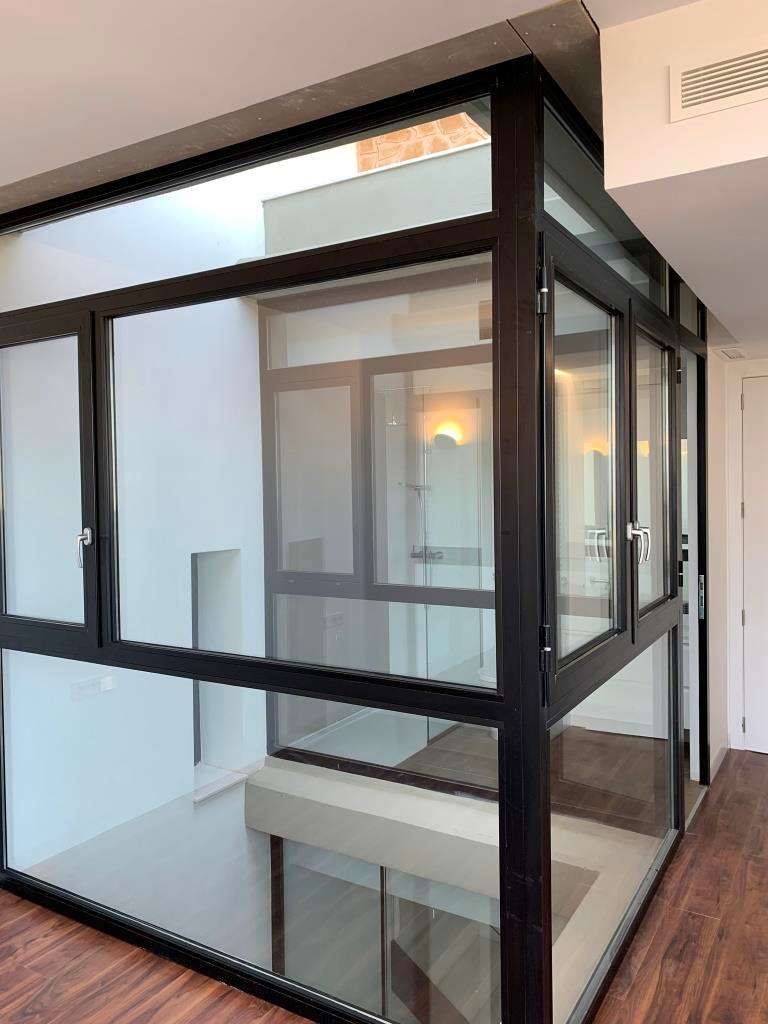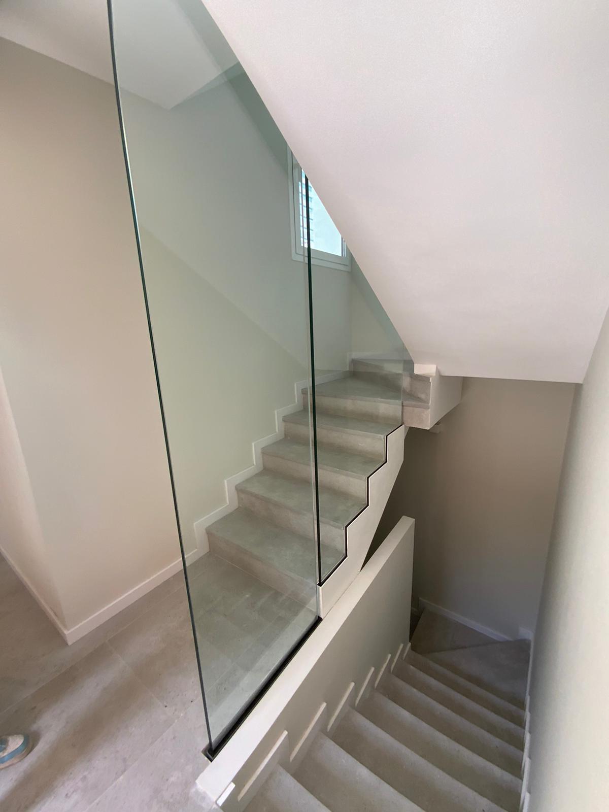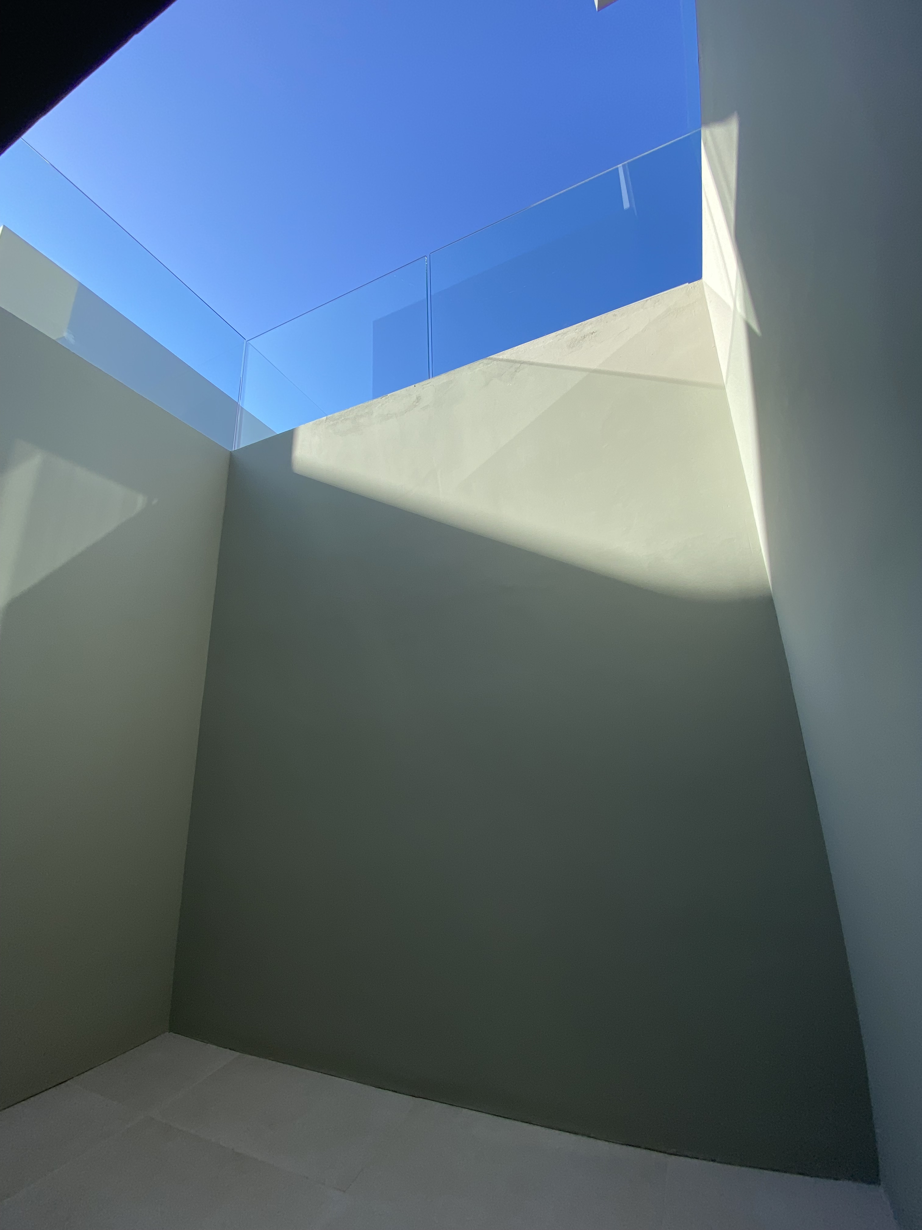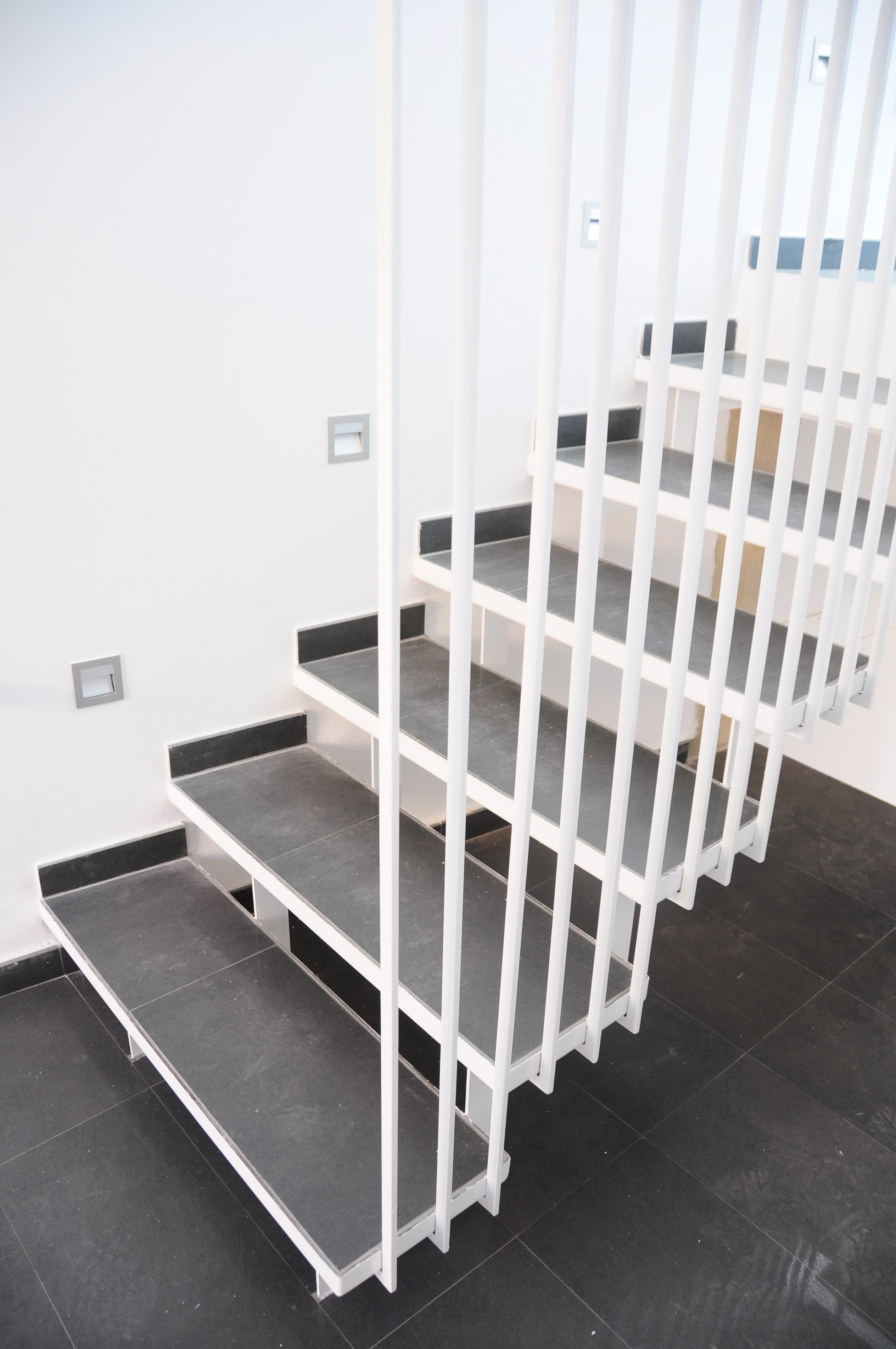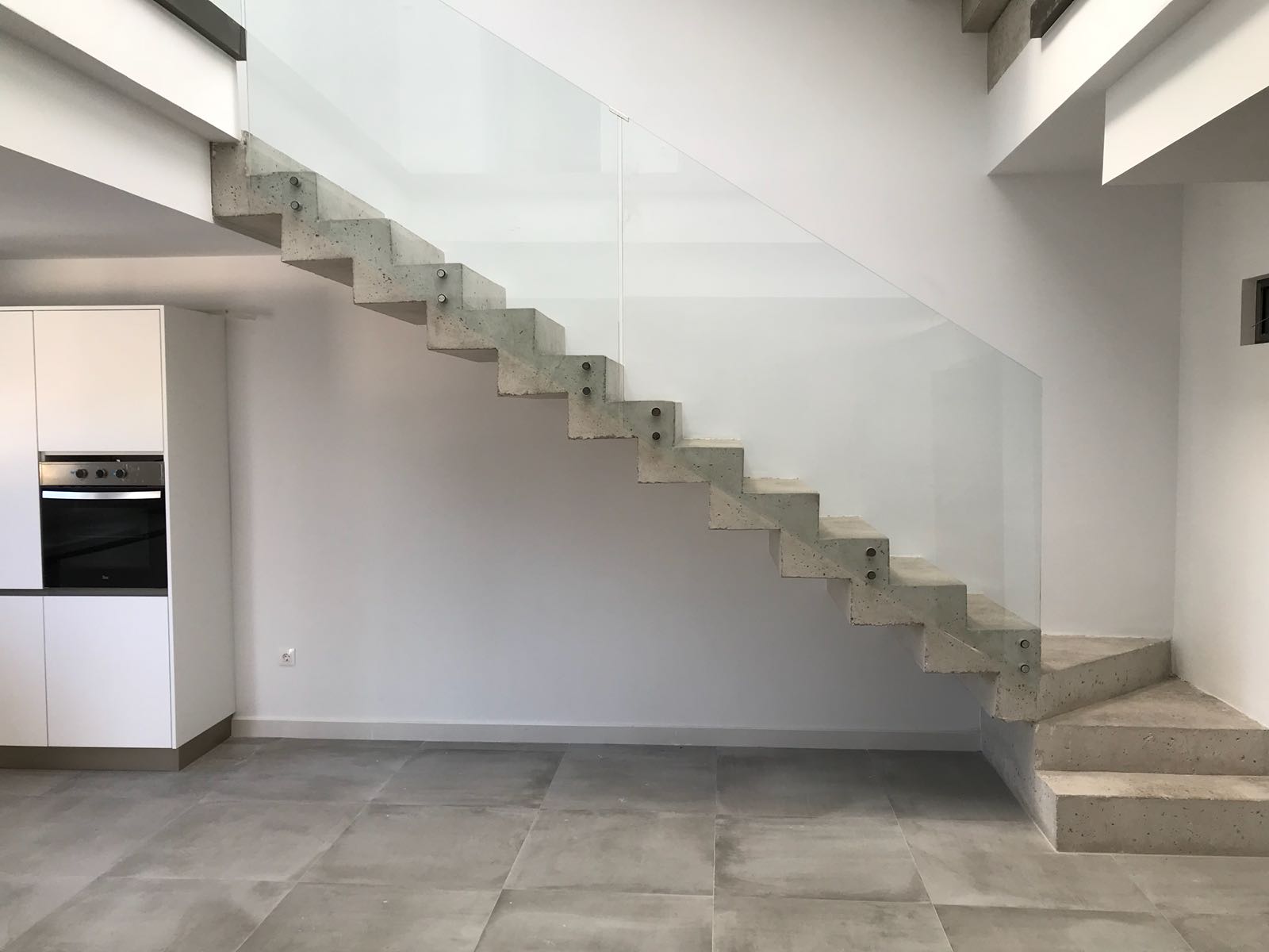 A destacar su escalera de peldaño volado, forrada en gres porcelanico y barandilla de vidrio abotonada. Acogedor patio interior en planta primera, gracias al aplacado de piedra natural.