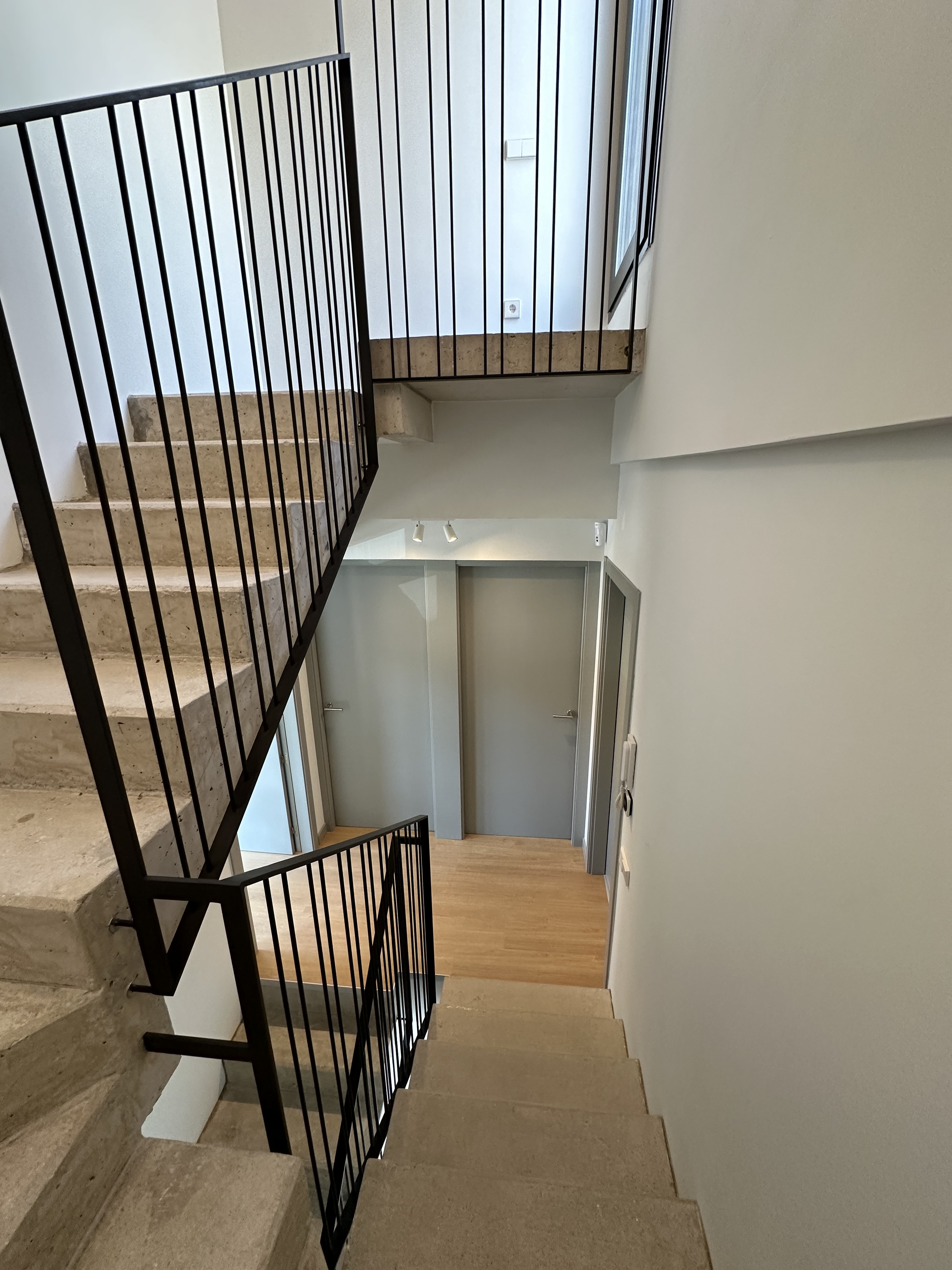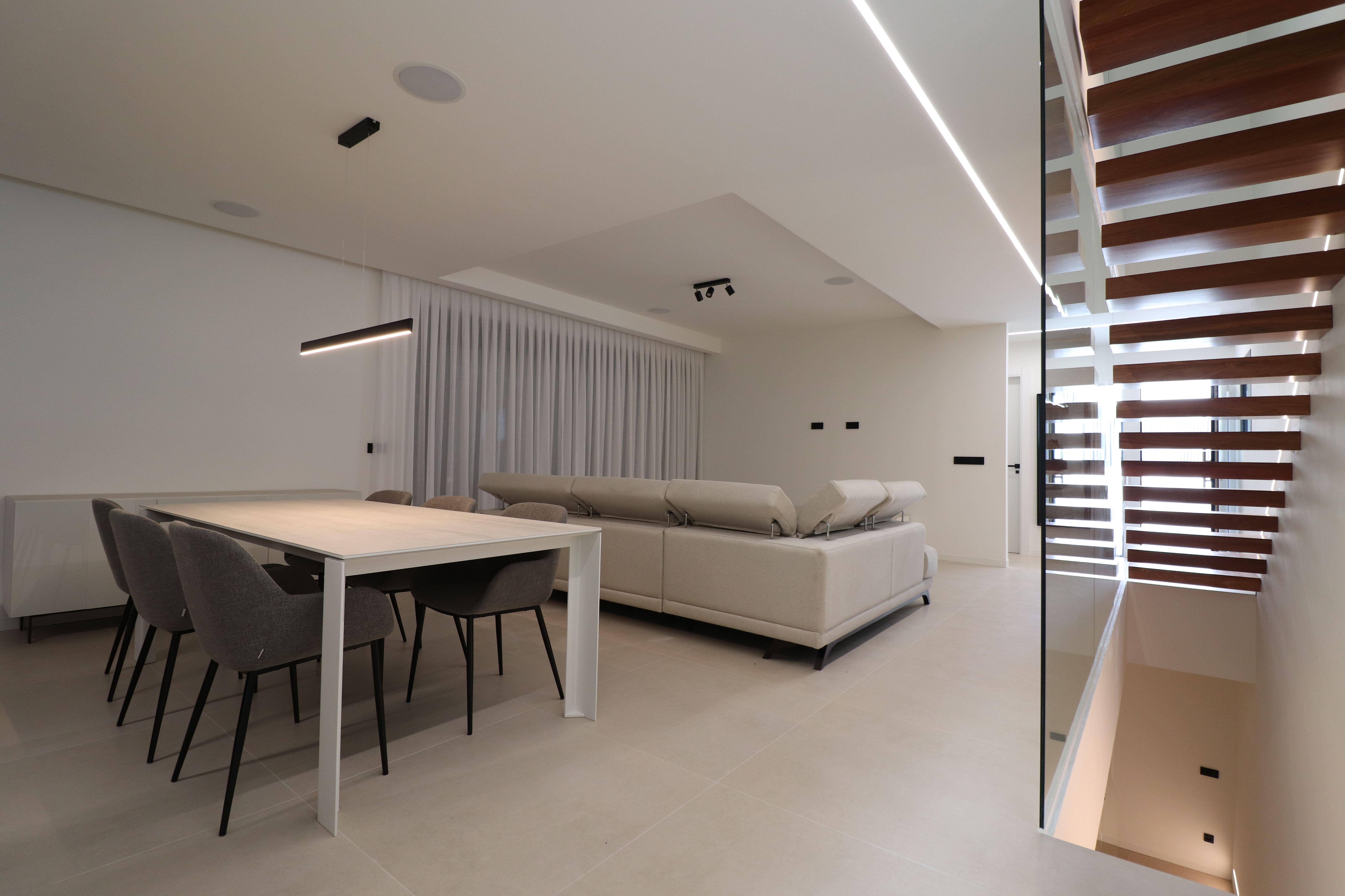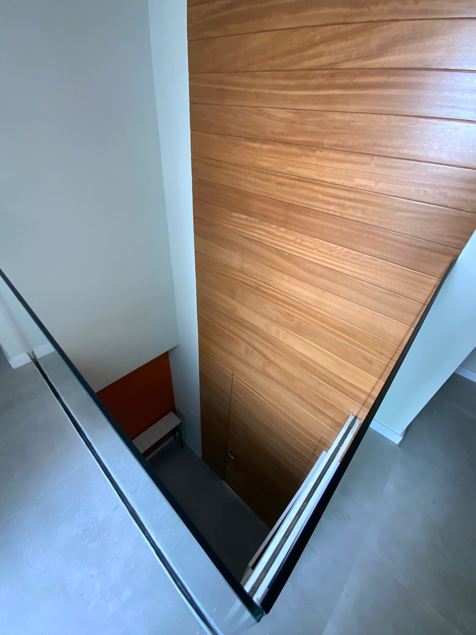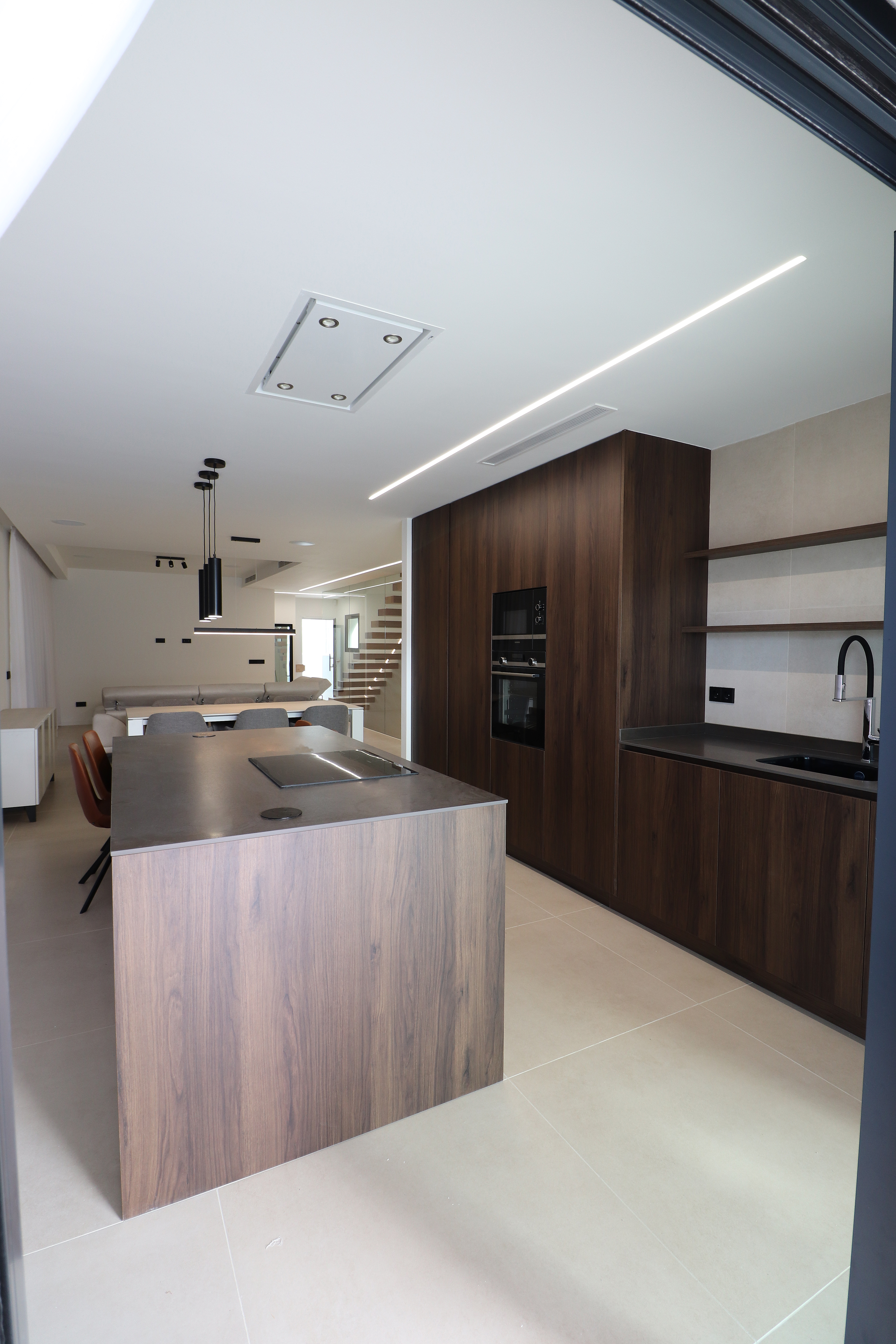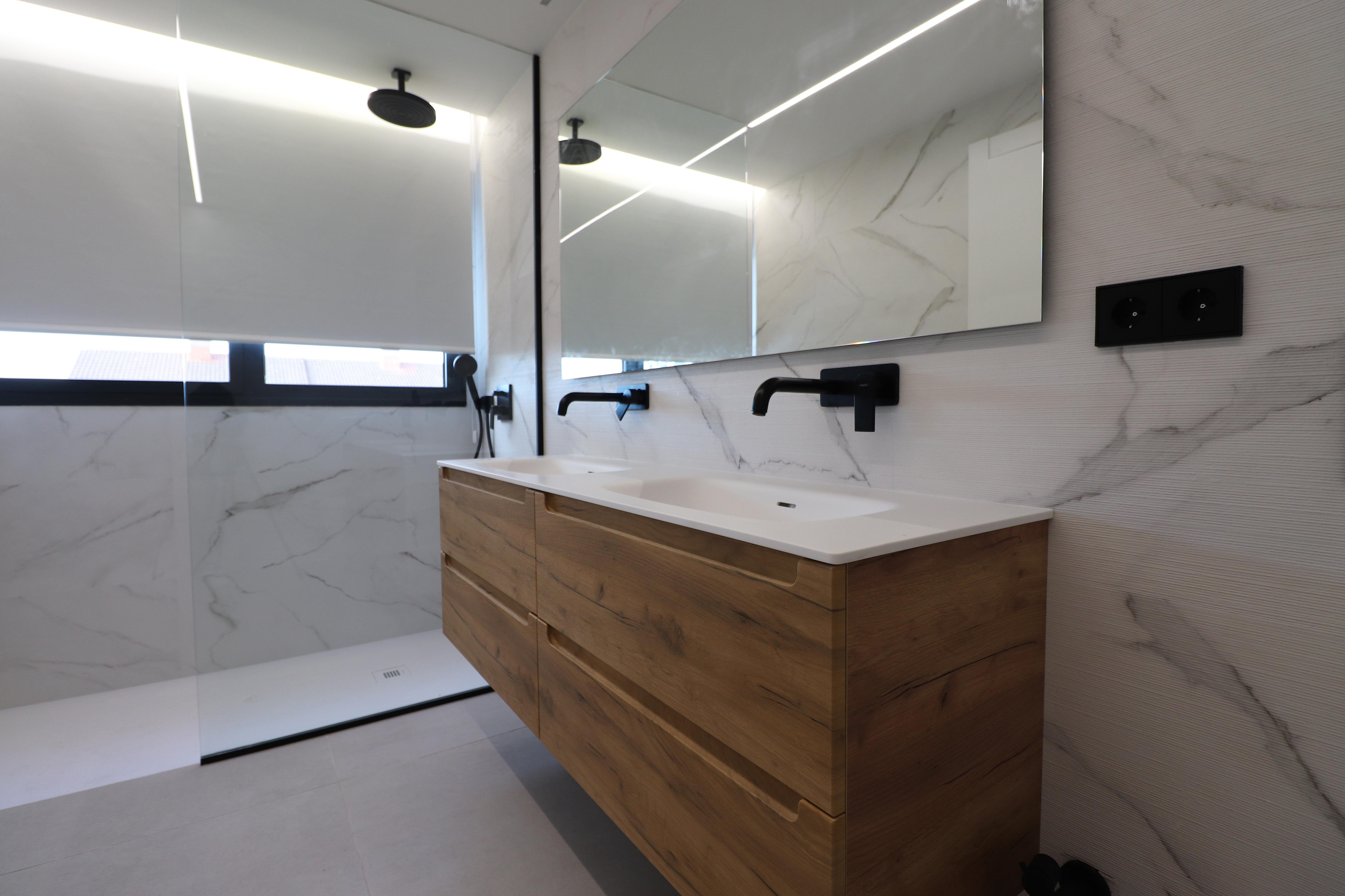 A destacar su escalera de peldaño volado, forrada en gres porcelanico y barandilla de vidrio abotonada. Acogedor patio interior en planta primera, gracias al aplacado de piedra natural.