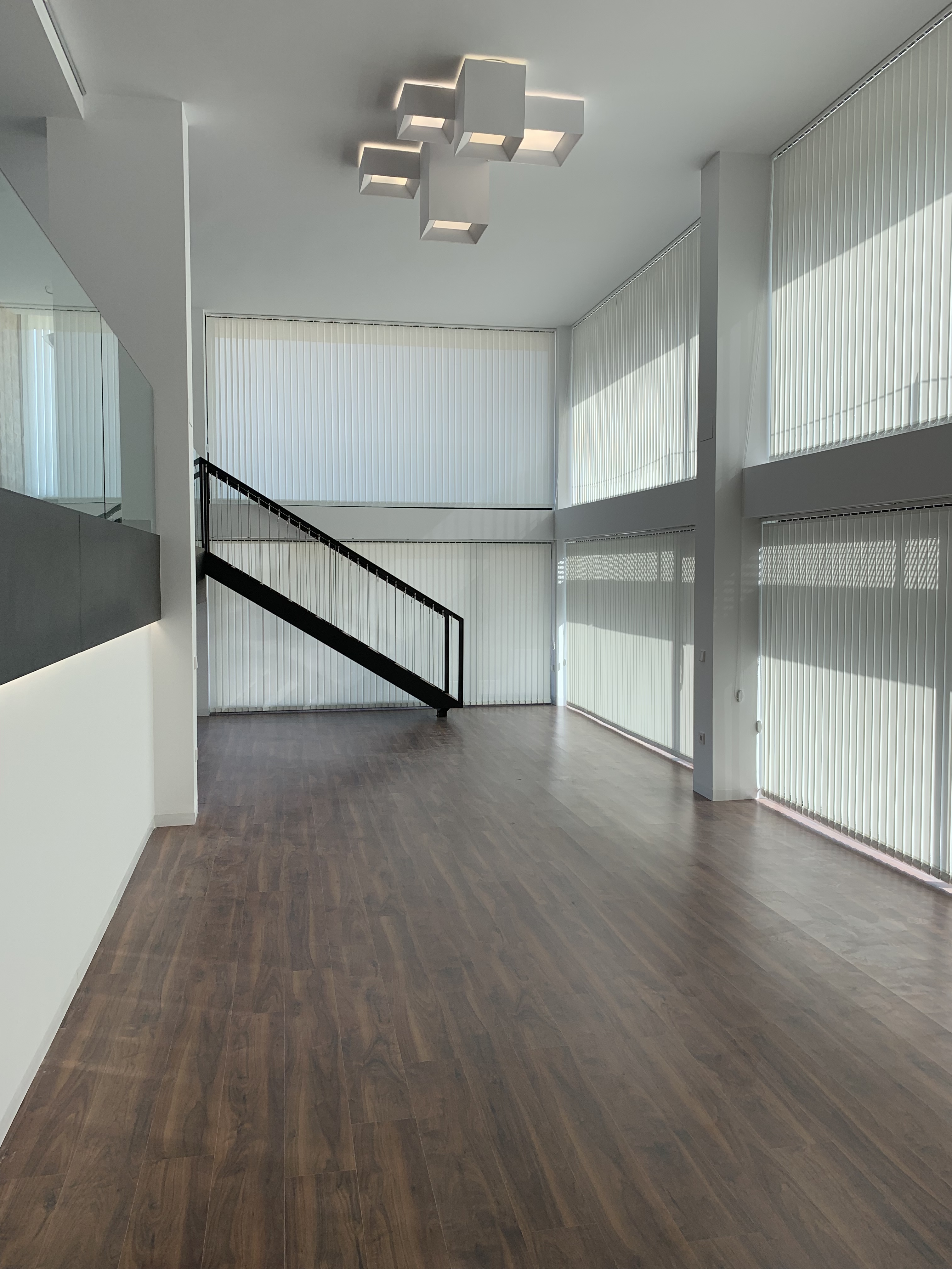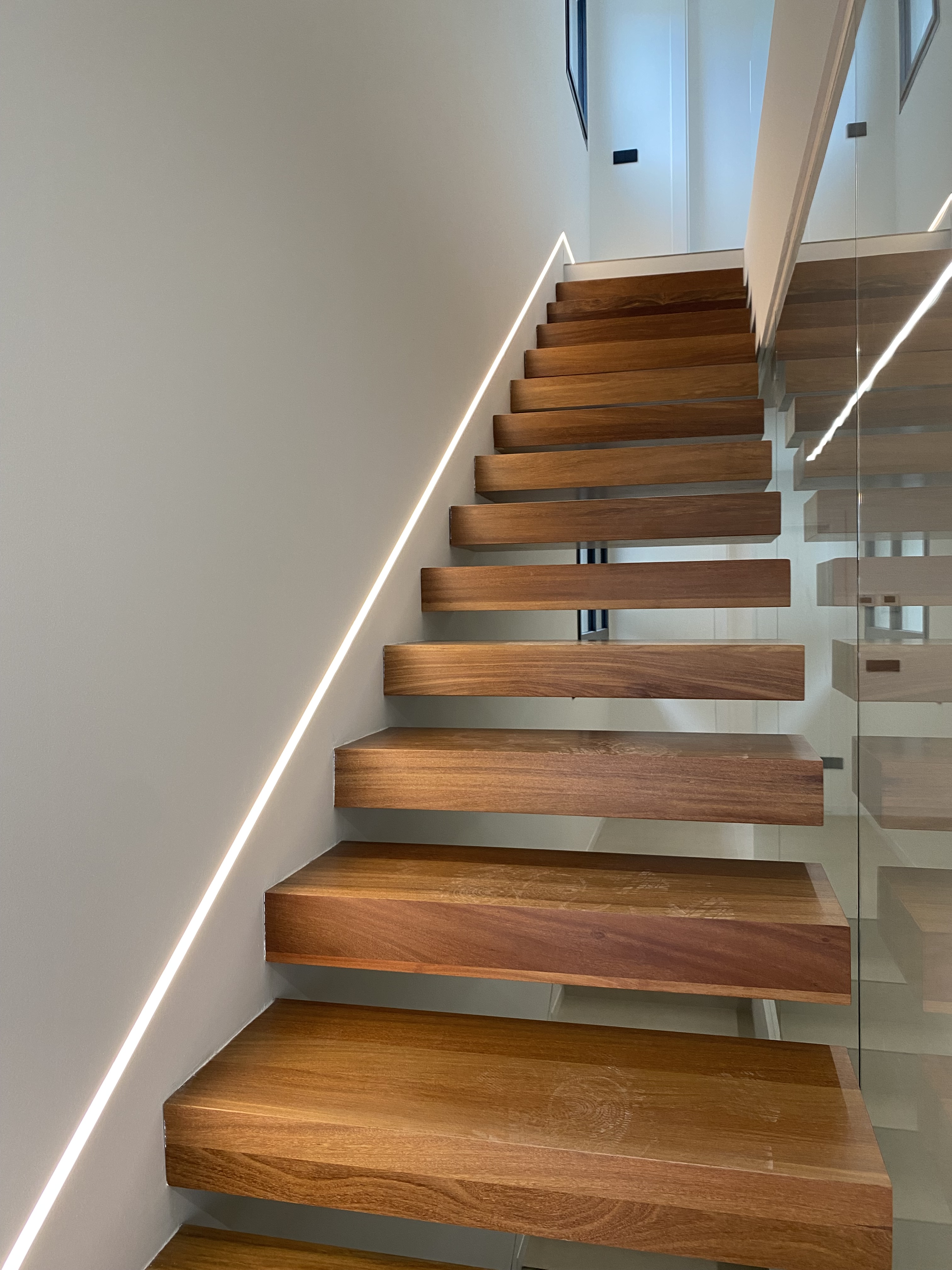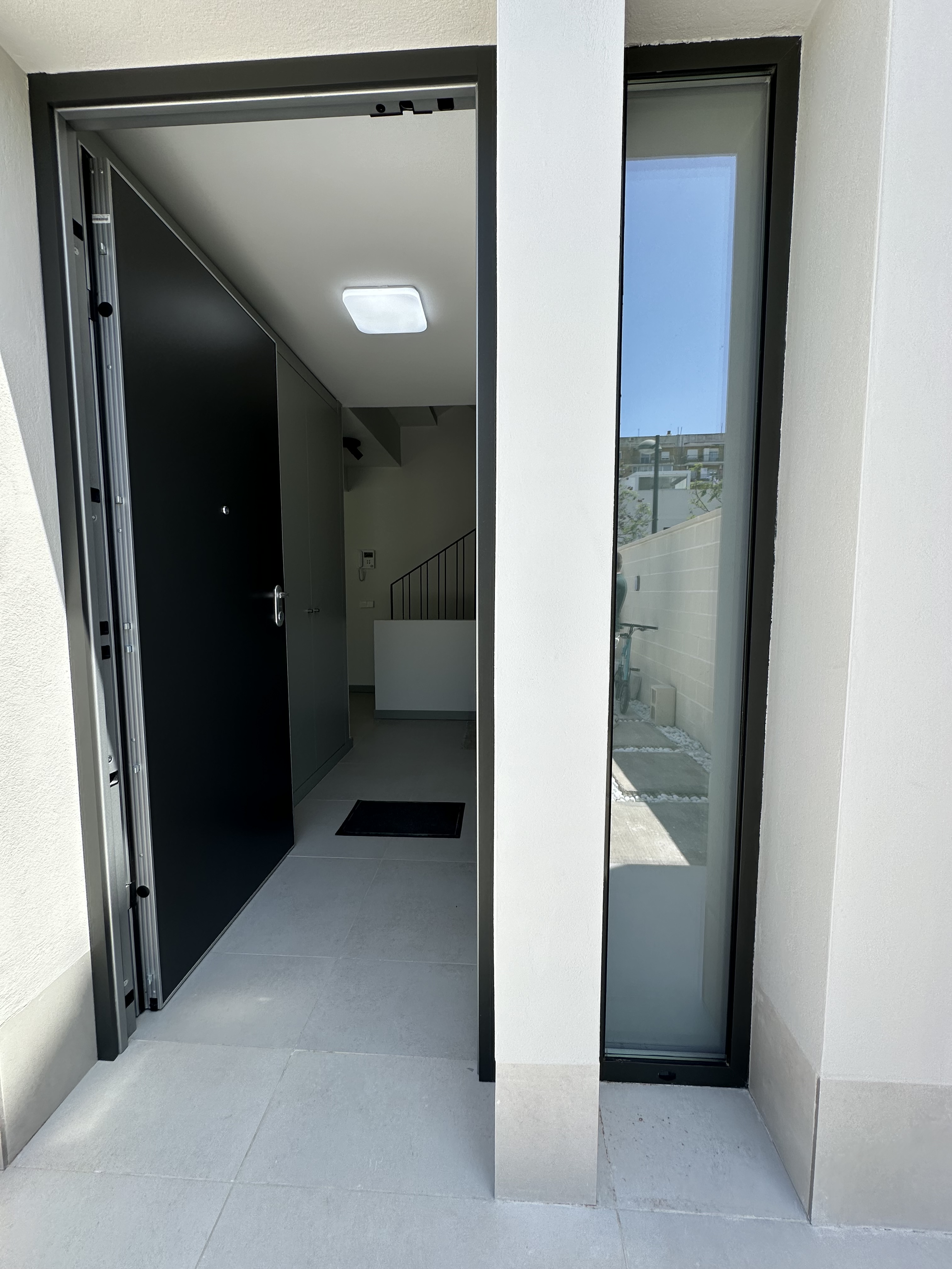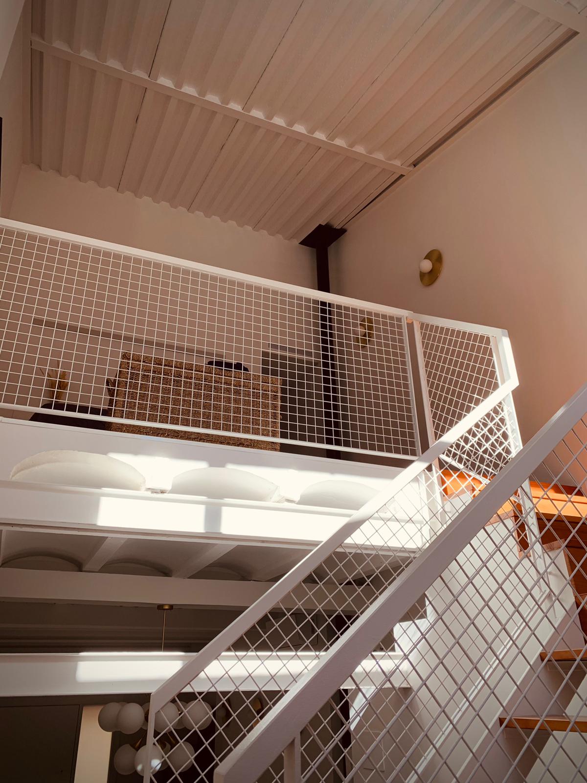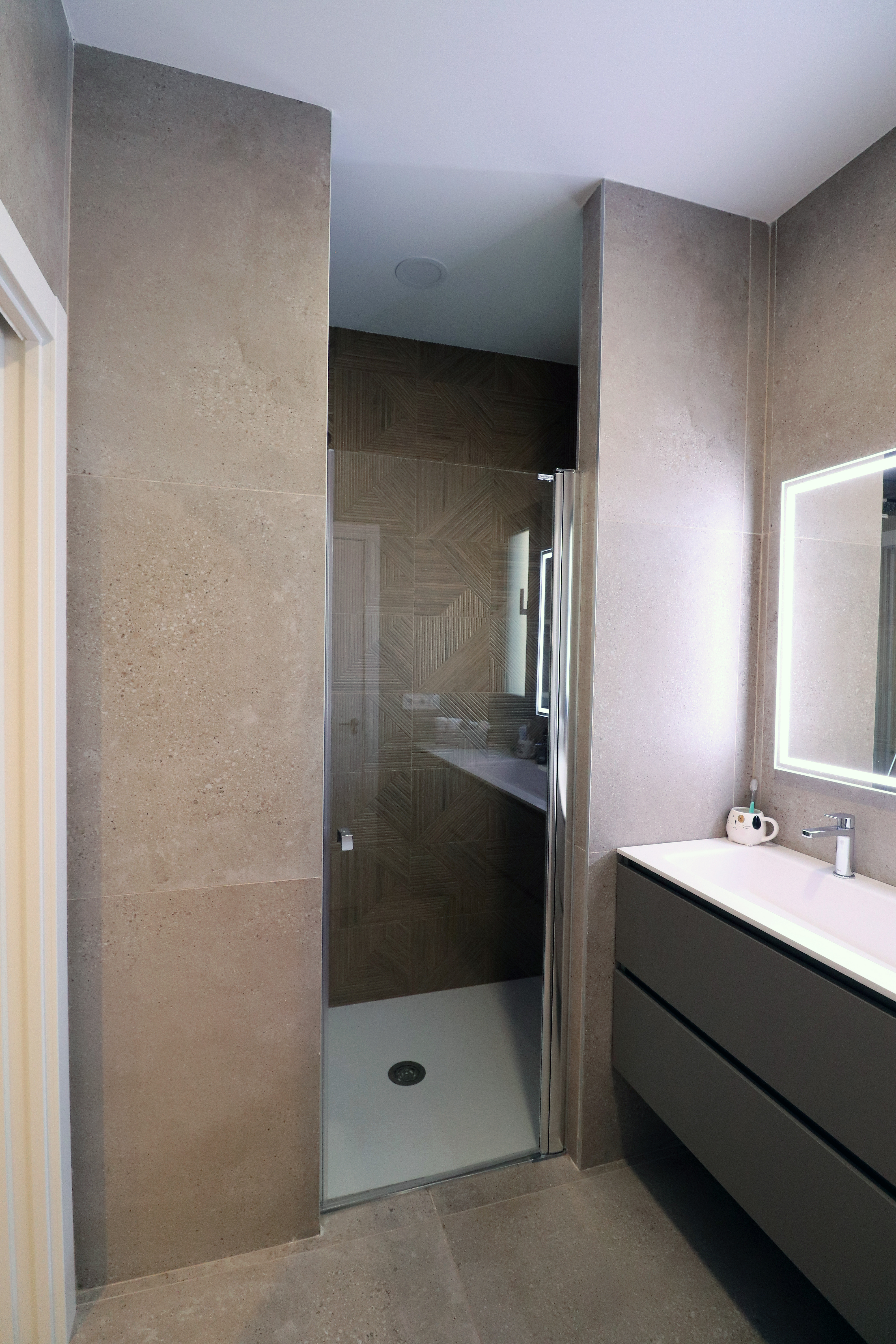 A destacar su escalera de peldaño volado, forrada en gres porcelanico y barandilla de vidrio abotonada. Acogedor patio interior en planta primera, gracias al aplacado de piedra natural.