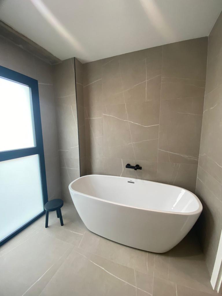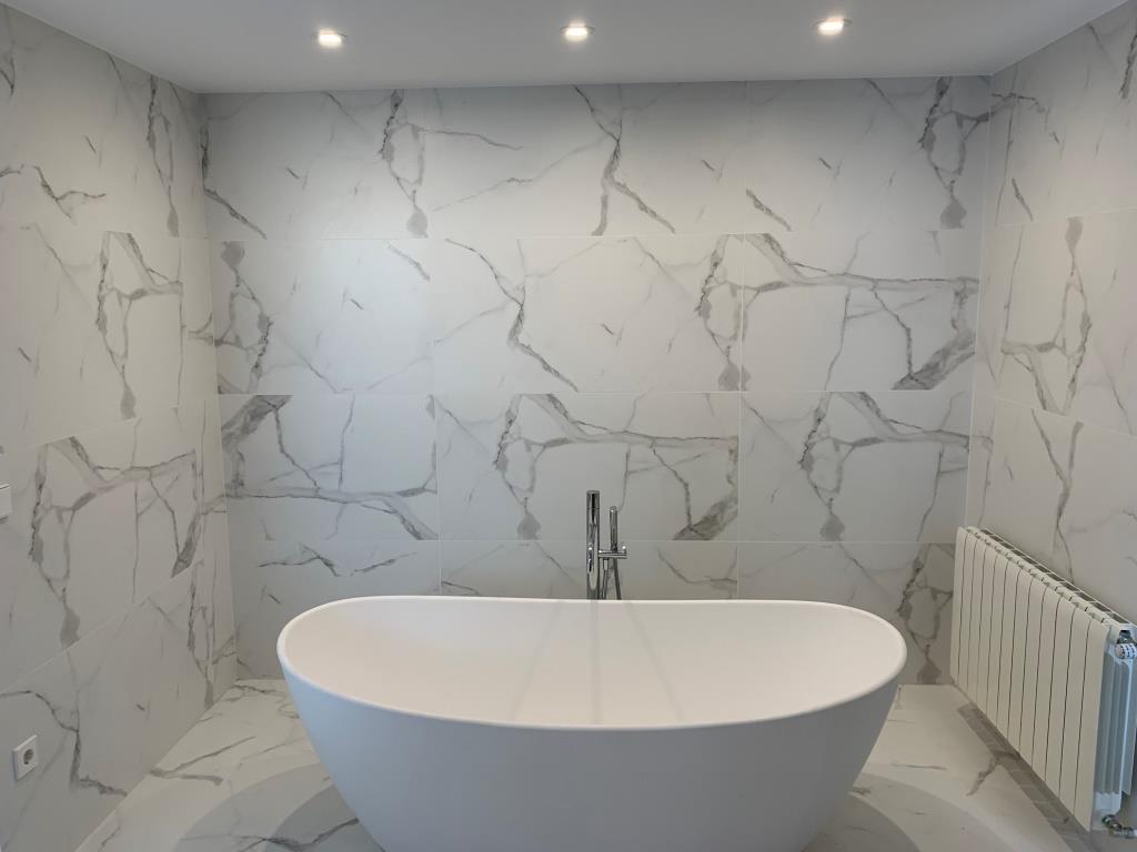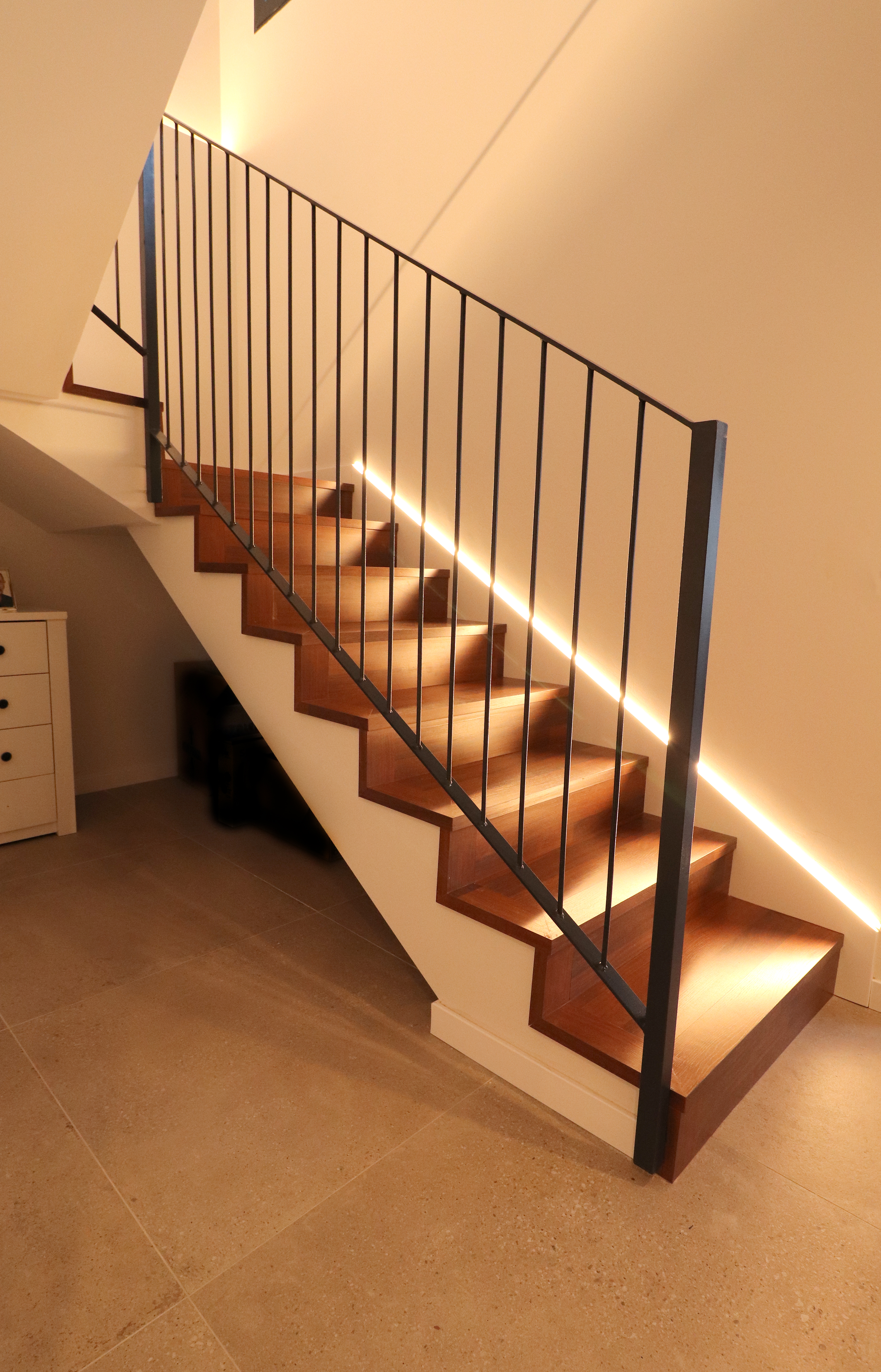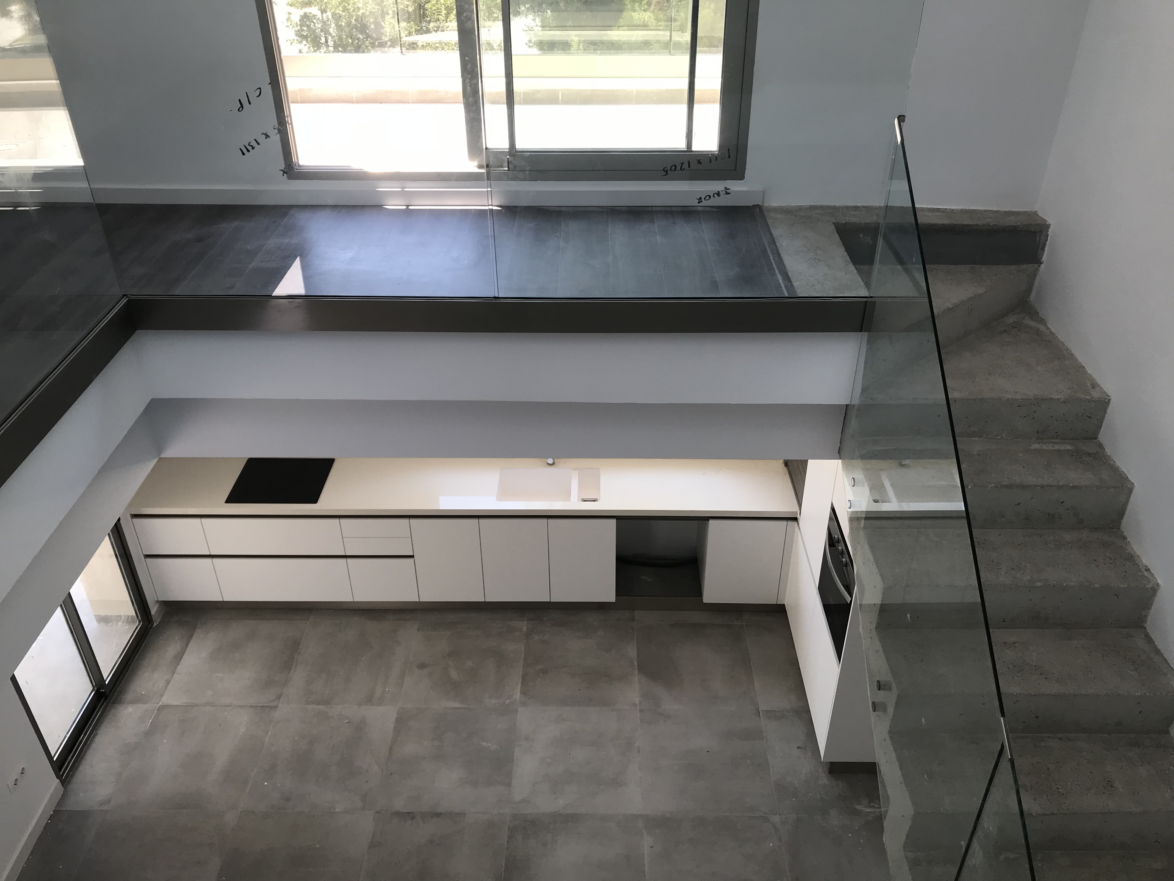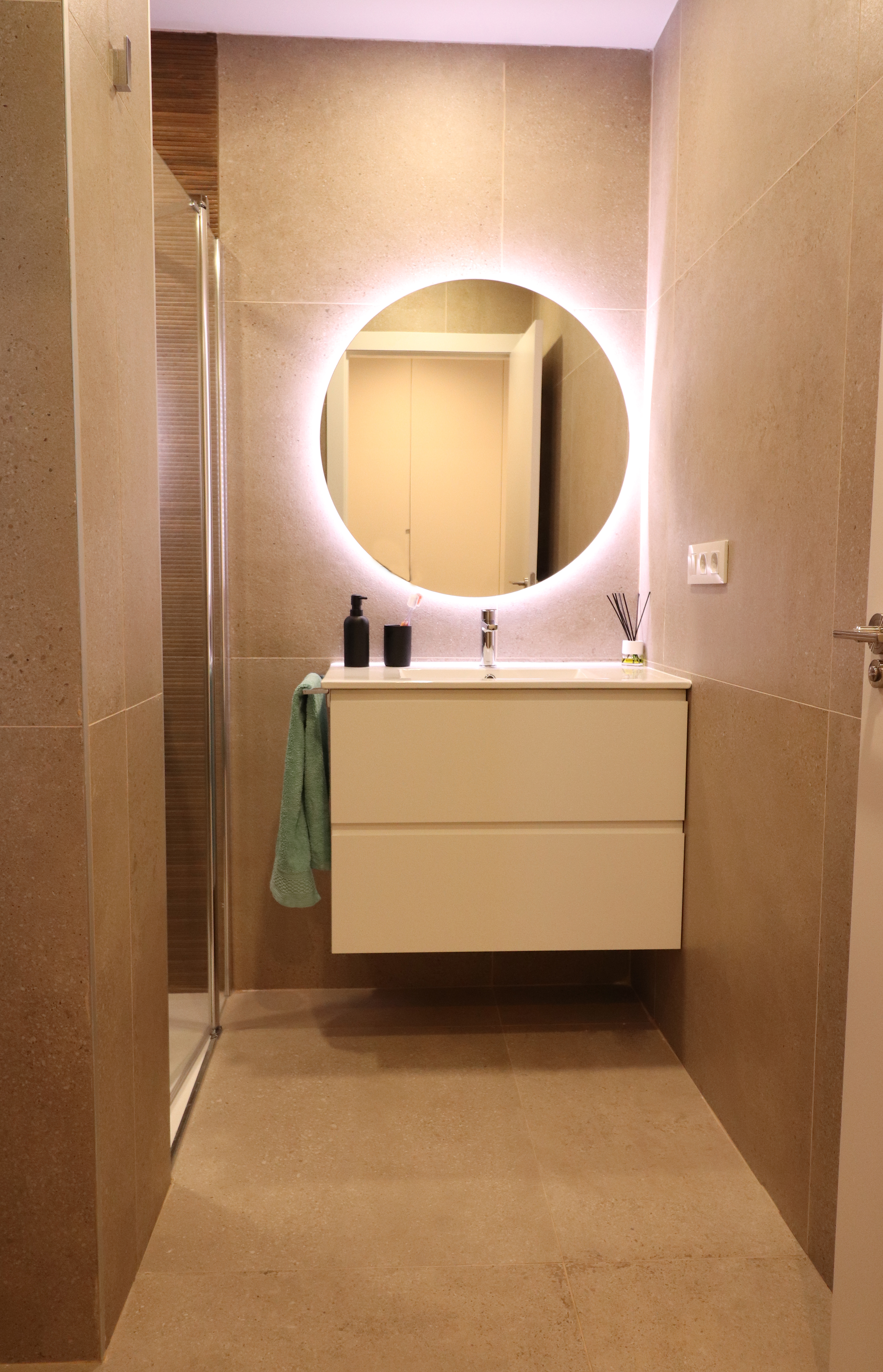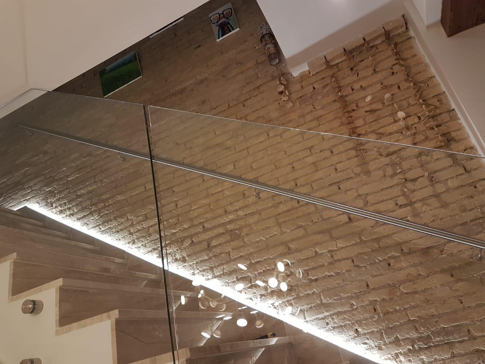 A destacar su escalera de peldaño volado, forrada en gres porcelanico y barandilla de vidrio abotonada. Acogedor patio interior en planta primera, gracias al aplacado de piedra natural.