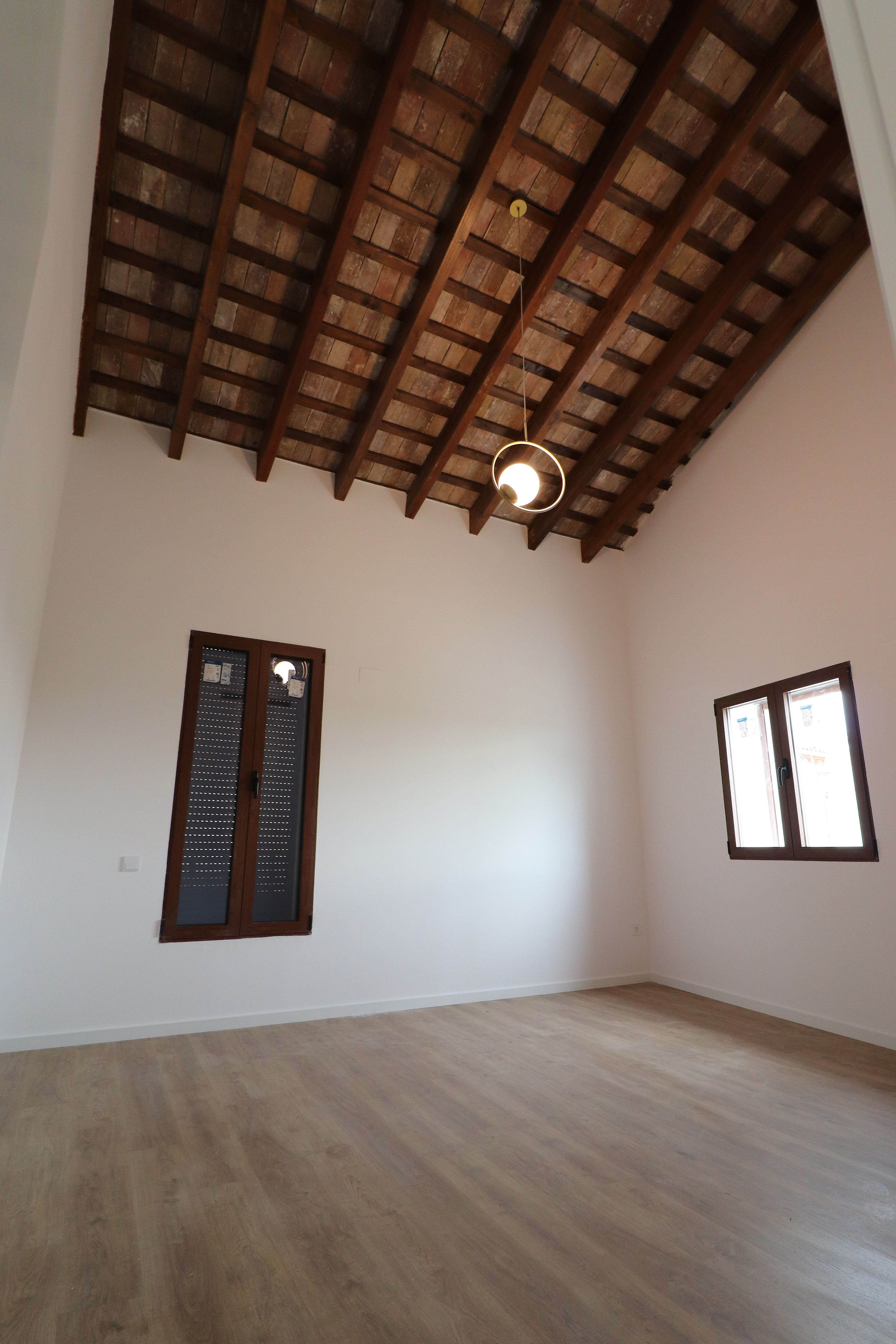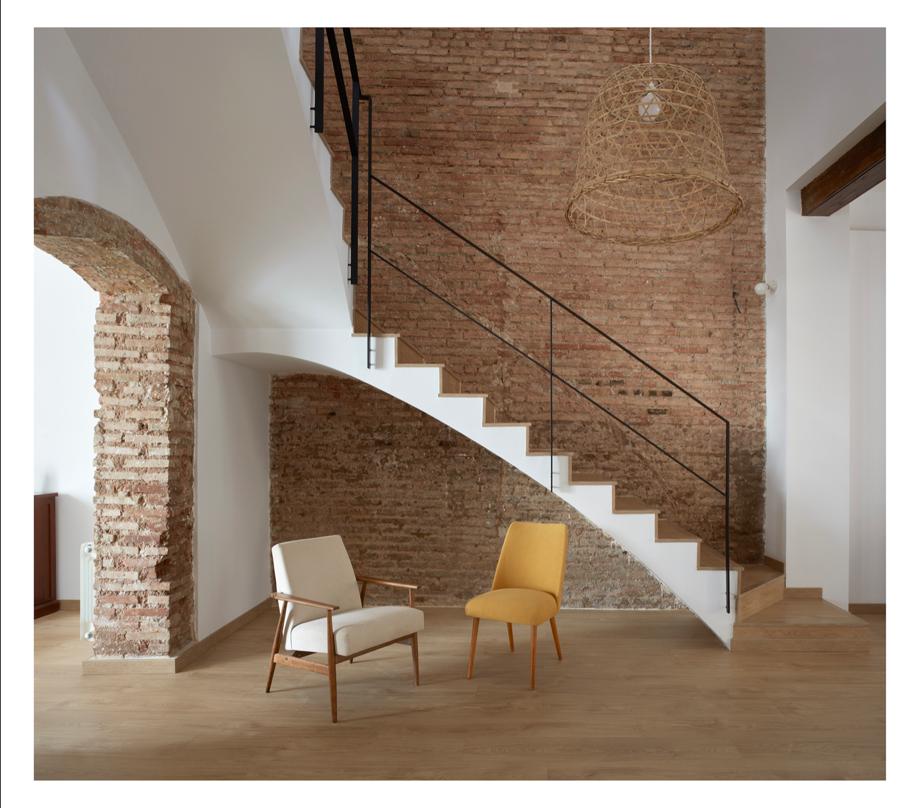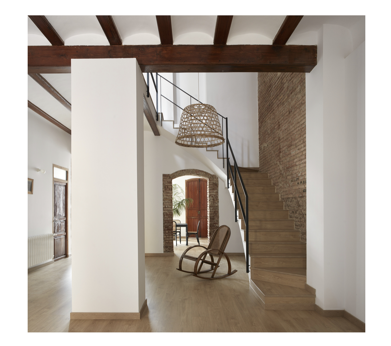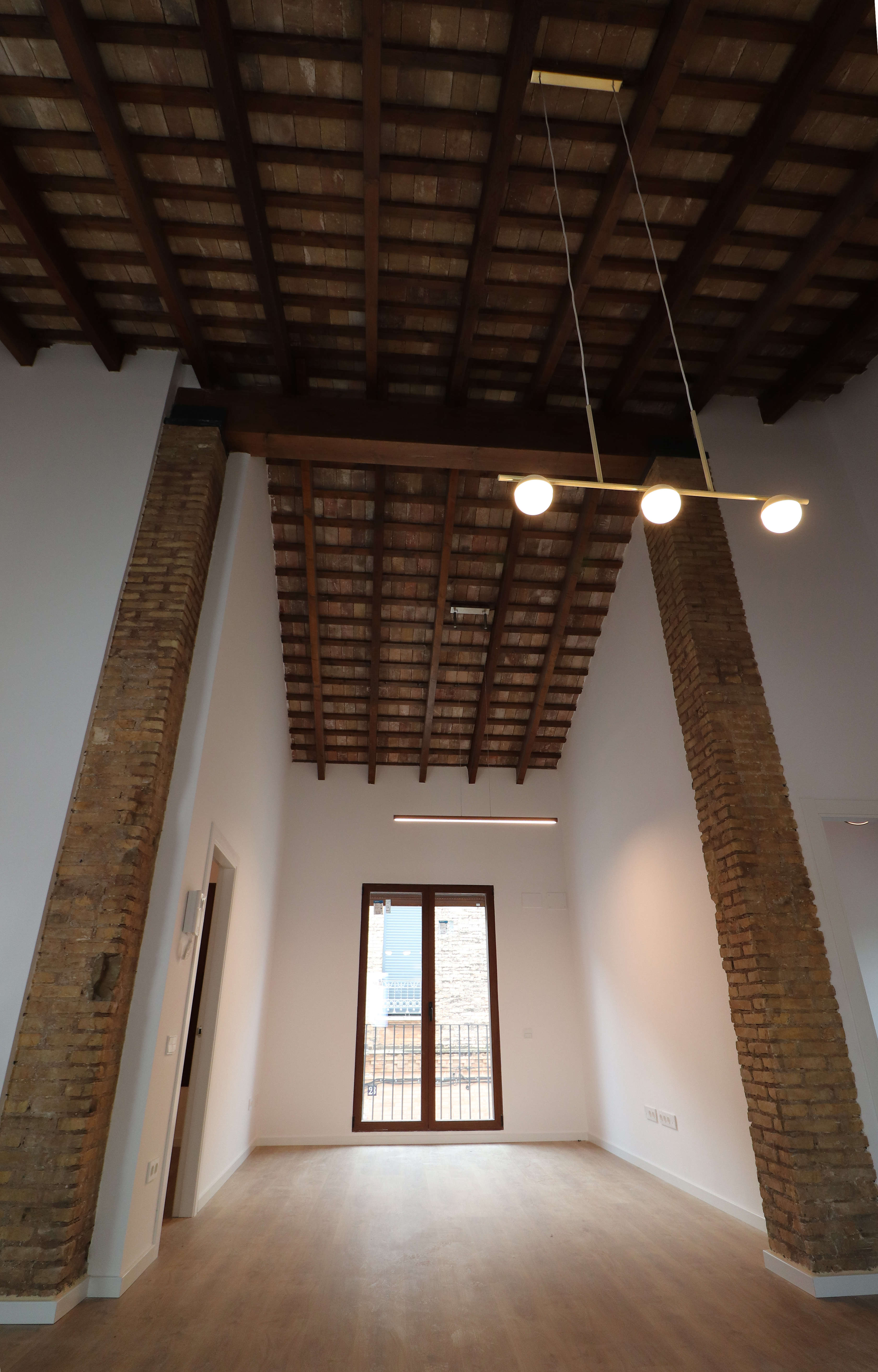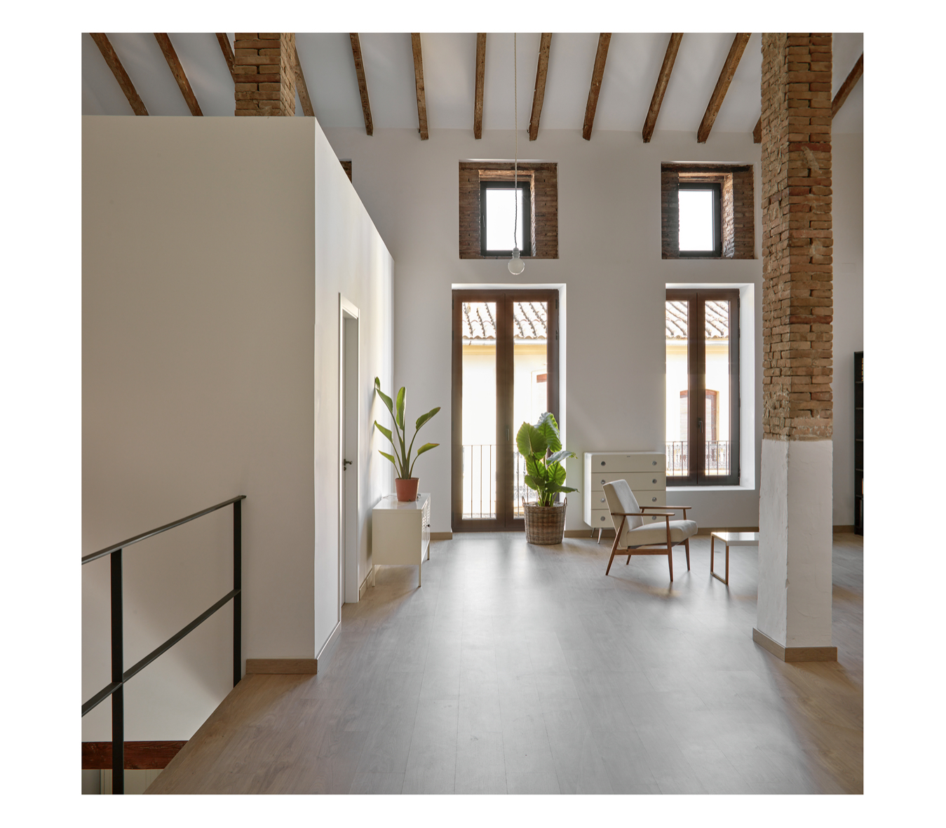 Destacamos el mantenimiento de los dinteles y jambas de los huecos interiores realizados con fábrica de ladrillo macizo, el aprovechamiento con restauración de la carpintería de madera, la utilización y reparación de vigas y viguetas de madera originales con sus revoltones en combinación con suelo laminado y revestimiento paredes y techos en blanco.
