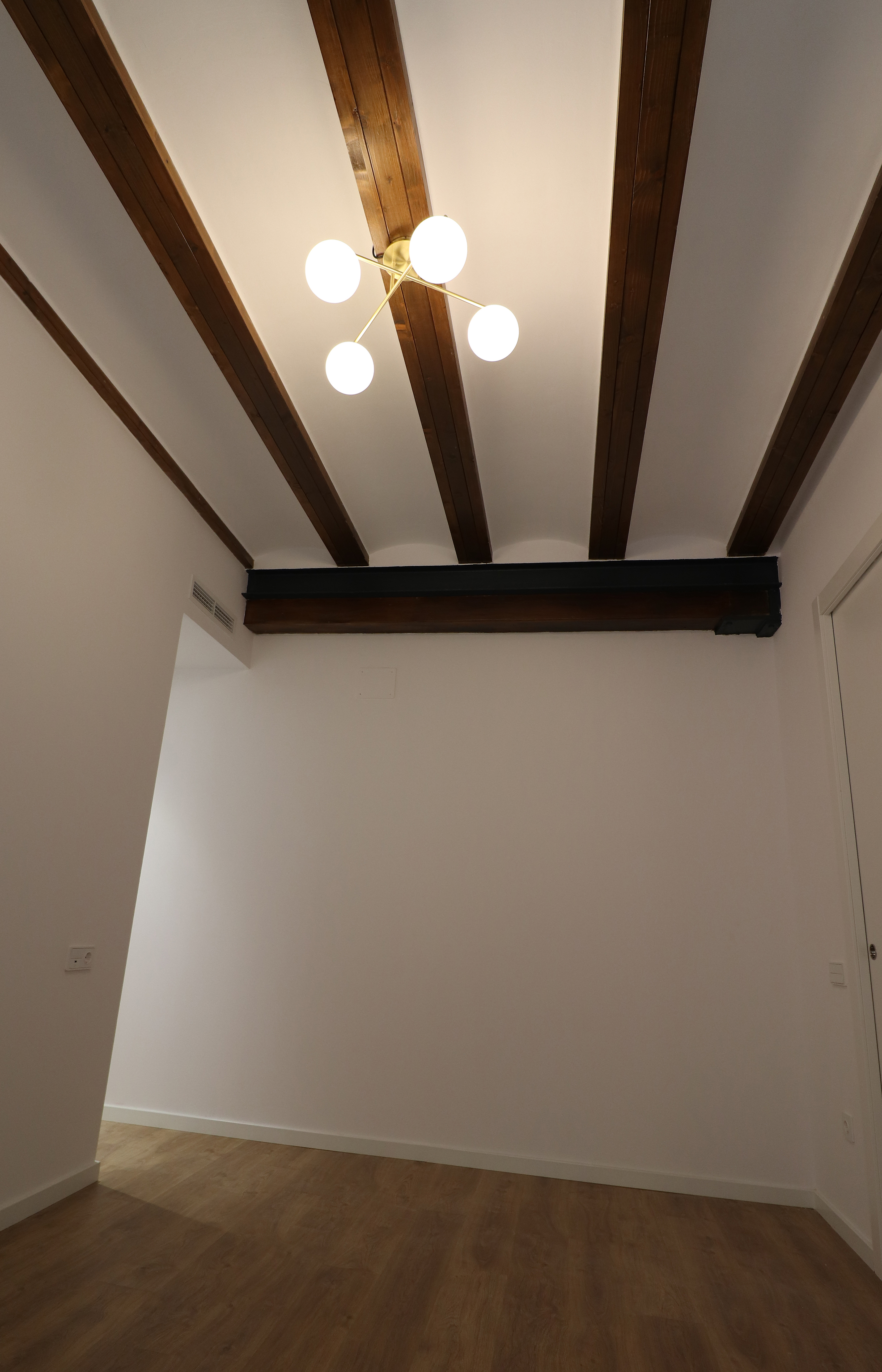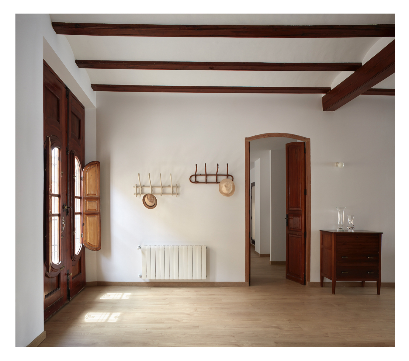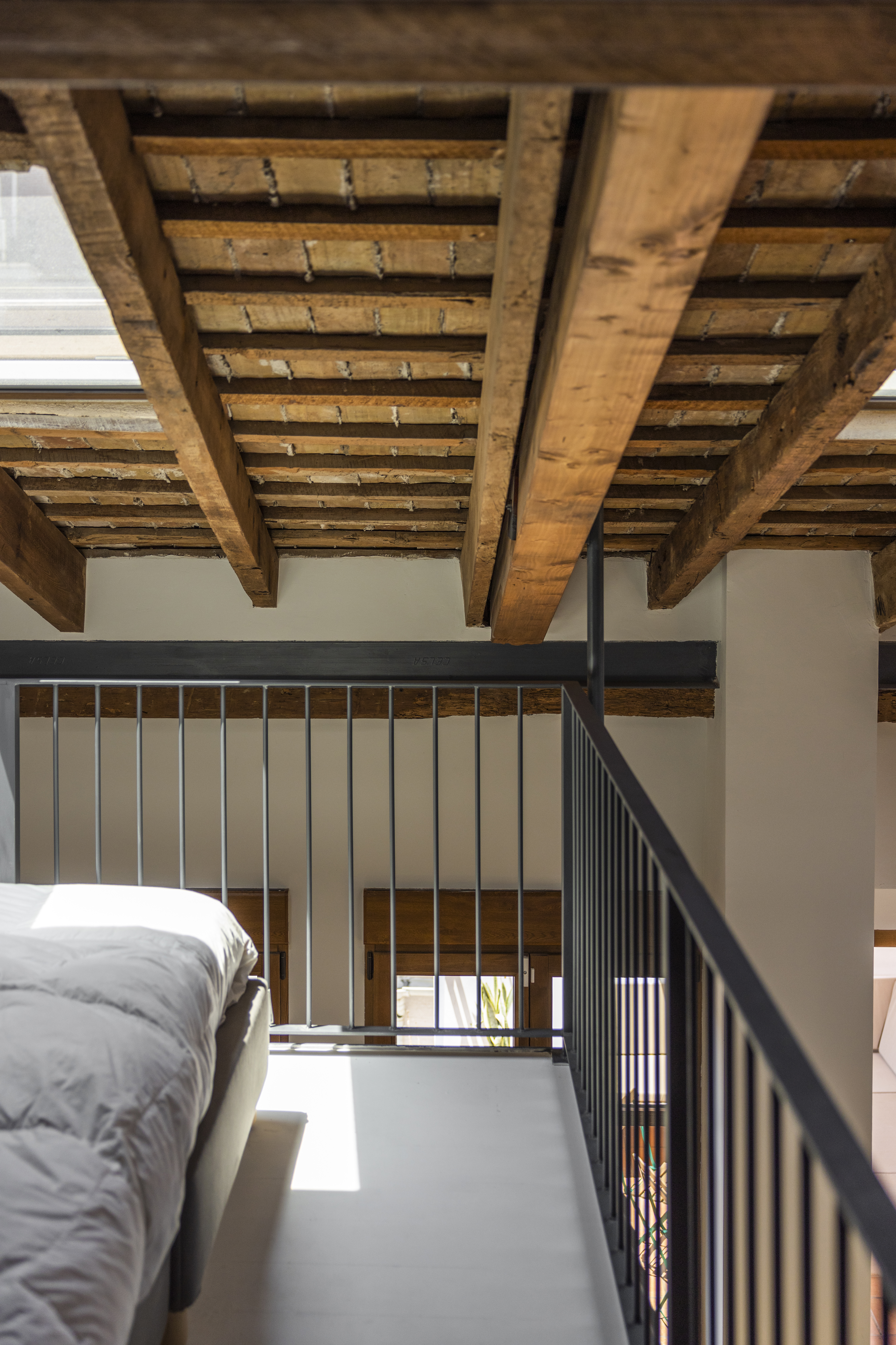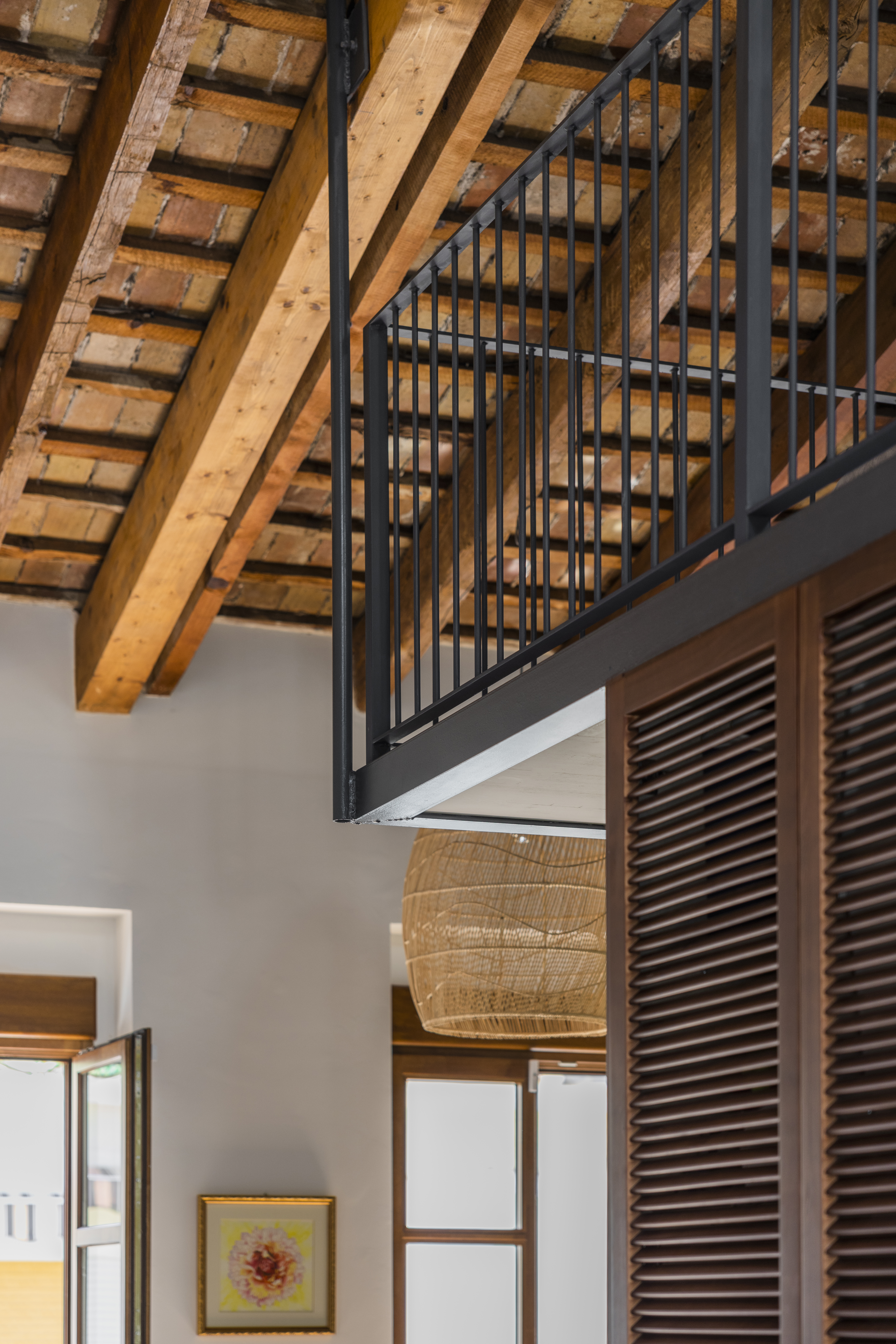 Destacamos el mantenimiento de los dinteles y jambas de los huecos interiores realizados con fábrica de ladrillo macizo, el aprovechamiento con restauración de la carpintería de madera, la utilización y reparación de vigas y viguetas de madera originales con sus revoltones en combinación con suelo laminado y revestimiento paredes y techos en blanco.