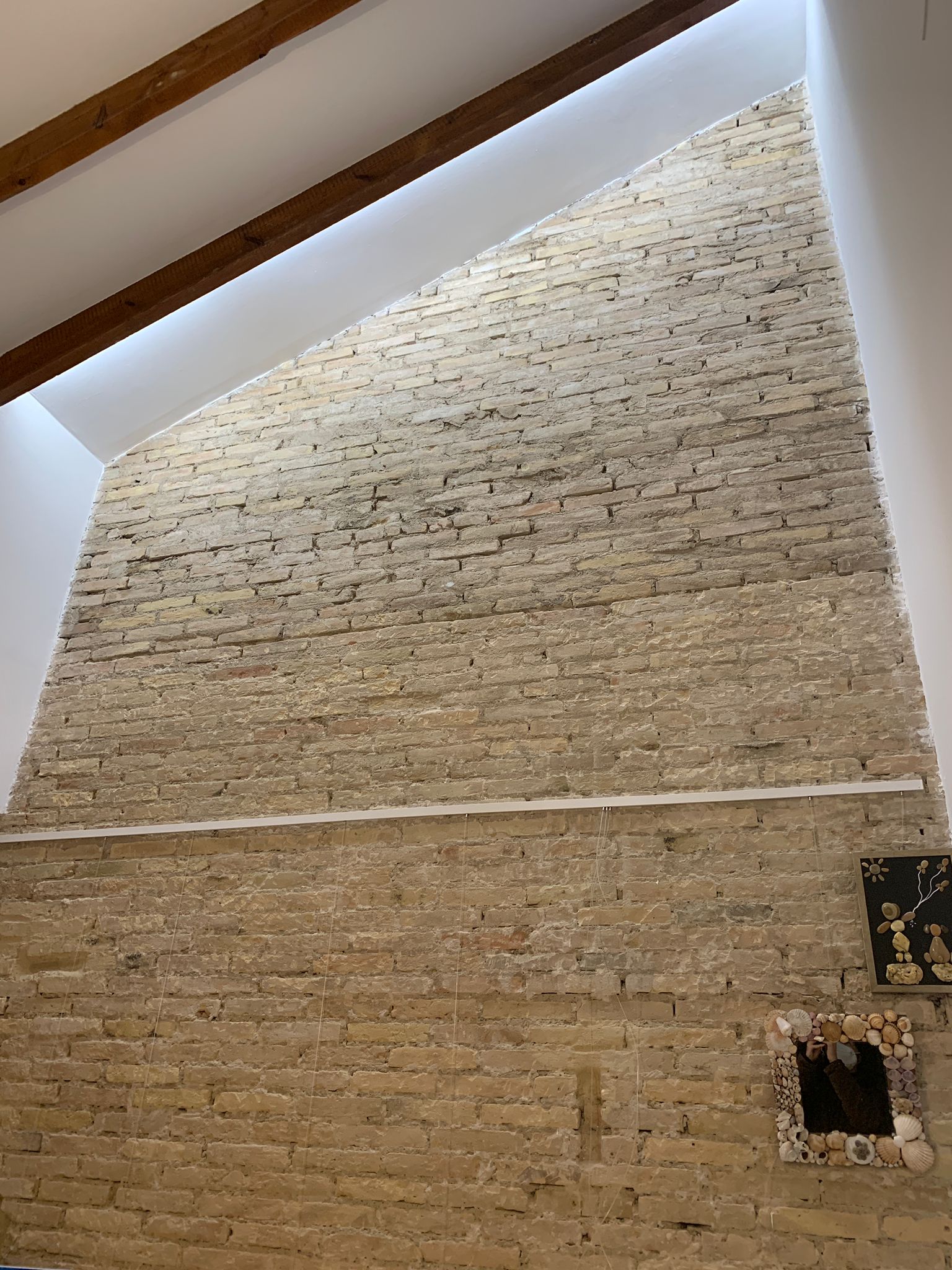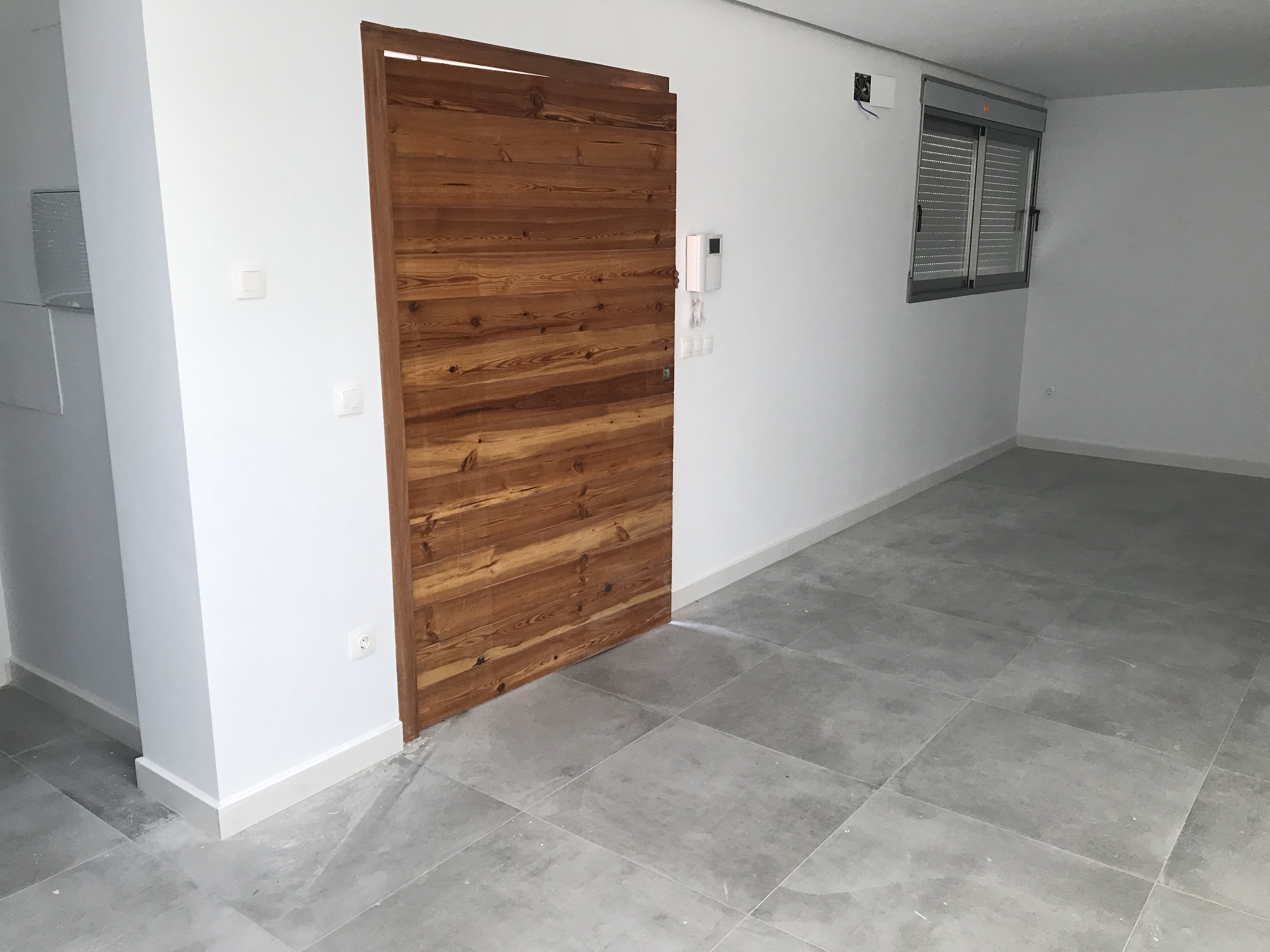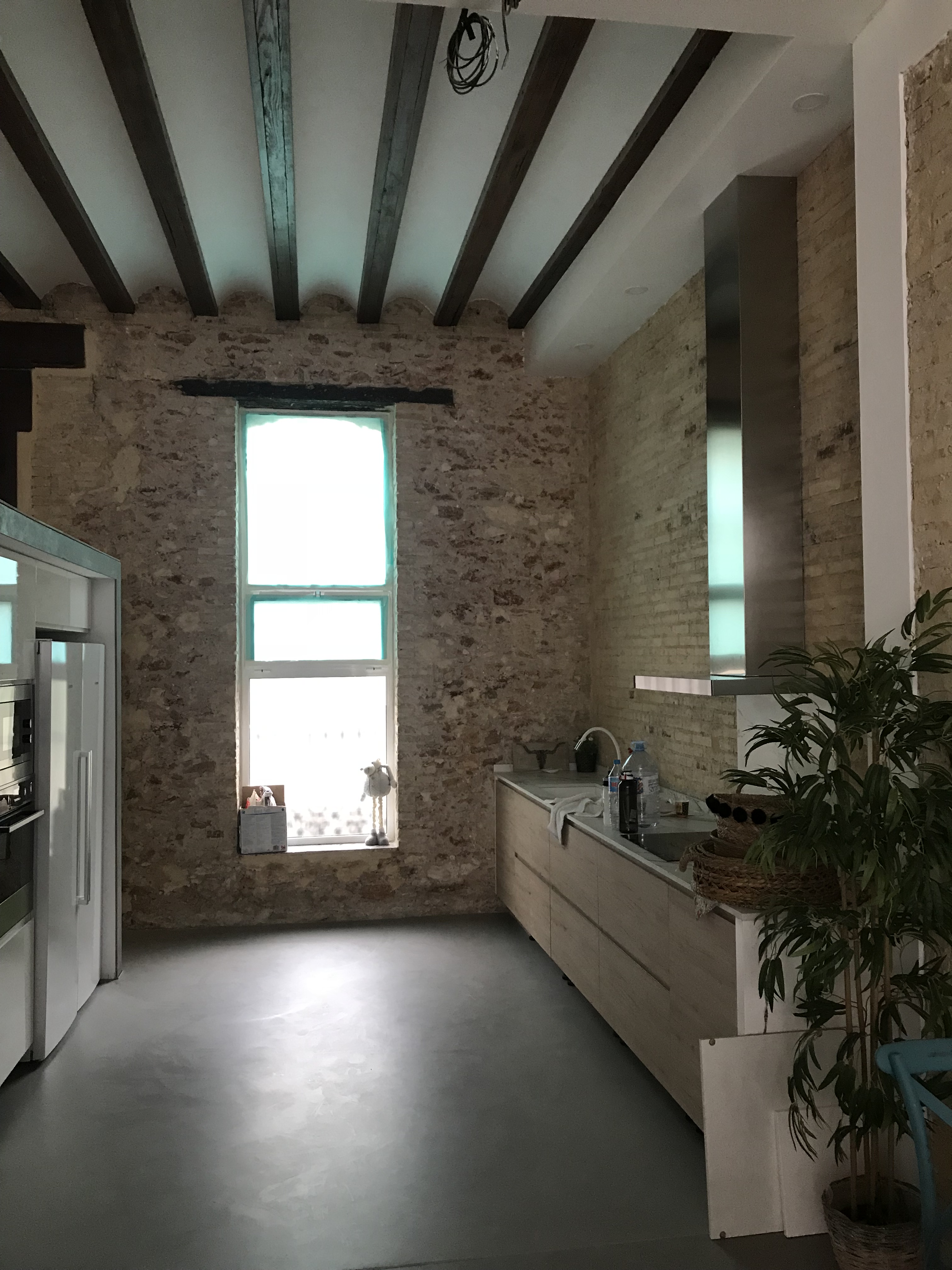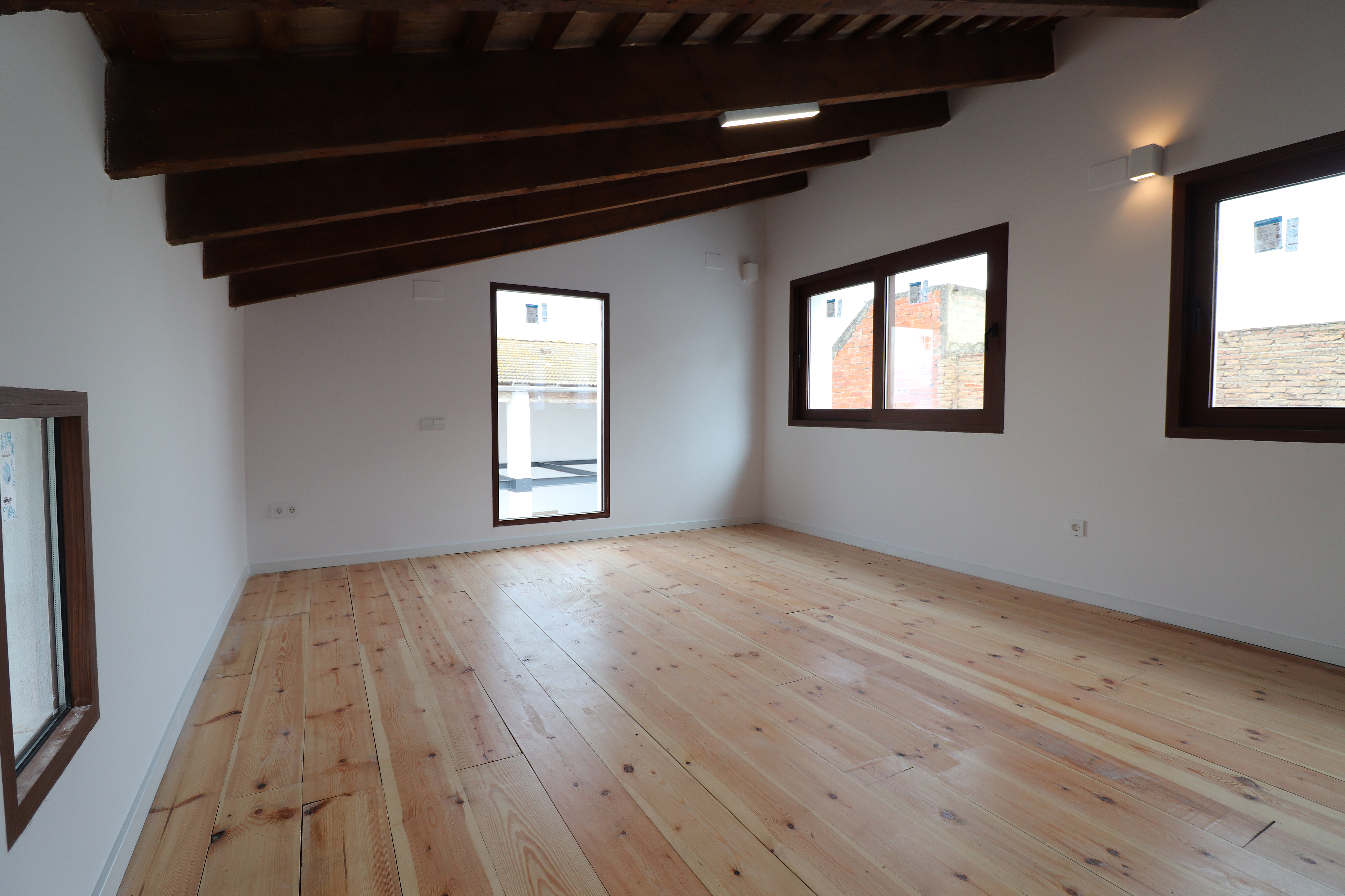 Destacamos el mantenimiento de los dinteles y jambas de los huecos interiores realizados con fábrica de ladrillo macizo, el aprovechamiento con restauración de la carpintería de madera, la utilización y reparación de vigas y viguetas de madera originales con sus revoltones en combinación con suelo laminado y revestimiento paredes y techos en blanco.
