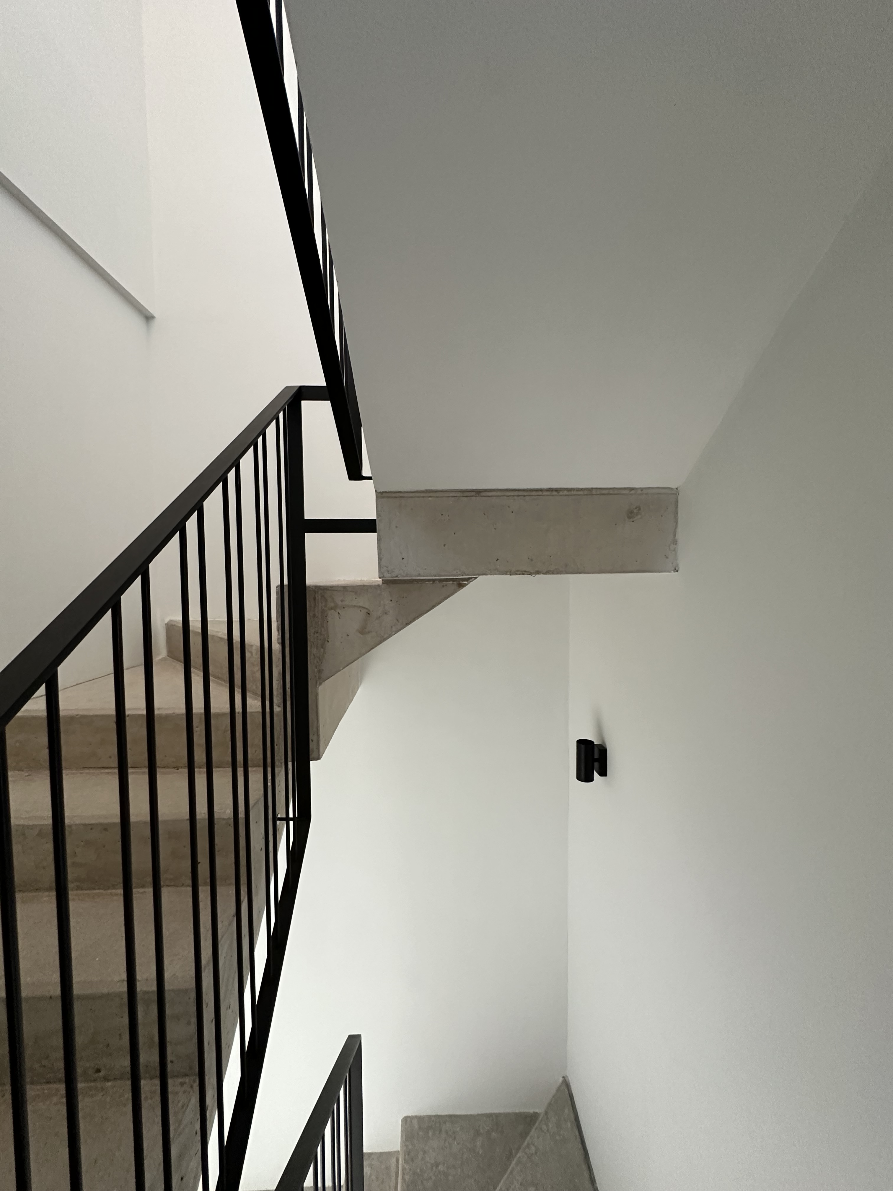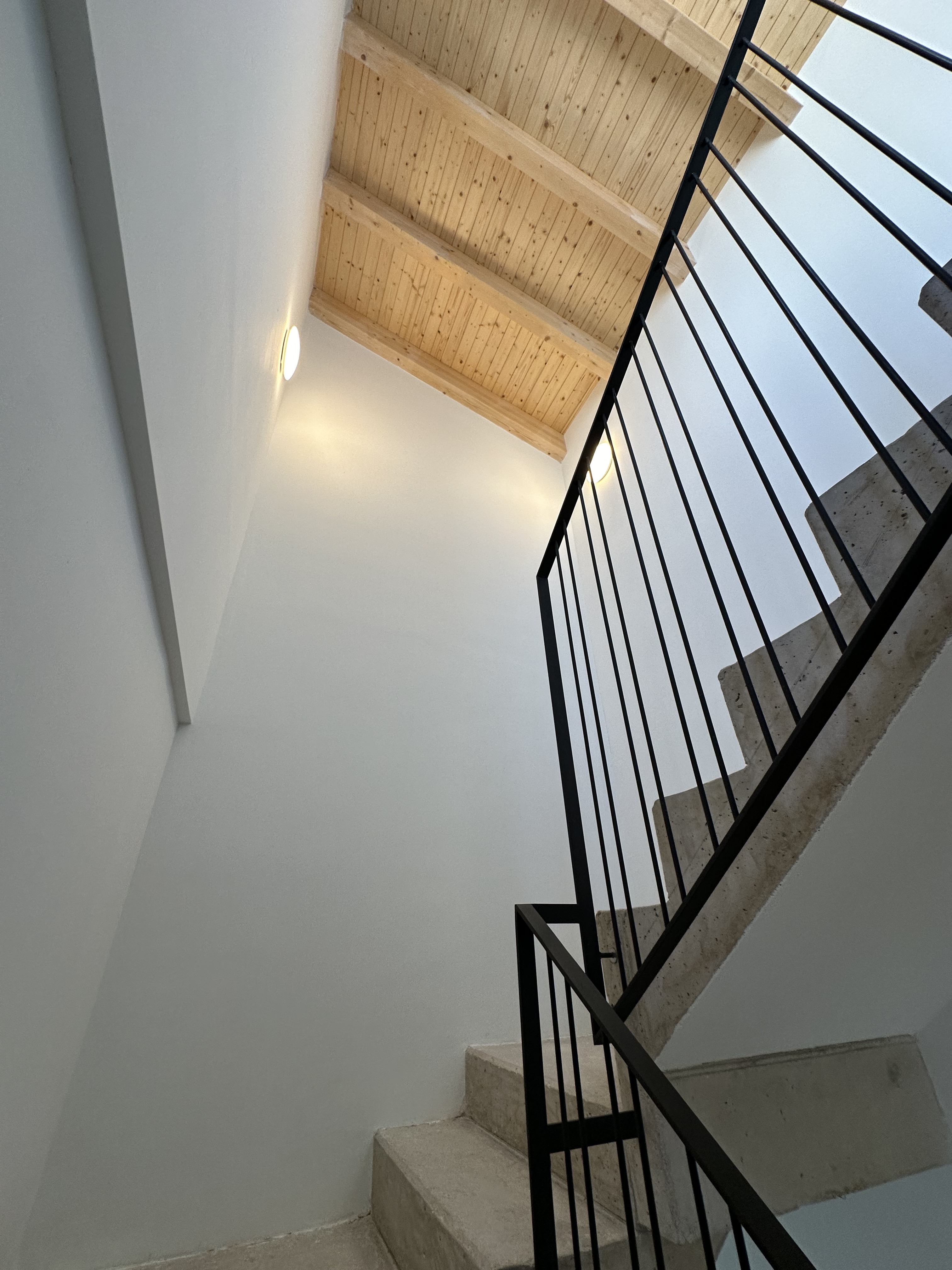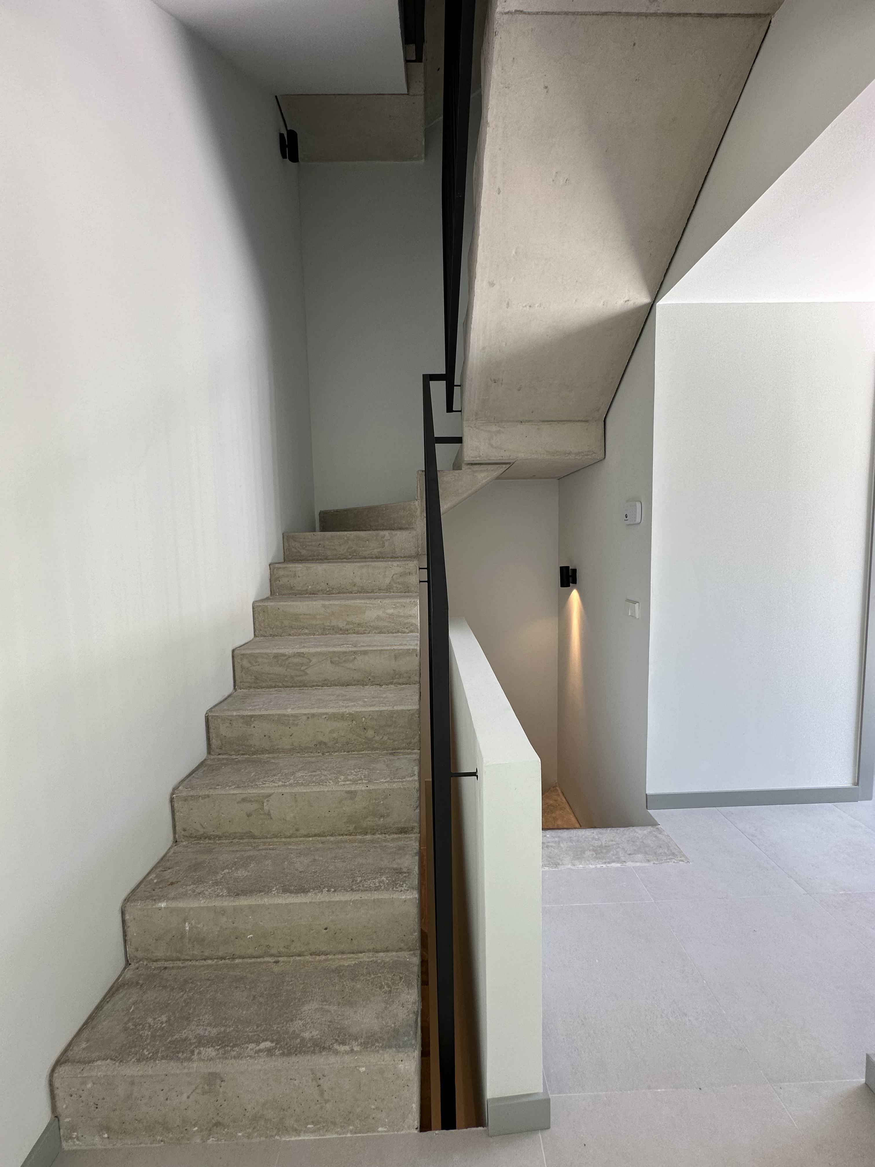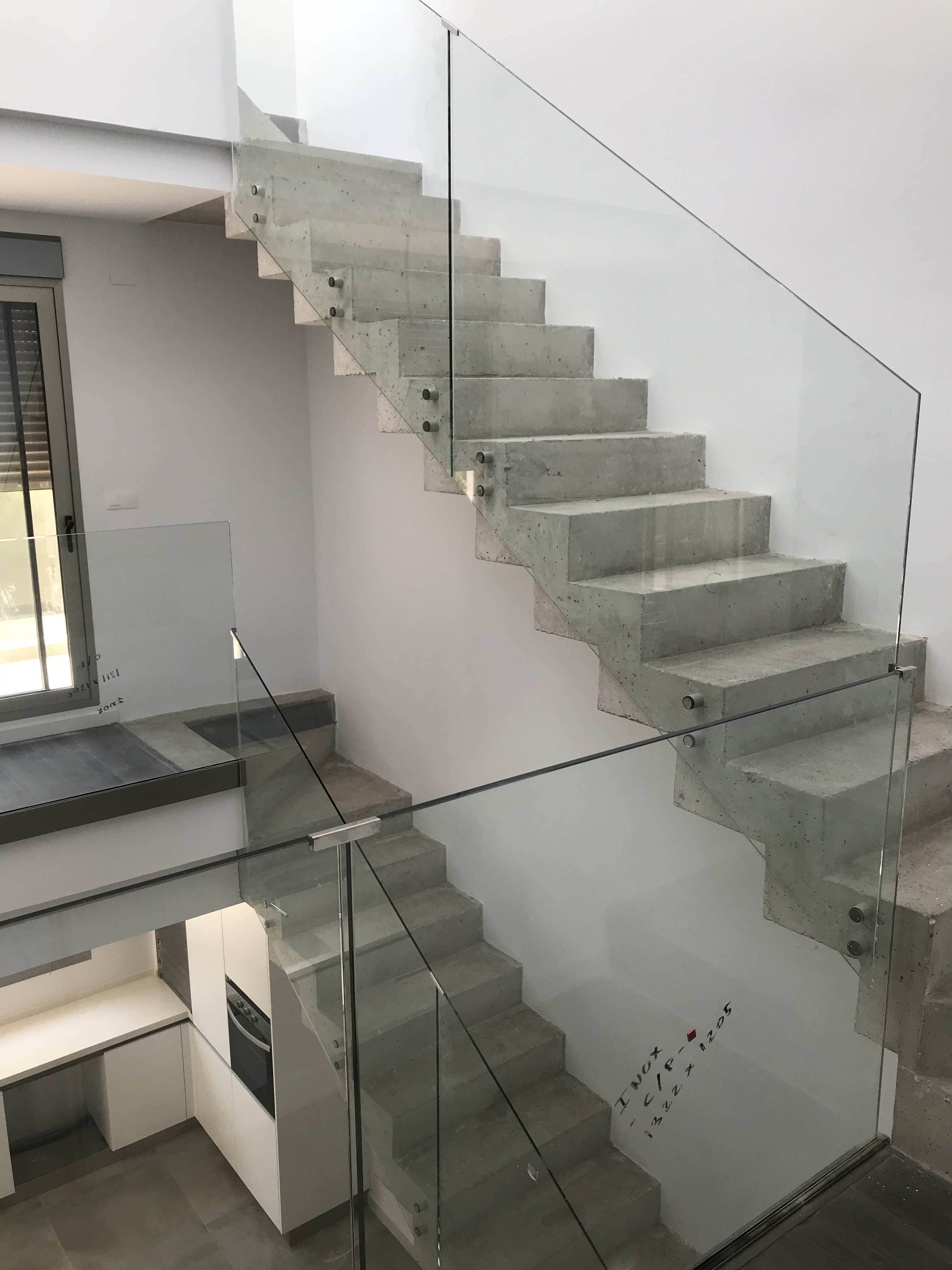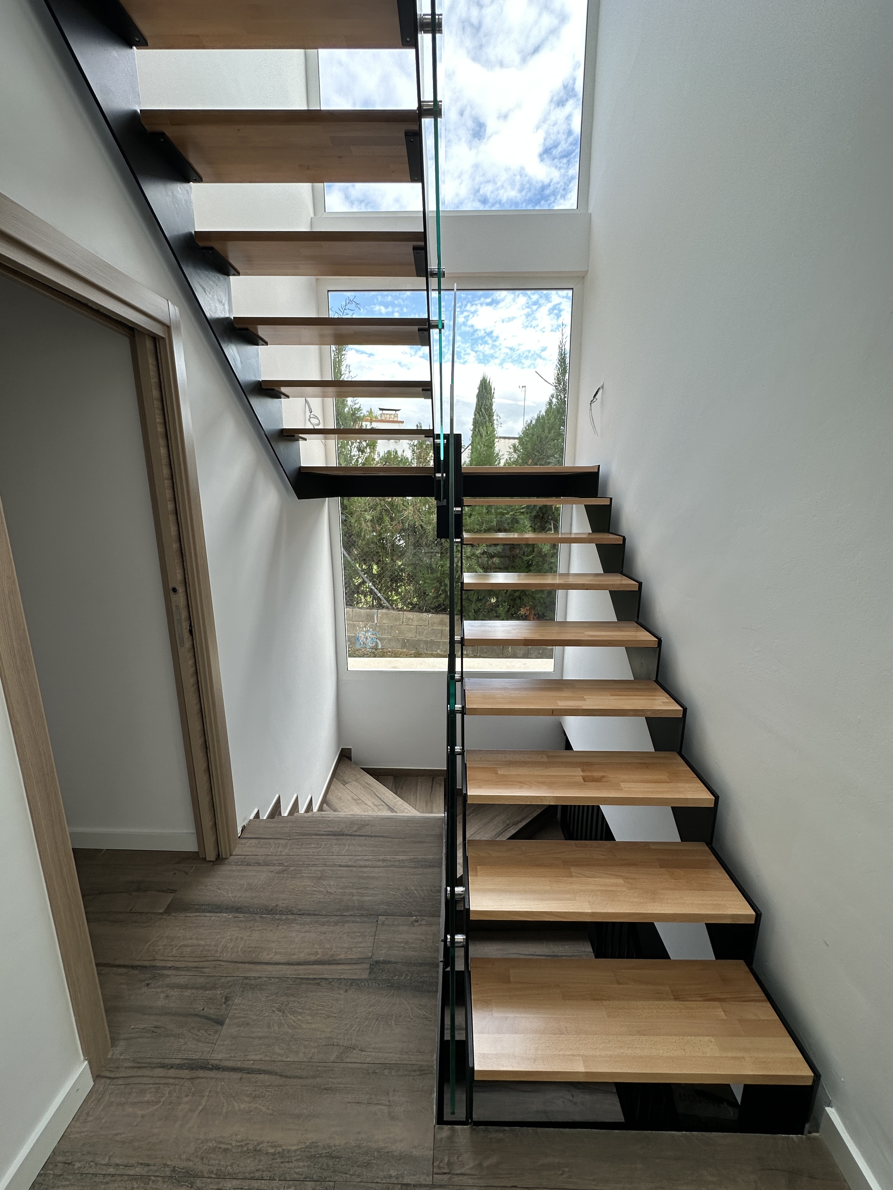 A destacar su escalera fabricada en hormigón visto, tanto losa como peldaños, y la carpintería de madera interior a medida. Contraventanas de hierro en planta baja y persianas motorizadas en planta primera.
