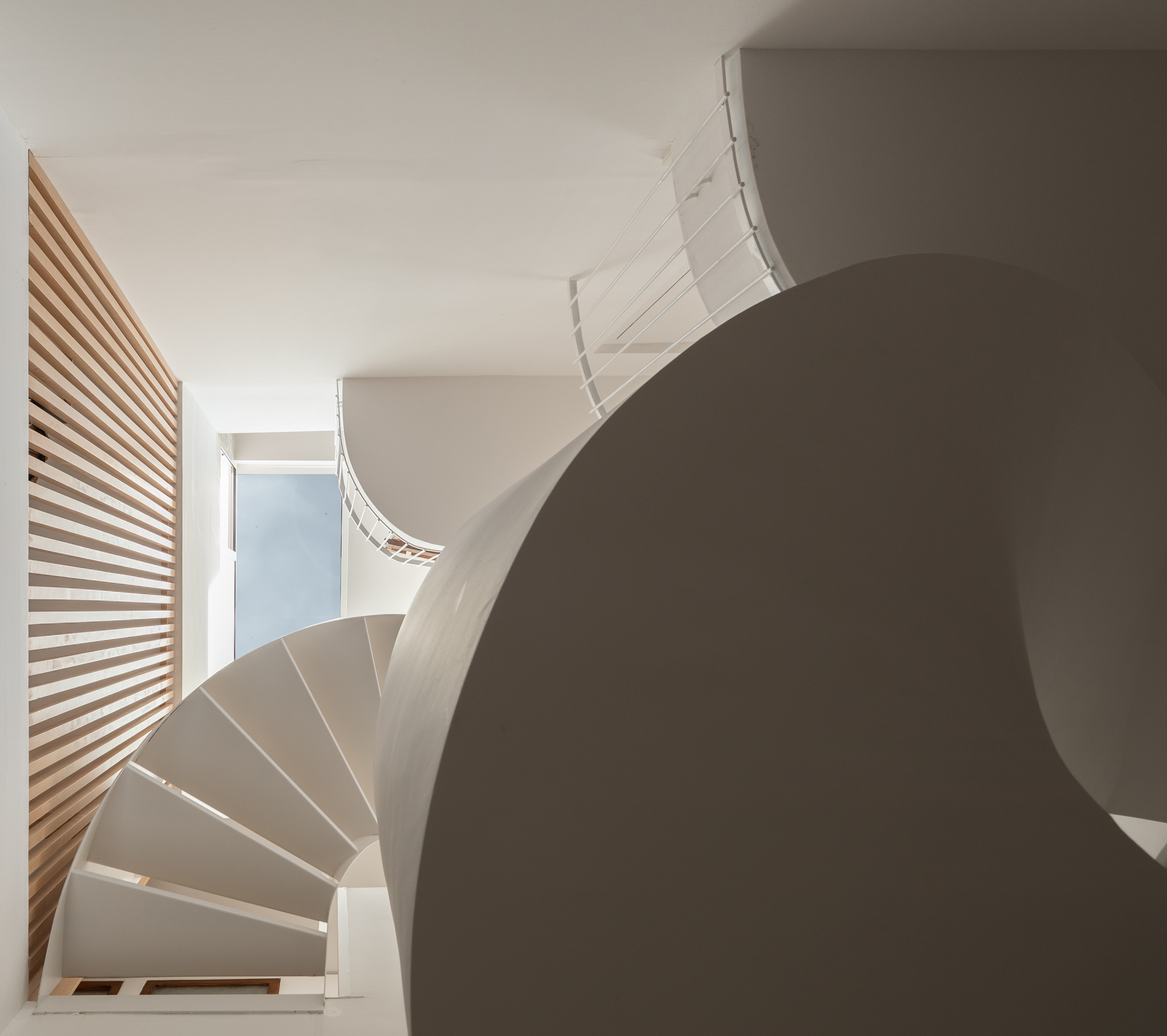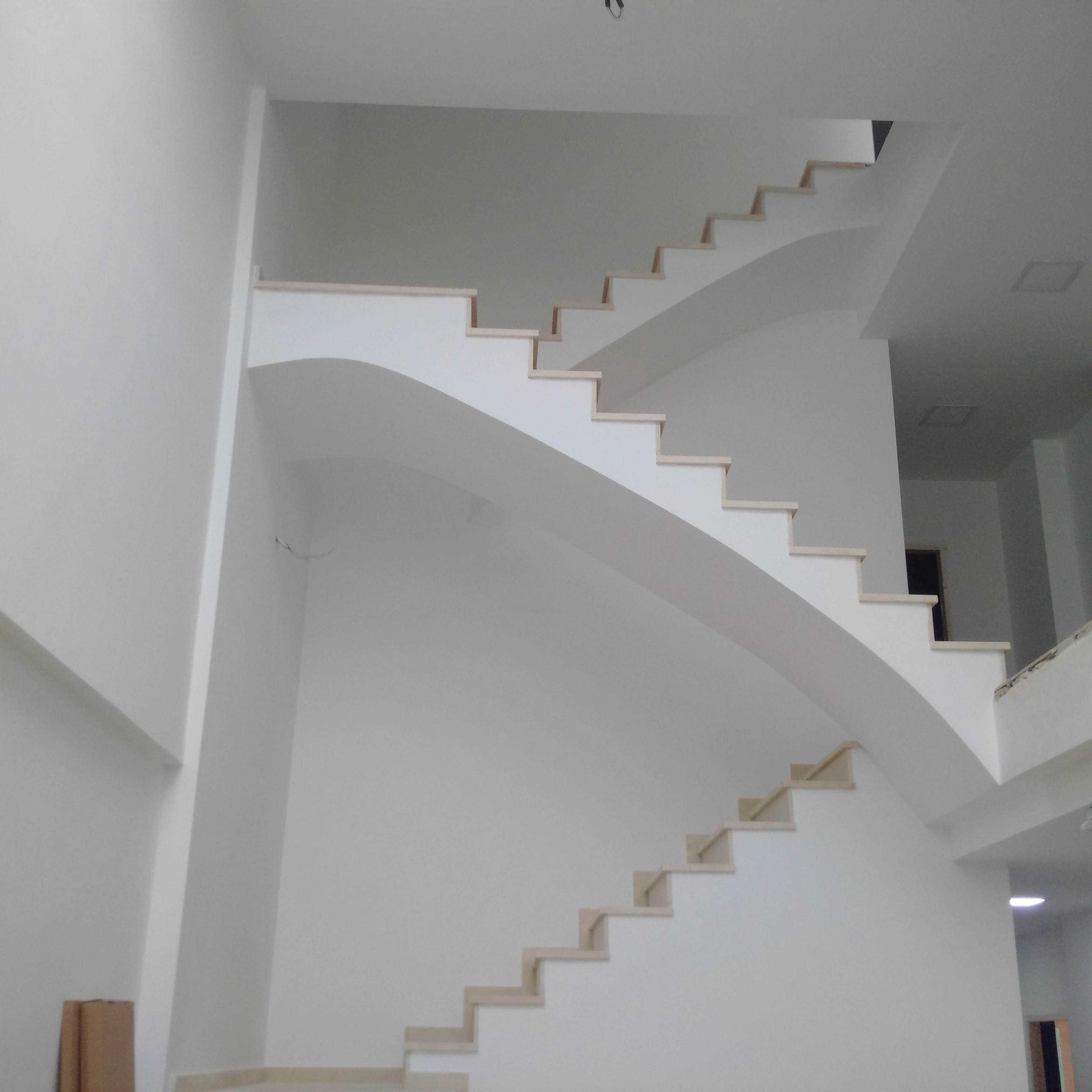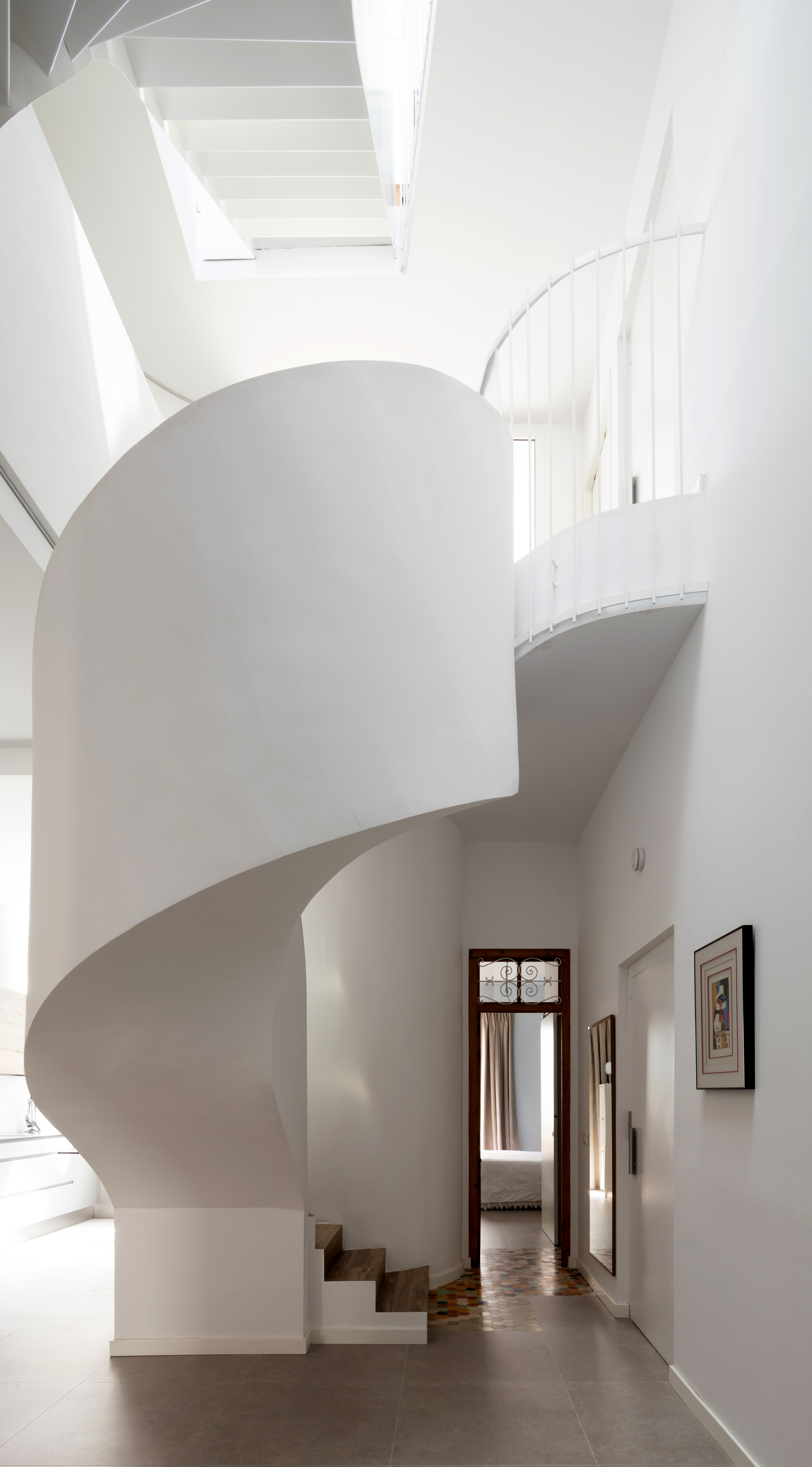 Nueva construcción de vivienda unifamiliar en dos alturas, resueltas con una escalera abierta y ovalada, con la intención de ser un elemento escultórico, que aporte visuales sobre su alrededor, teniendo en cuenta que la planta baja tiene 3,5m de altura. La vivienda se desarrolla en dos plantas de forma compacta dejando al fondo un patio en L, se dejan diferentes espacios abiertos: umbral acceso, patio posterior y cubierta plana a modo de terraza .