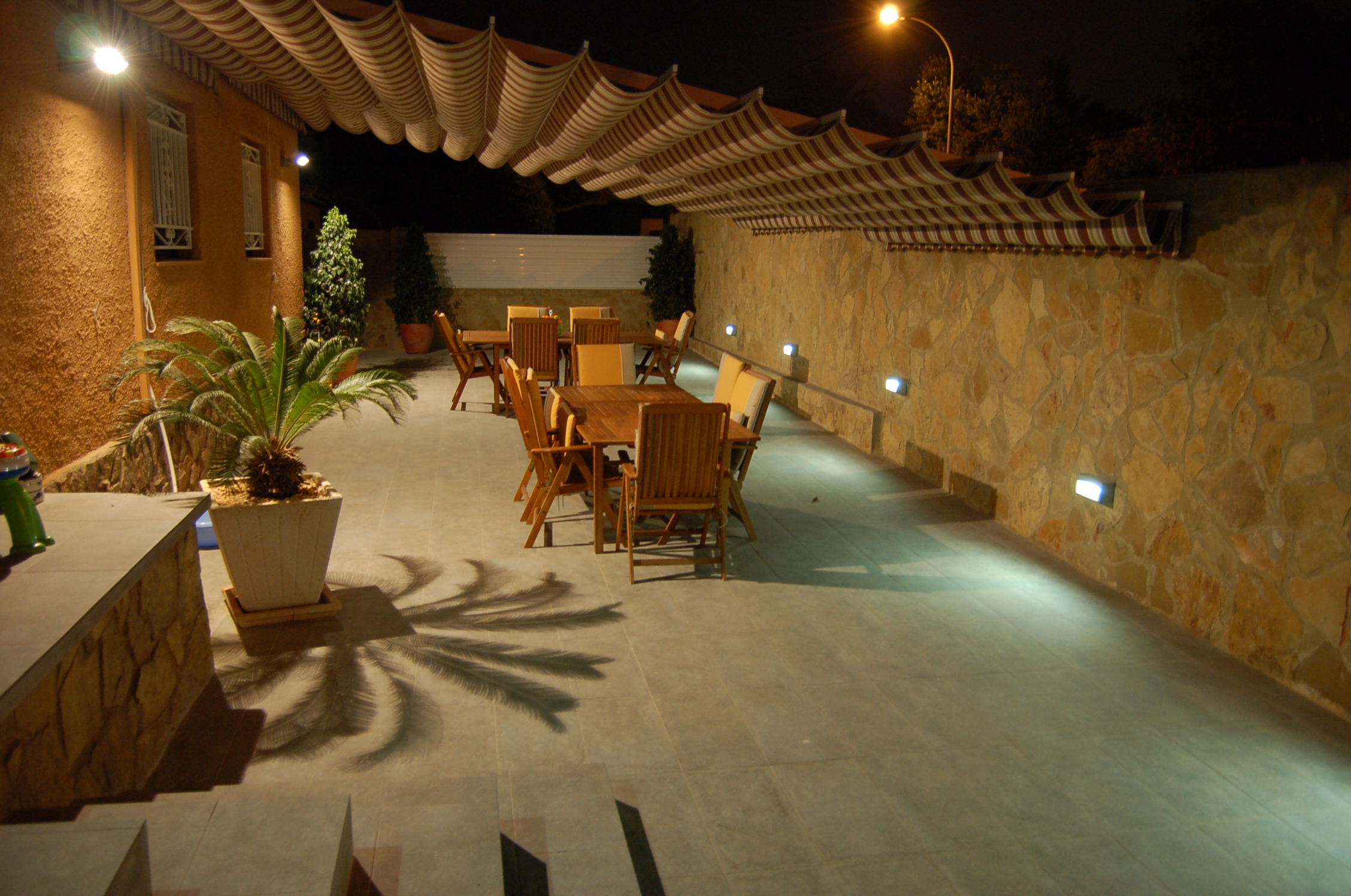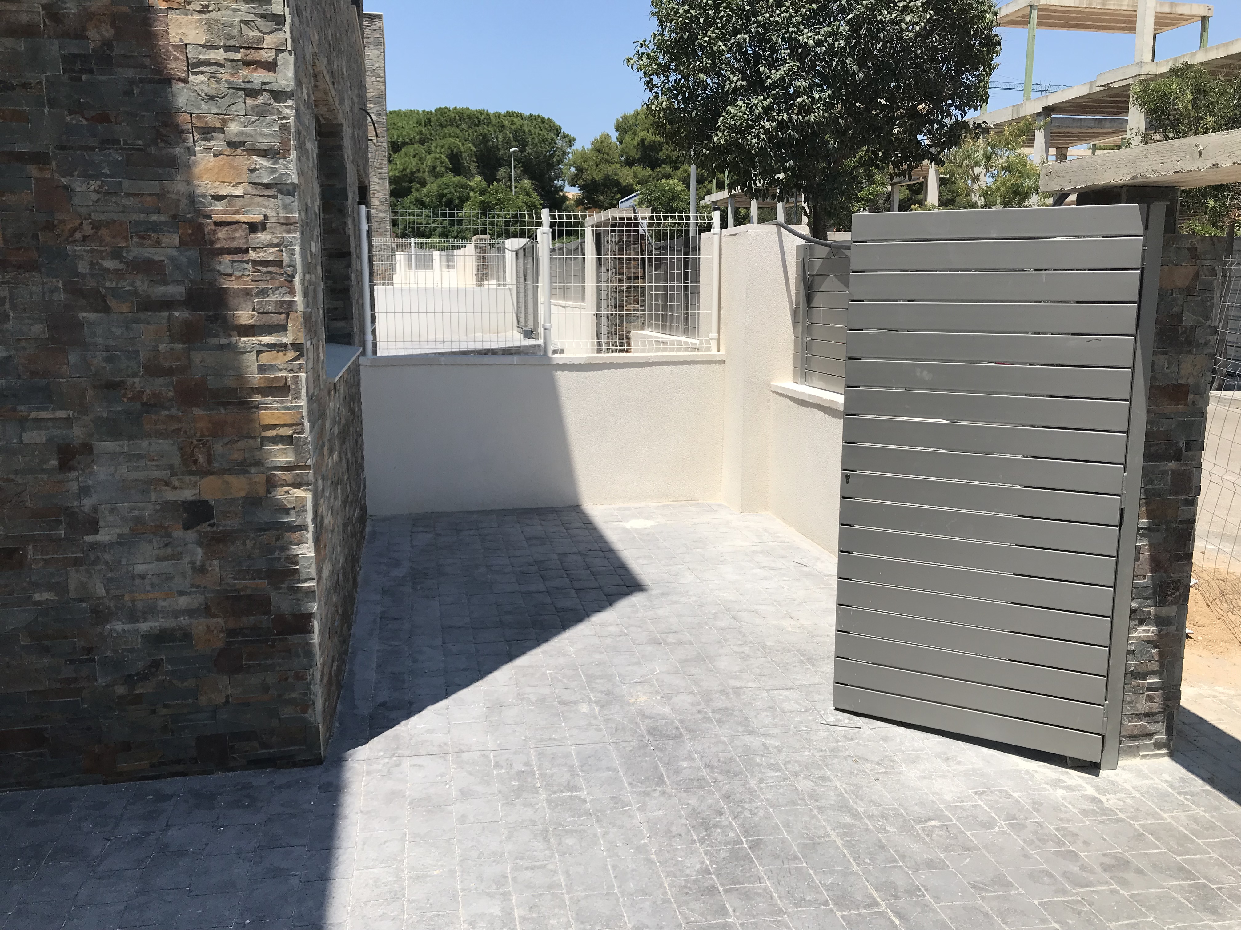 El exterior comprende una pérgola para cubrir aparcamiento, zonas pavimentadas y jardineras perimetrales.