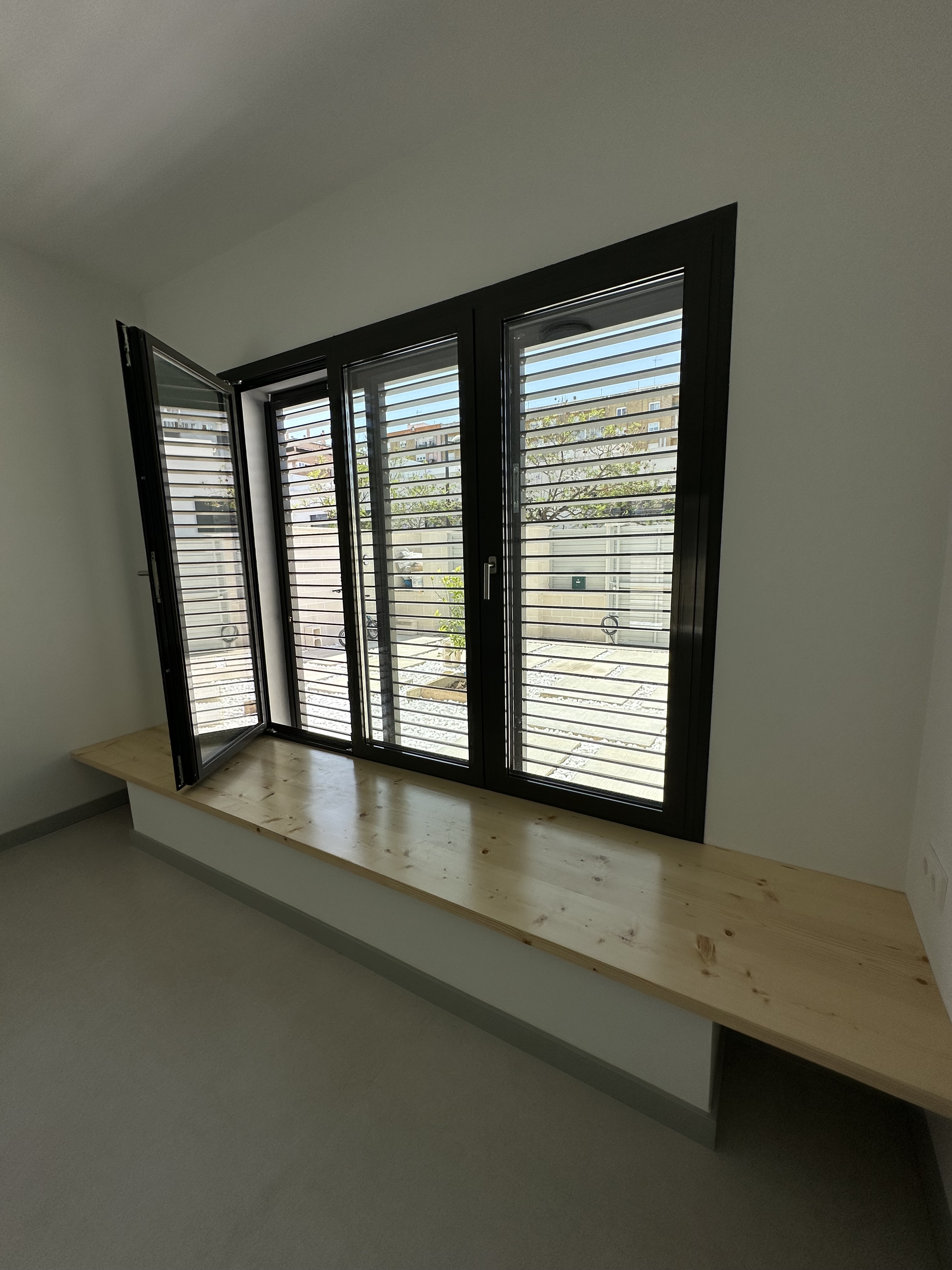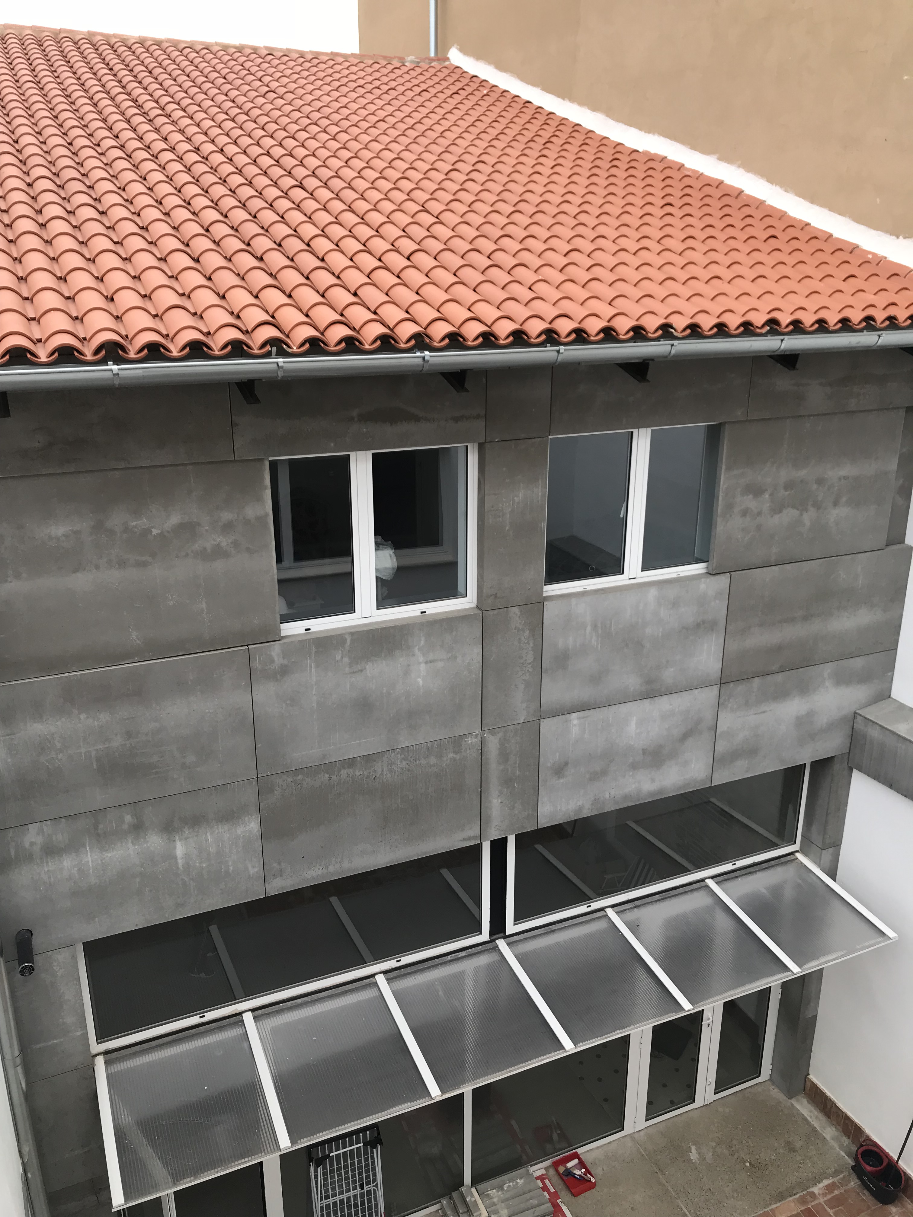 Acentuamos la composición de la fachada mediante revestimiento con placas de panel composite ¨Viroc¨ con aspecto cementado combinado con ventanales de aluminio en gris antracita, barandillas de vidrio laminar empotrado en pavimento, aplacado con baldosas de gres imitación madera y mortero monocapa en blanco. Destacamos la escalera metálica con peldaños volados revestidos en madera laminada misma composición que el suelo.