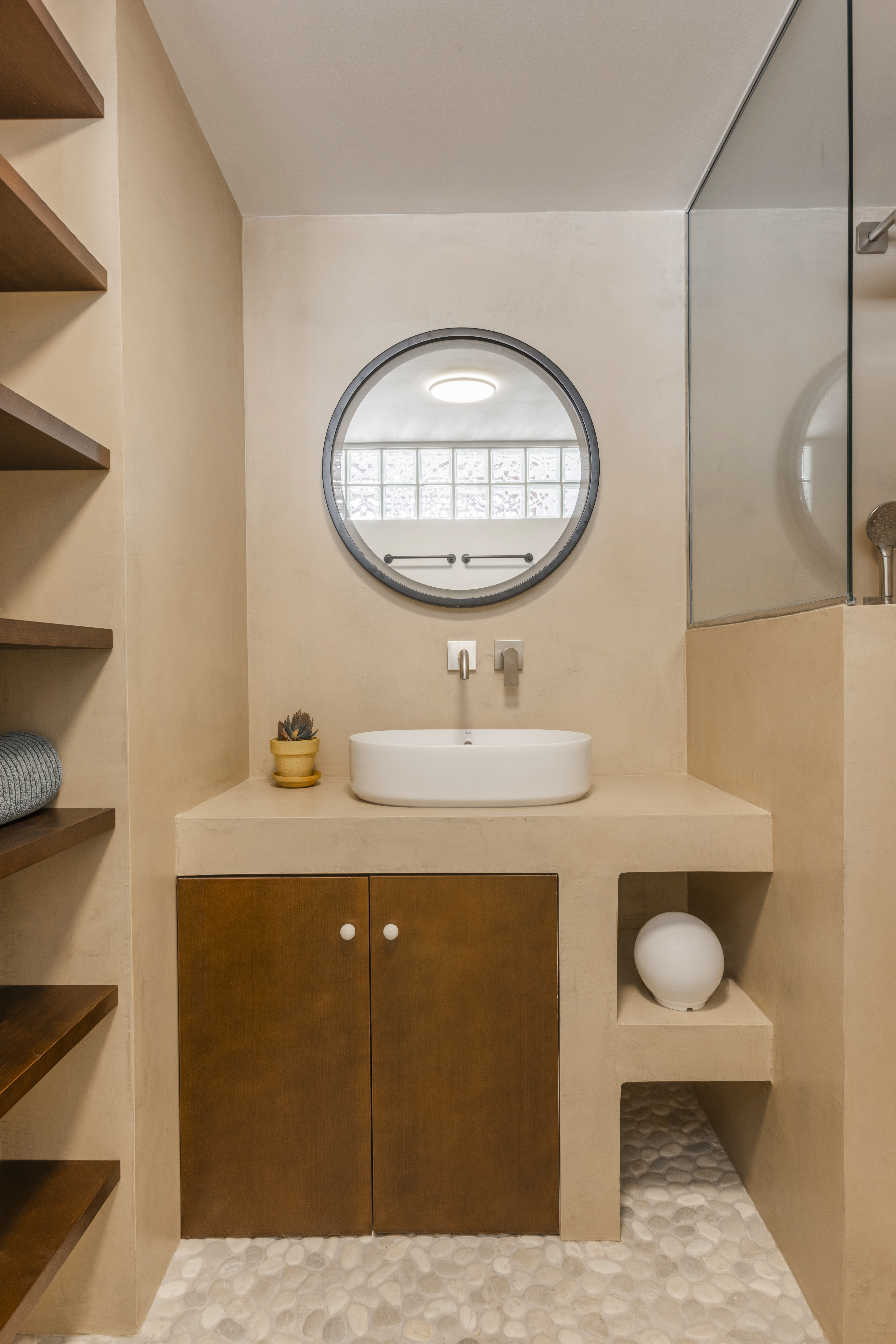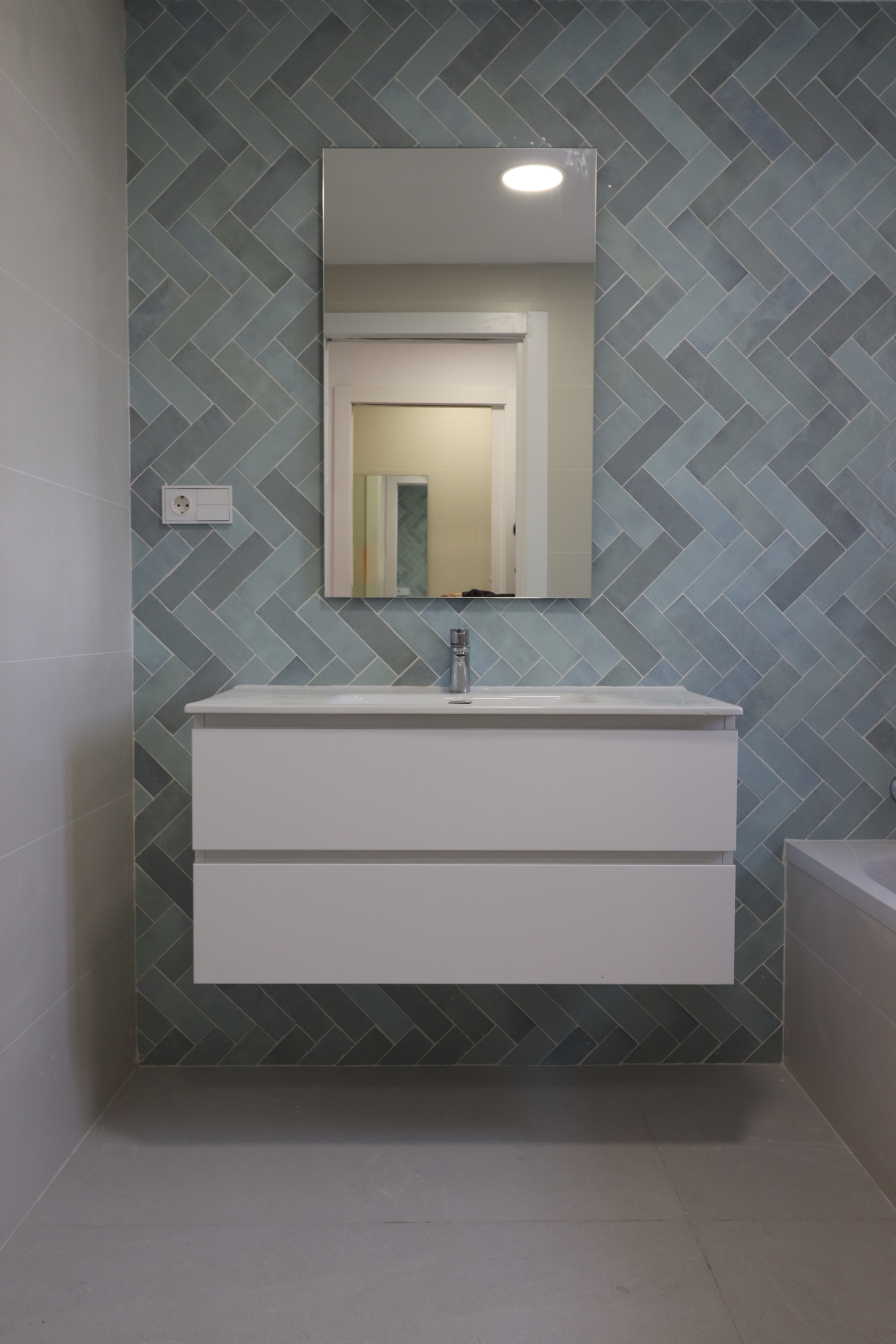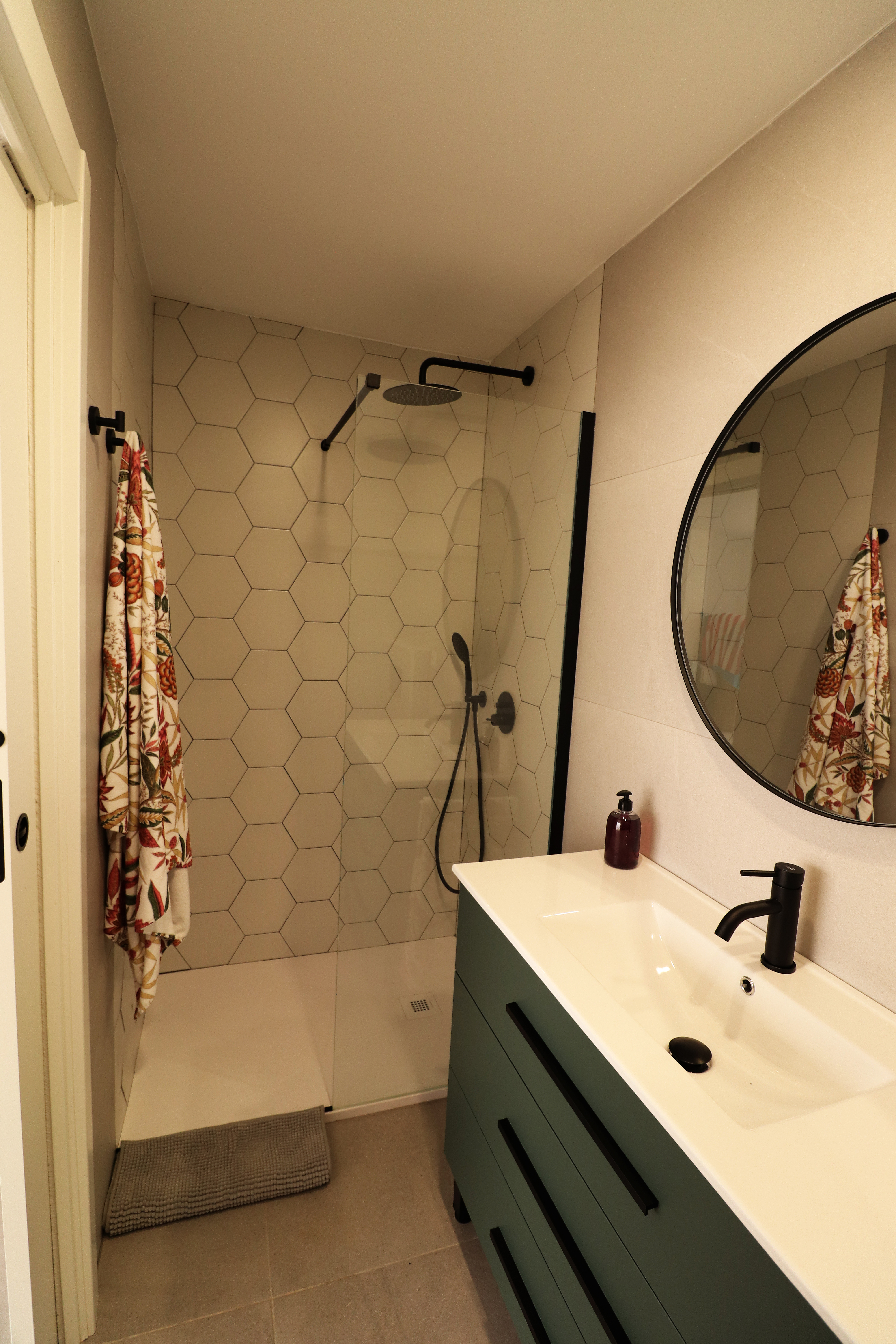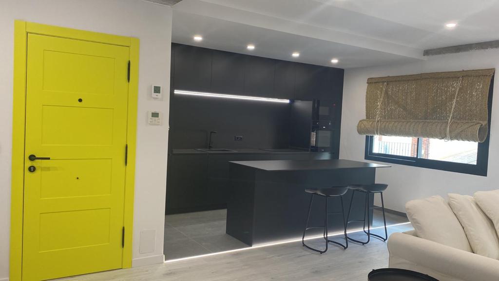 A destacar los elementos recuperados: techos y baldosas hidráulicas, colocadas tipo alfombra frente a la cocina. Paredes del baño recubiertas con microcemento, colores como verde o amarillo, en paredes y cocina.