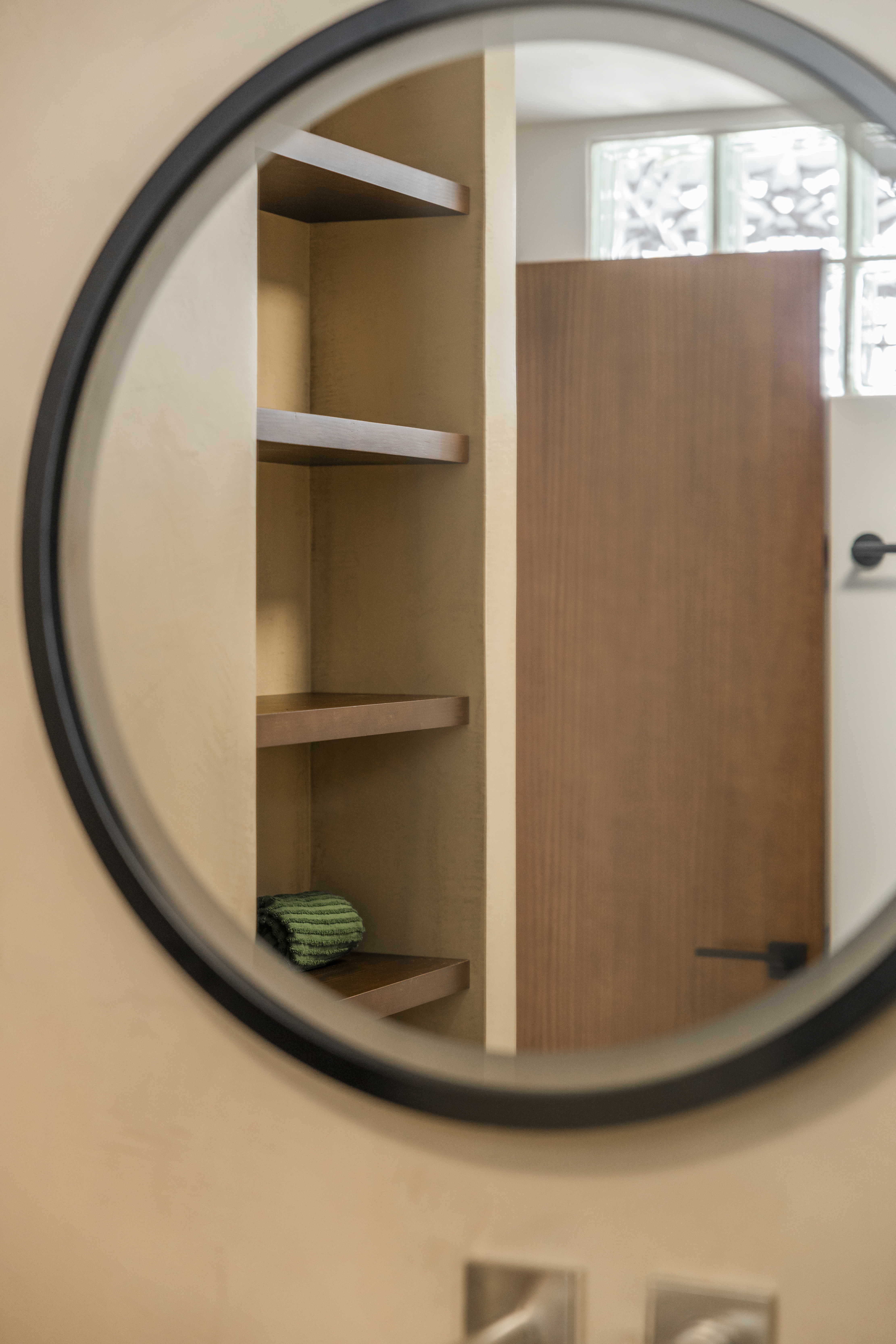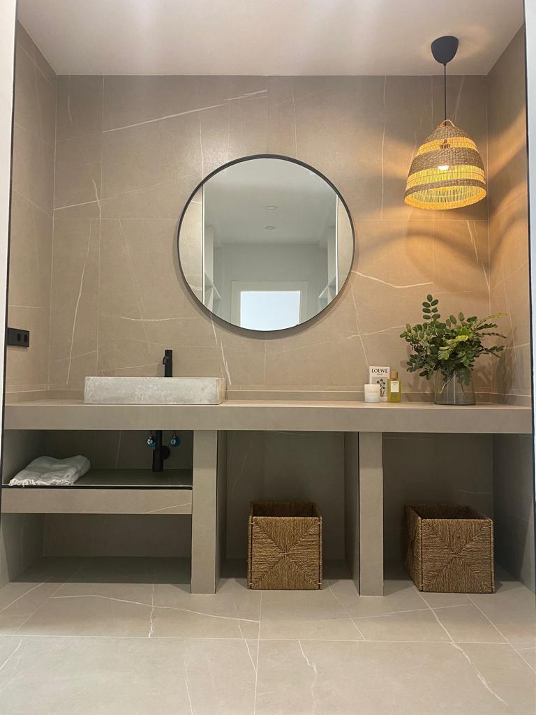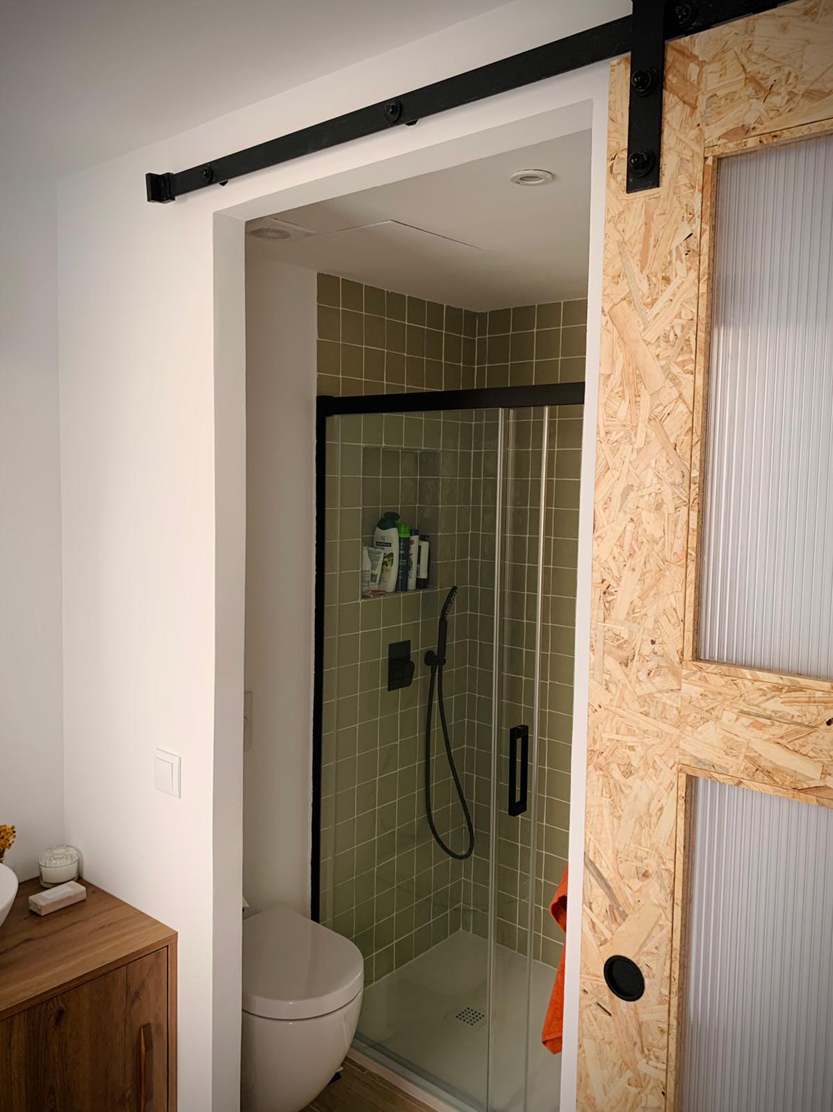 A destacar los elementos recuperados: techos y baldosas hidráulicas, colocadas tipo alfombra frente a la cocina. Paredes del baño recubiertas con microcemento, colores como verde o amarillo, en paredes y cocina.