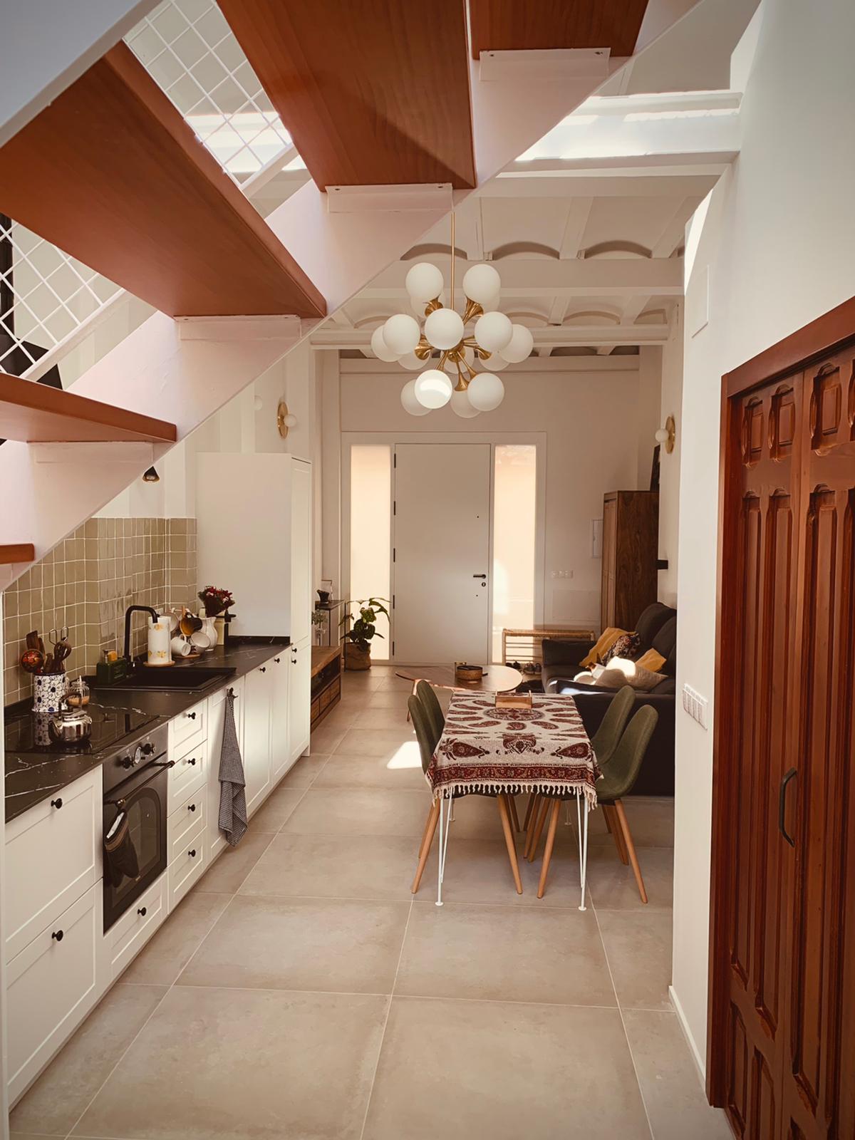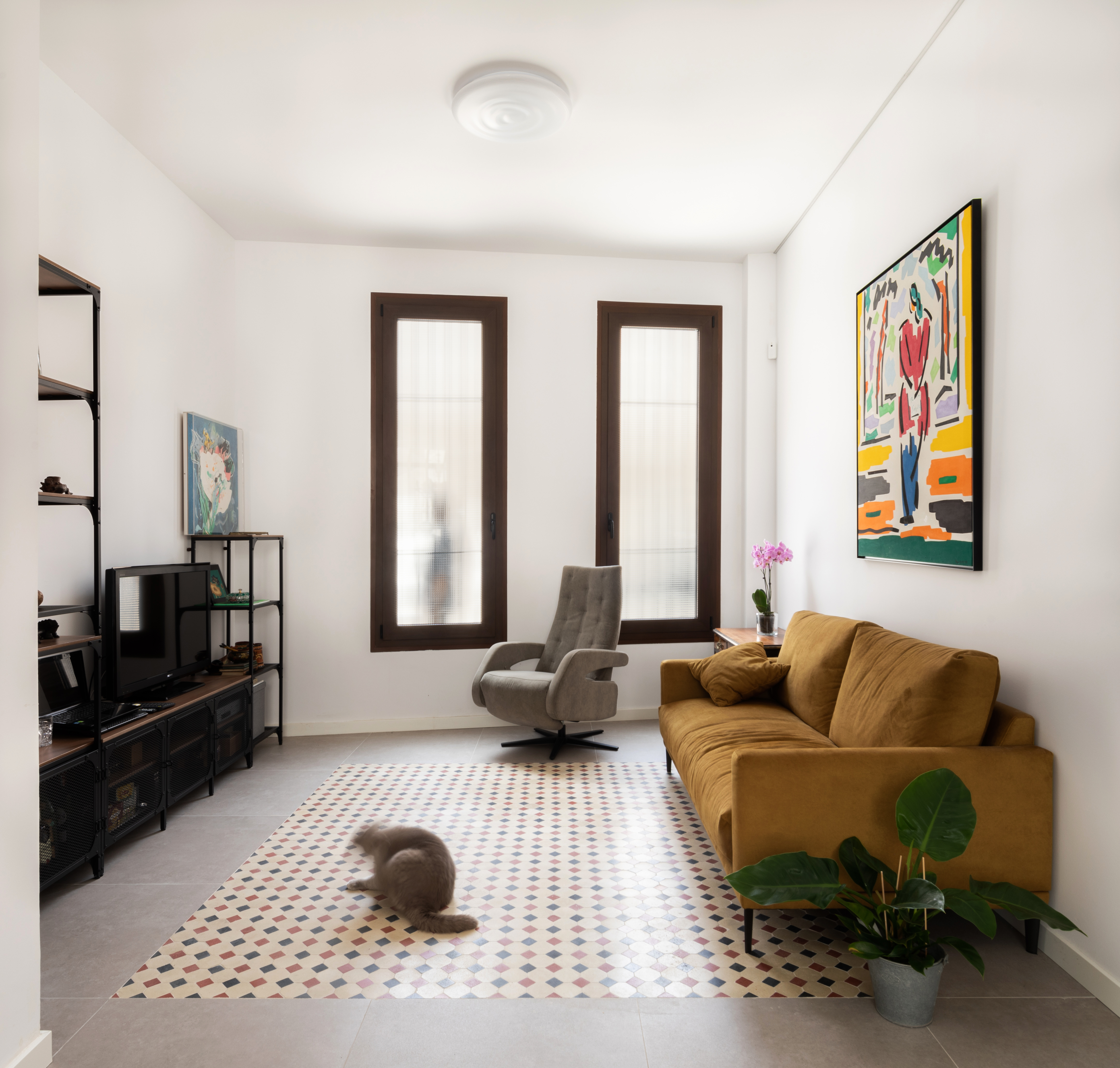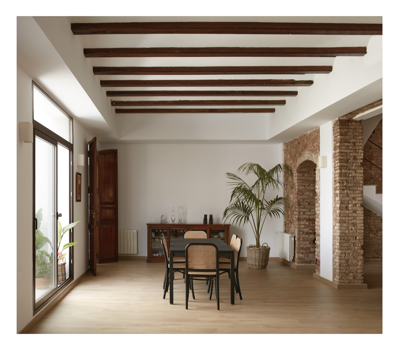 La actuación comprendió la adecuación de la vivienda a la normativa vigente, con el mantenimiento de las características originales de la fachada al igual que las viviendas contiguas. Recuperación de mosaico original, ladrillo original en paredes y pilares y vigas de madera.
