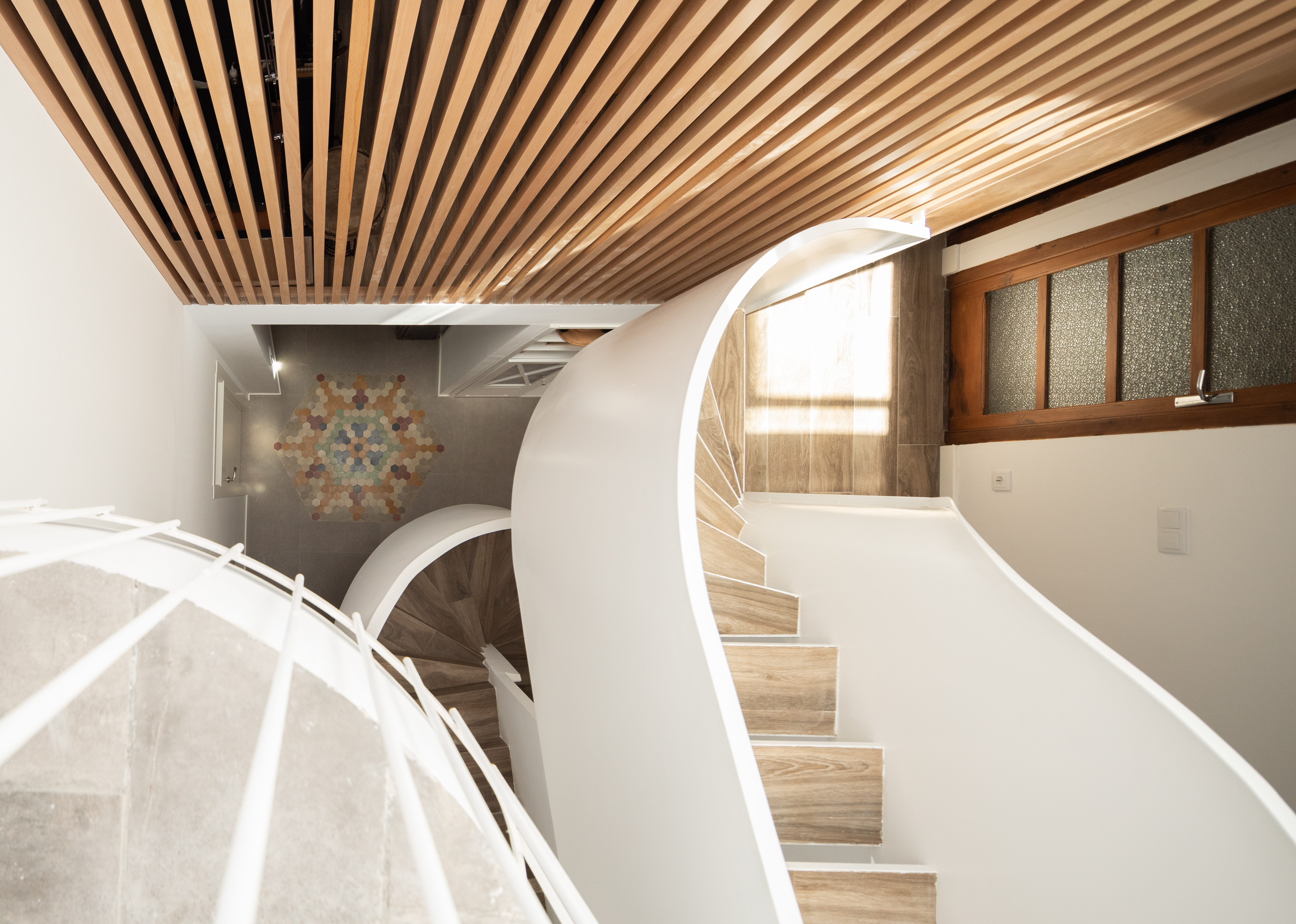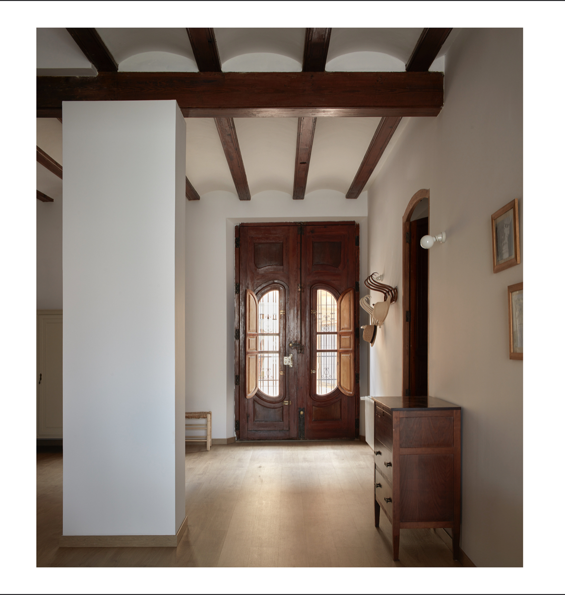 La actuación comprendió la demolición de toda la vivienda, dejando la envolvente exterior (muros de mampostería), la realización de la nueva distribución interior de la vivienda en las dos plantas, renovación de la envolvente térmica para mejorar el aislamiento térmico y recuperación de elementos y distribuciones para devolver la configuración original de la edificación. Para asegurar la estabilidad de la estructura se eliminaron refuerzos metálicos existentes para volver a dejar un forjado con su configuración original con viguetas de madera y revoltones. Toda la actuación pretendió recuperar el espíritu original de la vivienda con los materiales originales y sistemas constructivos actuales, dotándola de alguna pincelada actual como su imponente escalera metálica con barandillas de vidrio. A destacar su gran isla con voladizo de 1,20m.