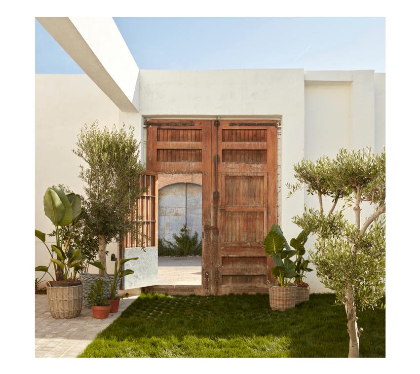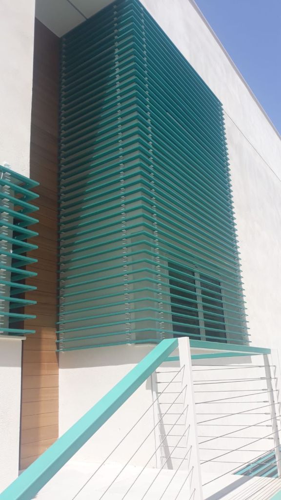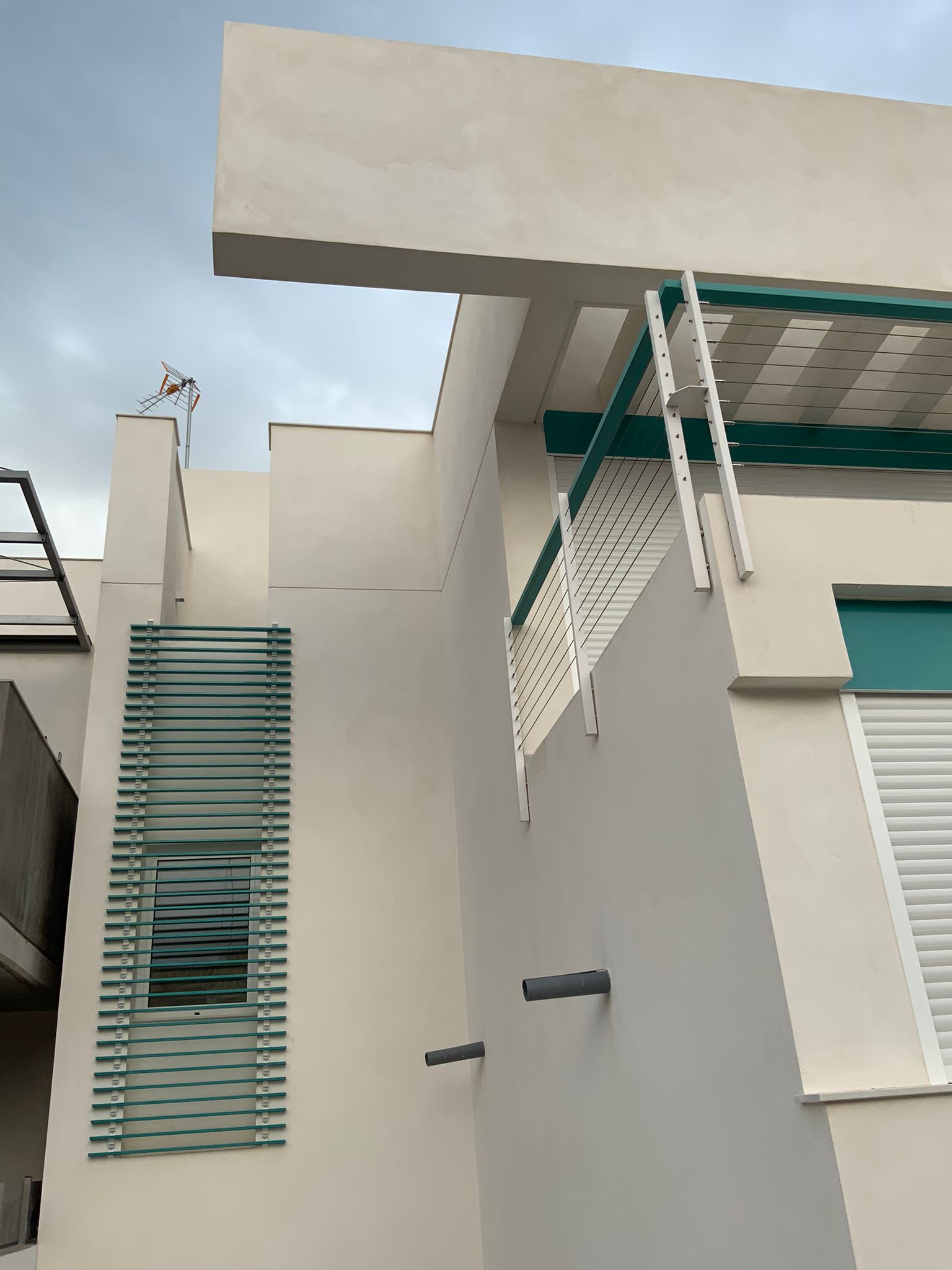 Podemos acentuar el volumen exterior con tonos turquesas tanto en lamas sobre ventanas como en tirantes de acero formado el vallado. Y la composición de la puerta de entrada realizada en madera de iroko con una altura de ocho metros abarcando dos plantas.