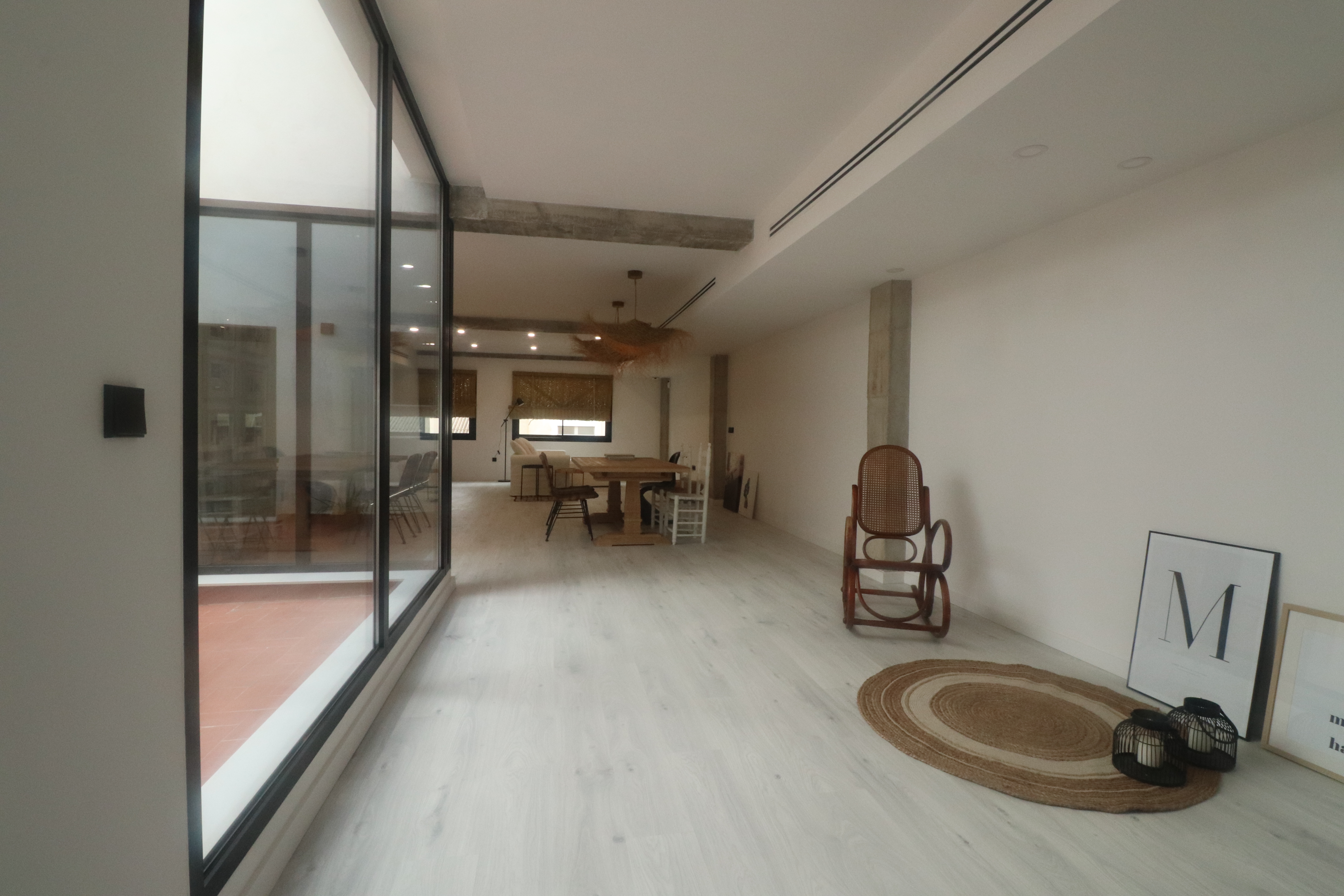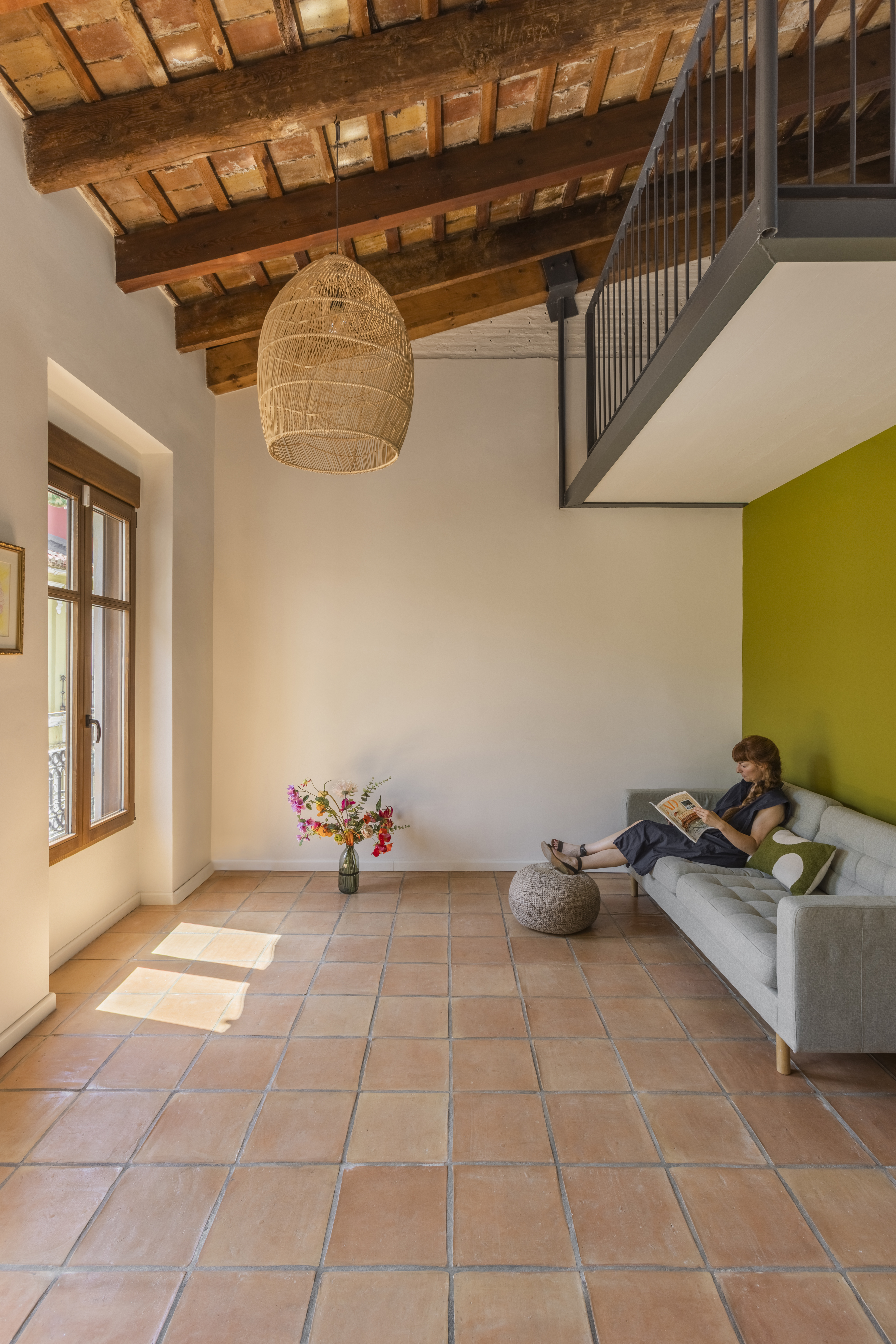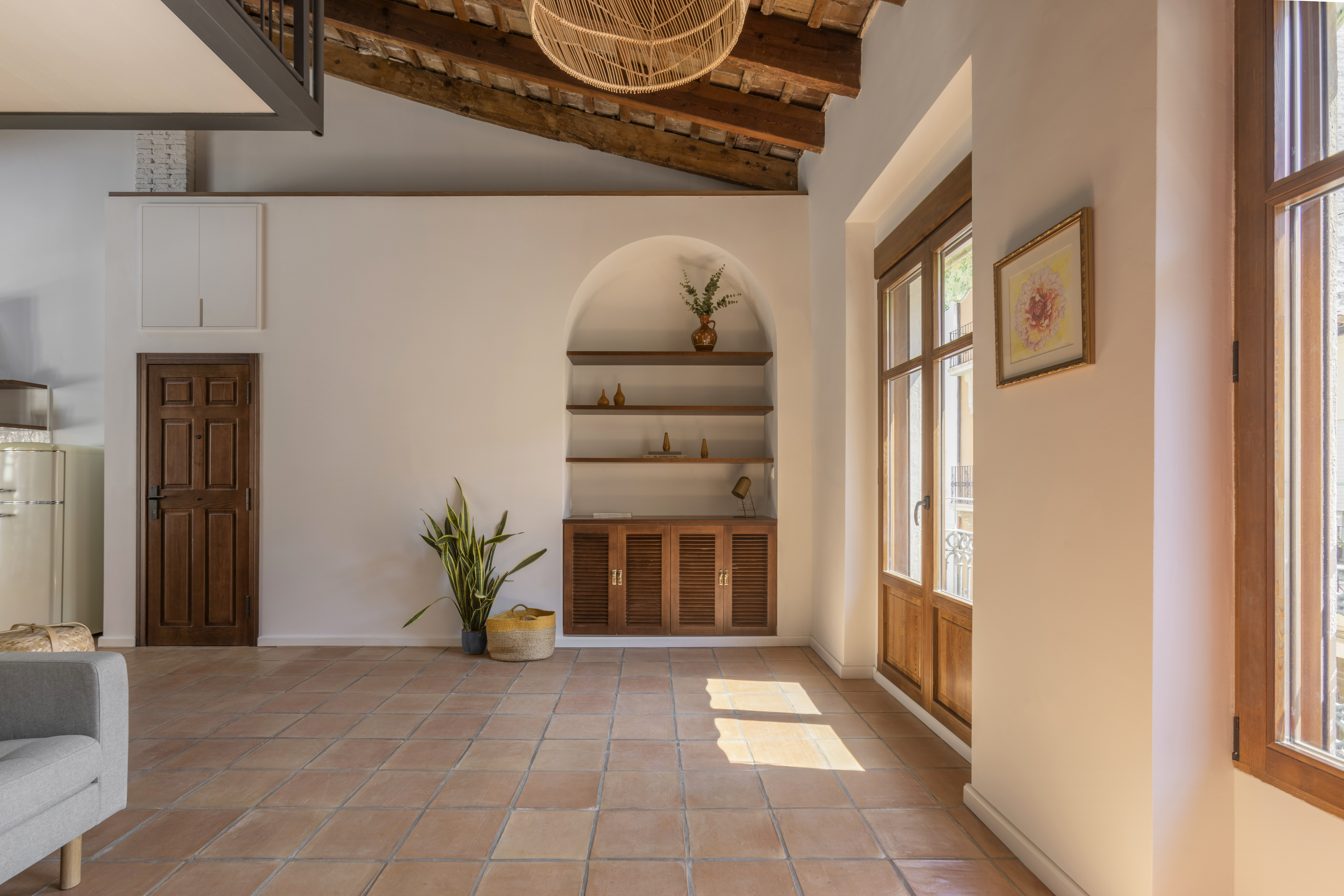 La vivienda contará con un único espacio totalmente diáfano a excepción del volumen del baño. Se proyectará una terraza cubierta abierta al patio interior, con un gran banco de obra a medida, los techos se han recuperado y dejado vistos. Los materiales nuevos se han elegido respetando la esencia del barrio, suelos de barro natural, ventanas de madera y carpintería interior de madera a medida.