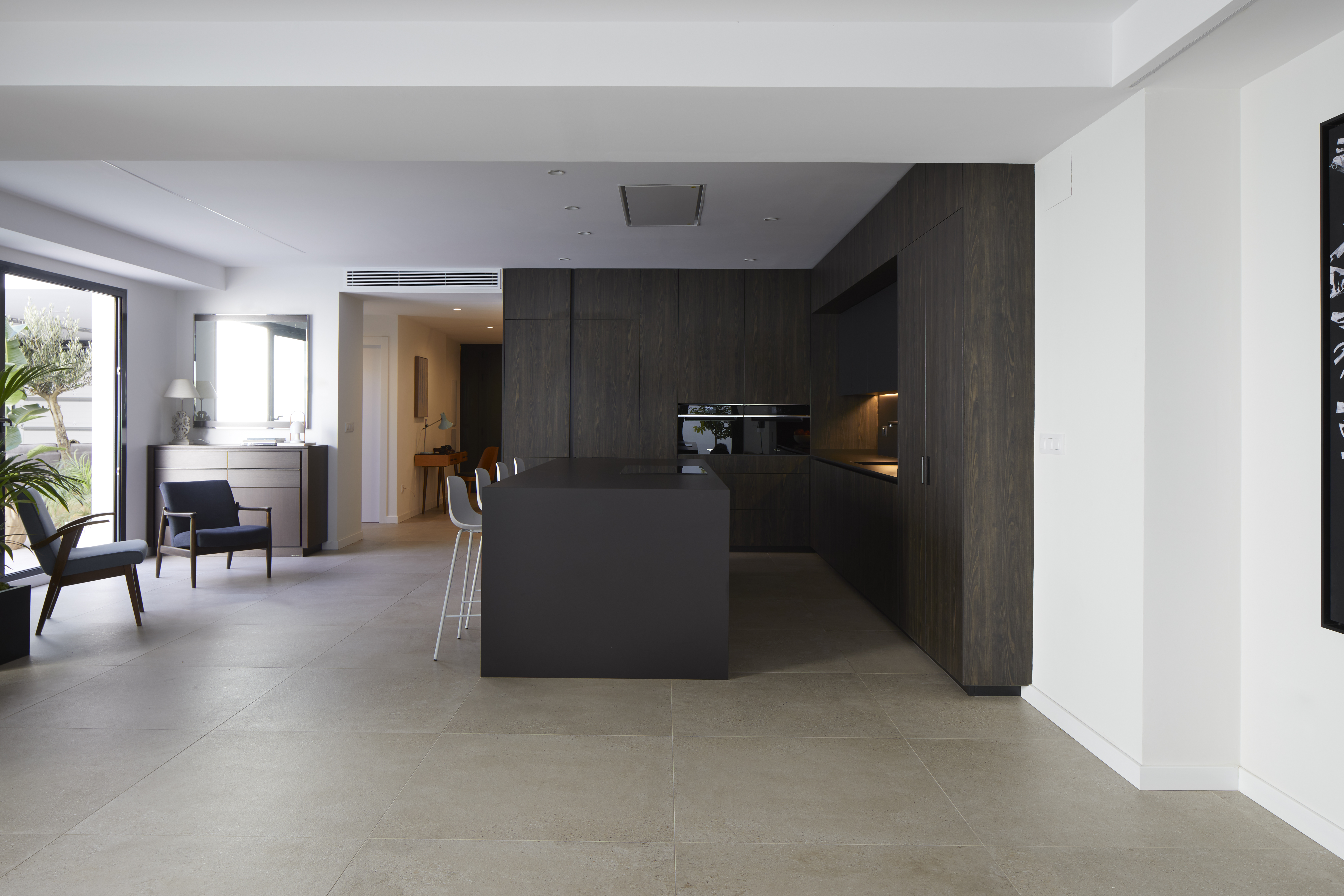 Interiores en líneas sencillas, pavimento rectificado imitación madera y escalera de mármol.